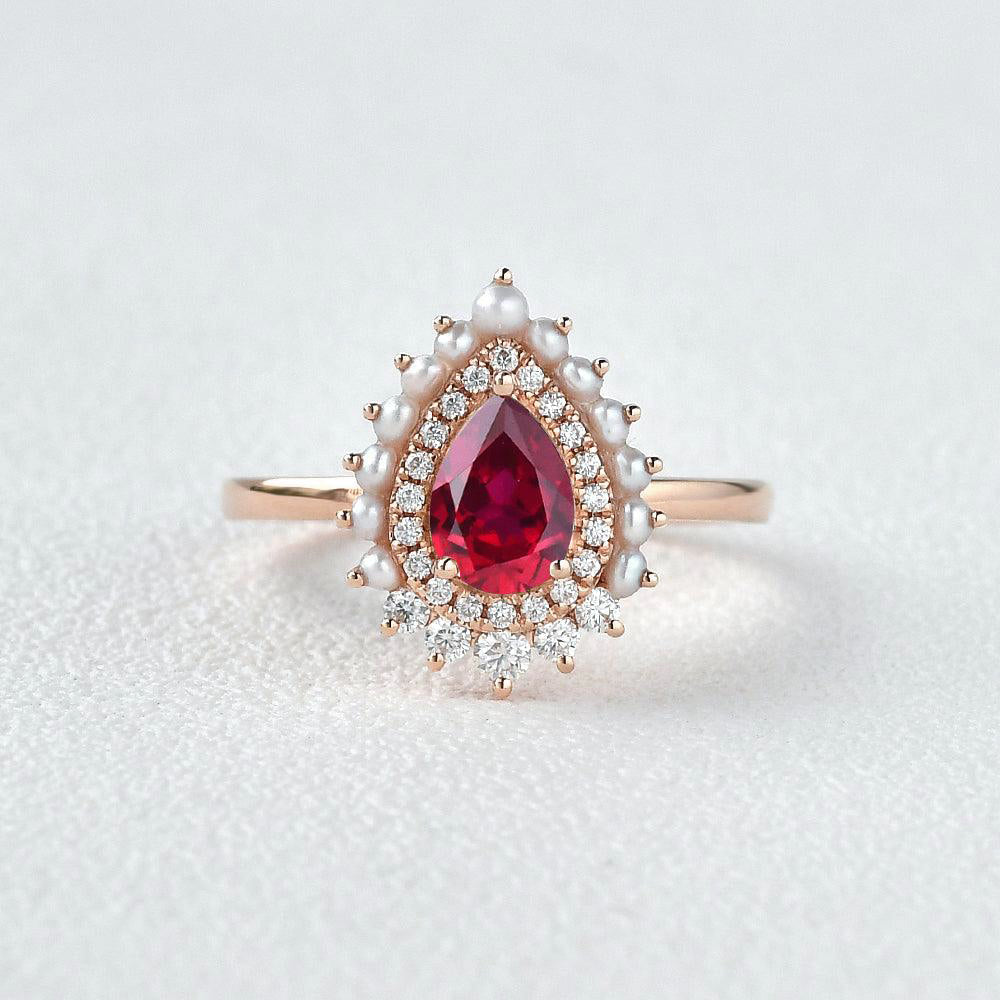 Lab Ruby & Pearls Vintage Inspired Halo Yellow Gold Ring