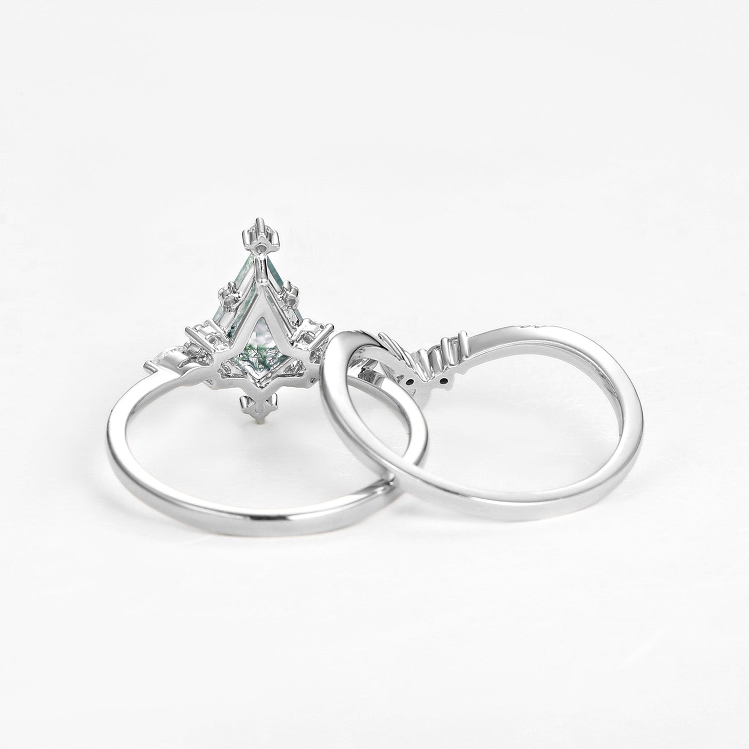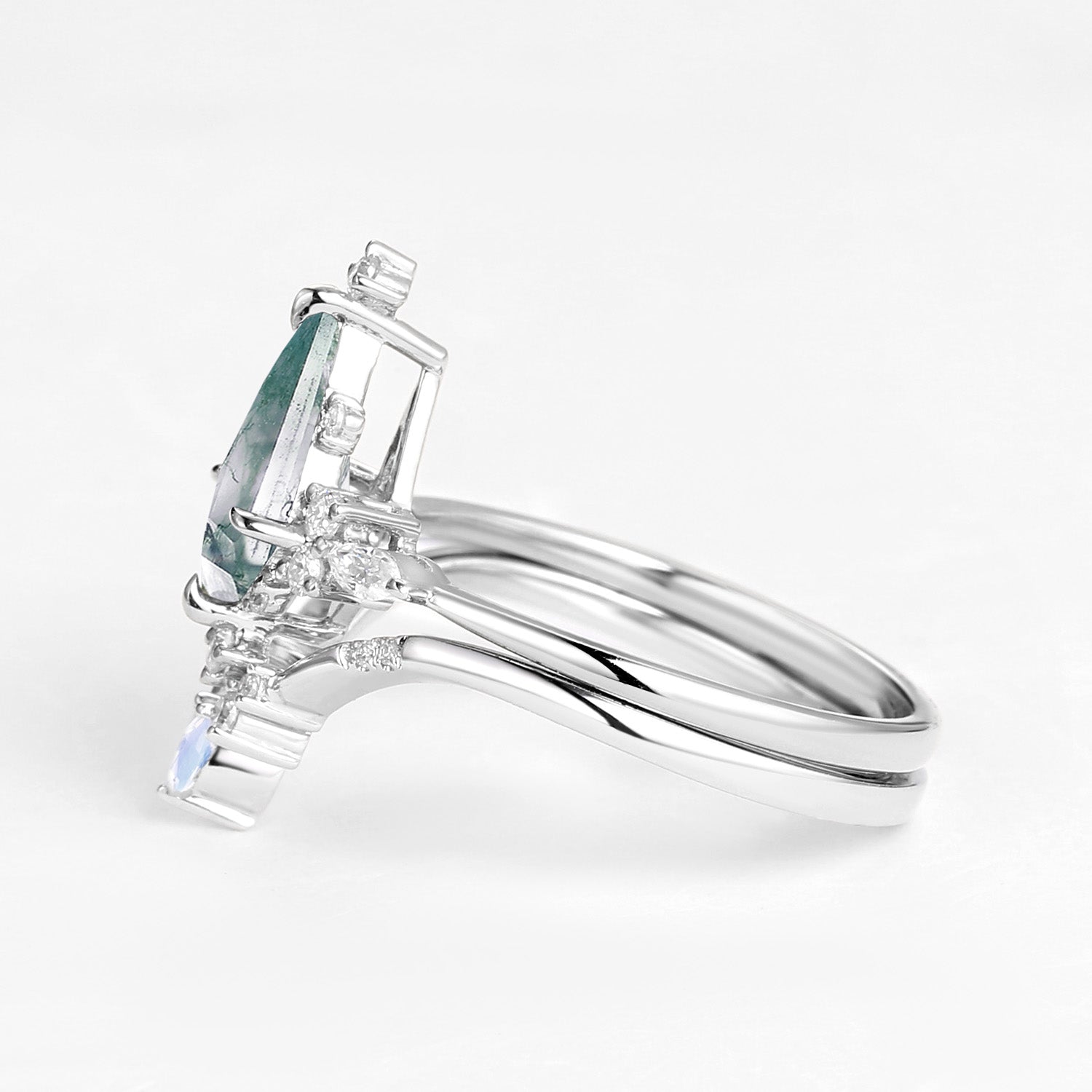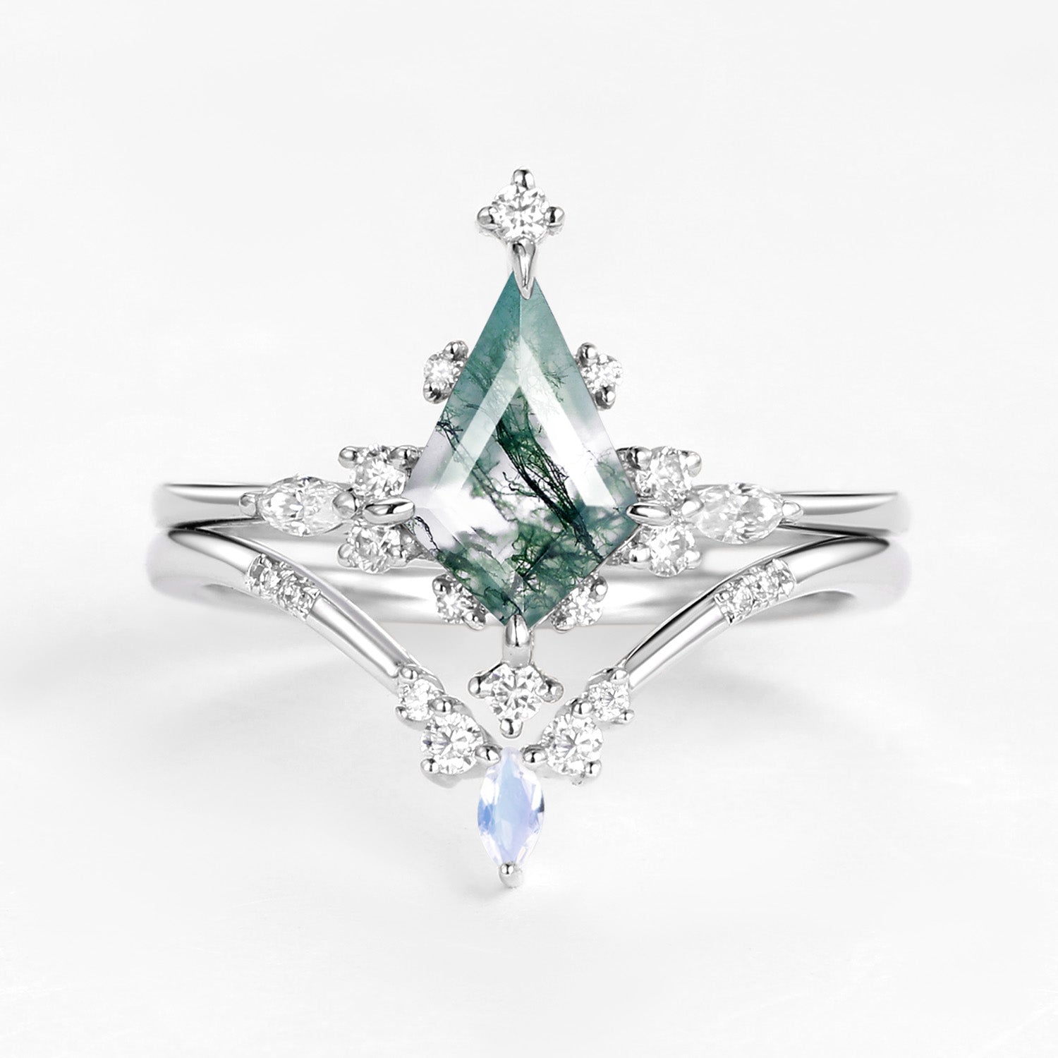 Unique Kite Cut Moss Agate & Moonstone Engagement Ring Sets 2pcs
