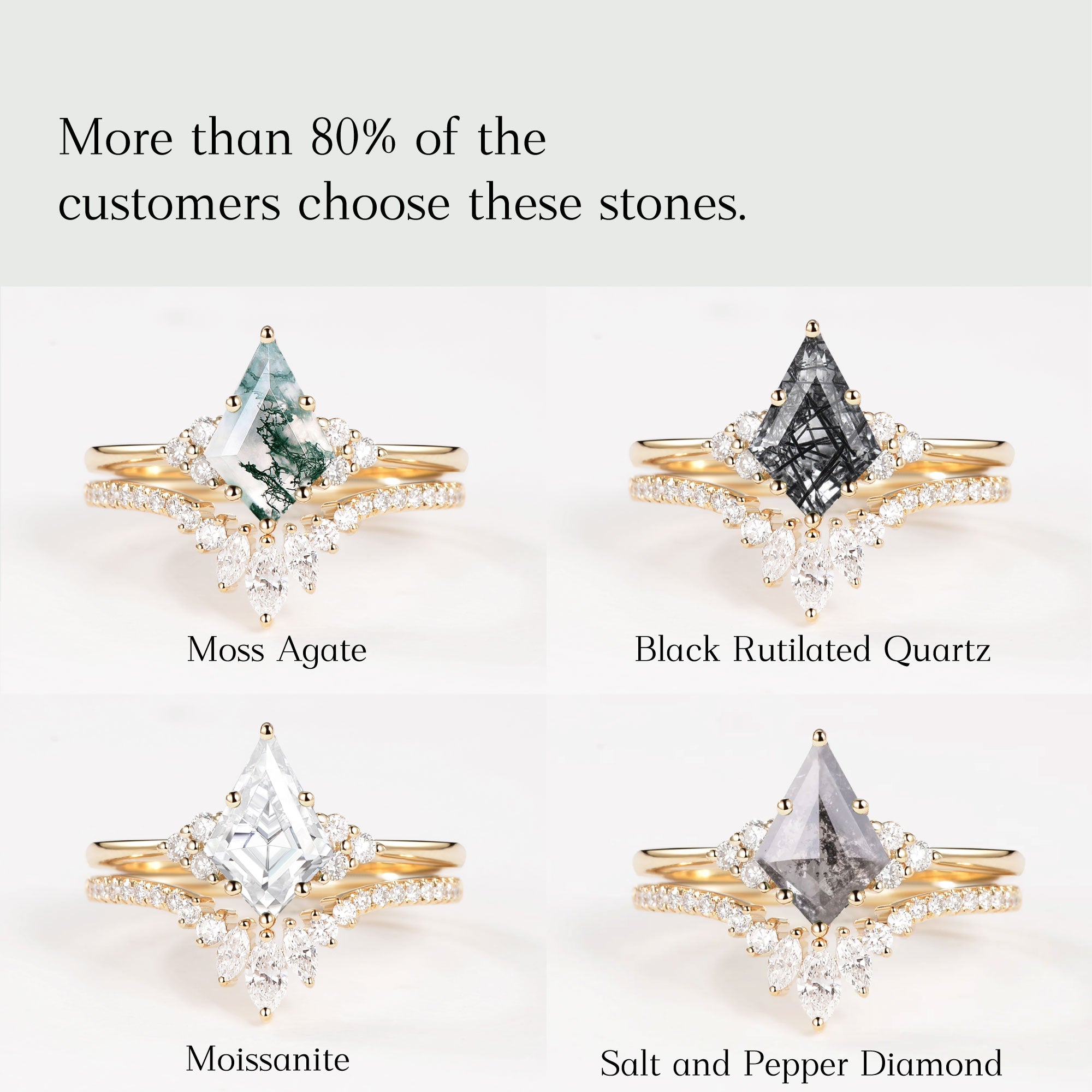 Each moss agate is different, so the gemstones on each different engagement rings are unique! The specific appearance of the gemstones cannot be duplicated because they are natural.