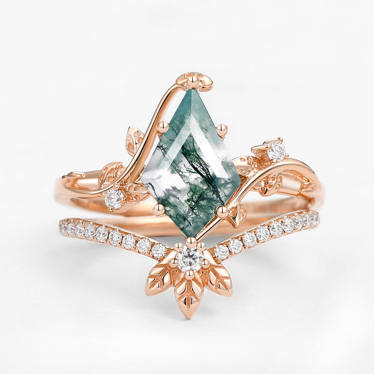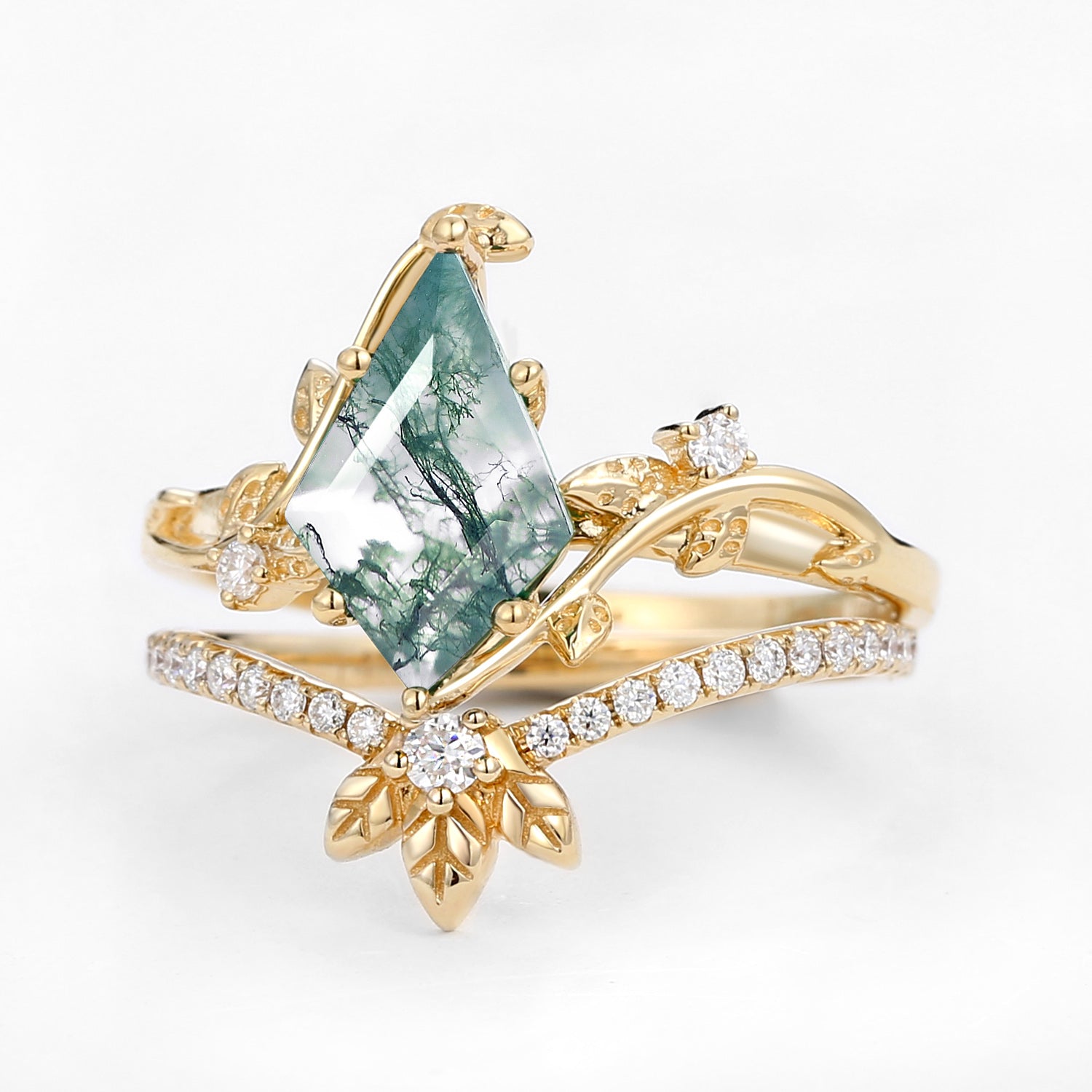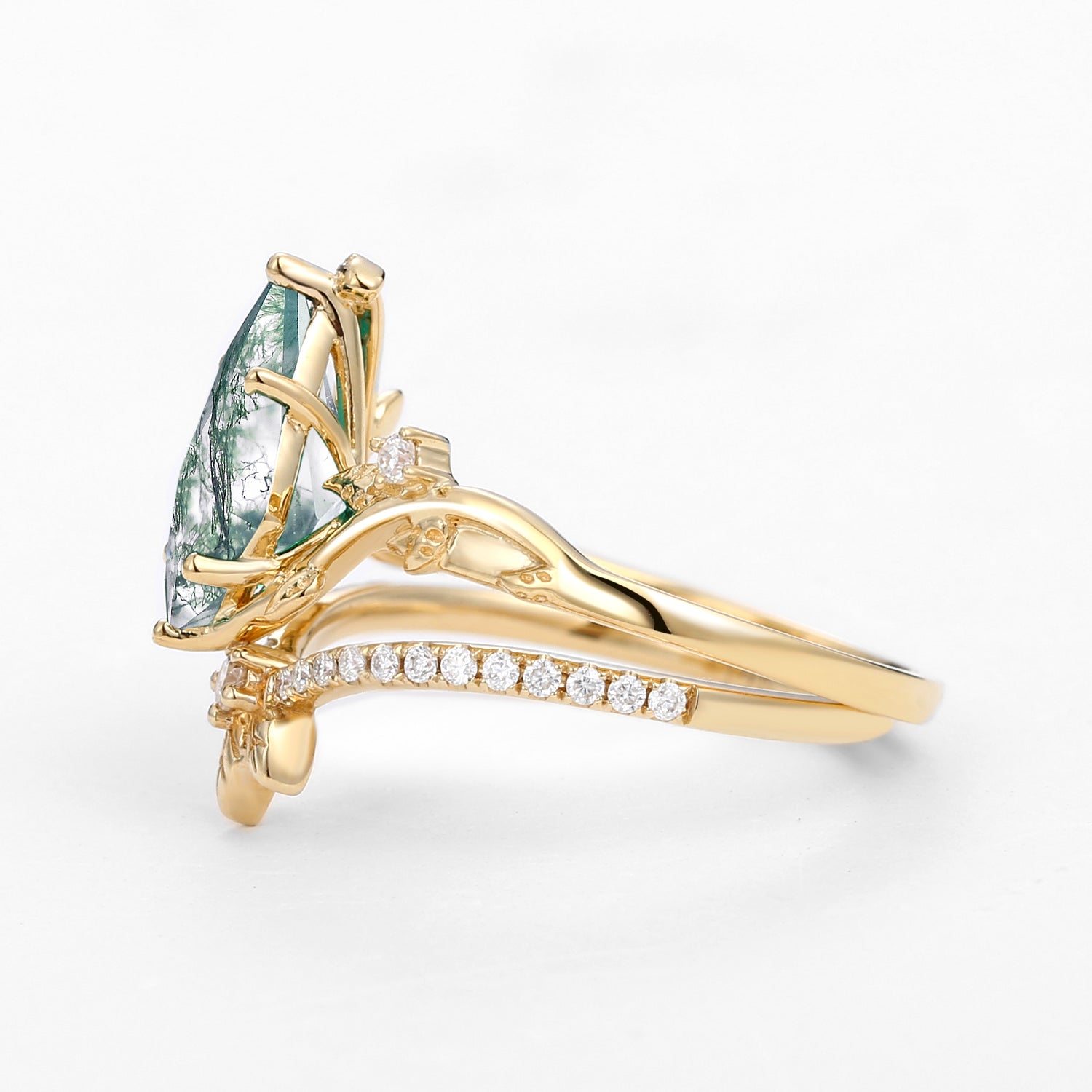 Unique Moss Agate Three Leaves Engagement Ring Set 2pcs - Ella
