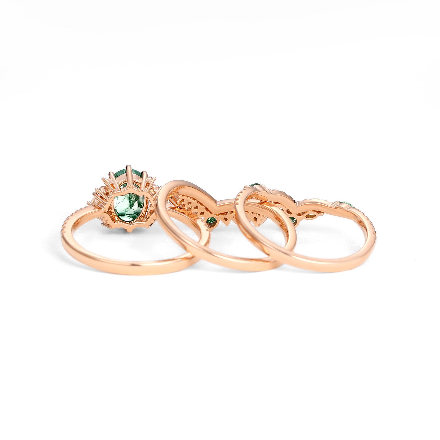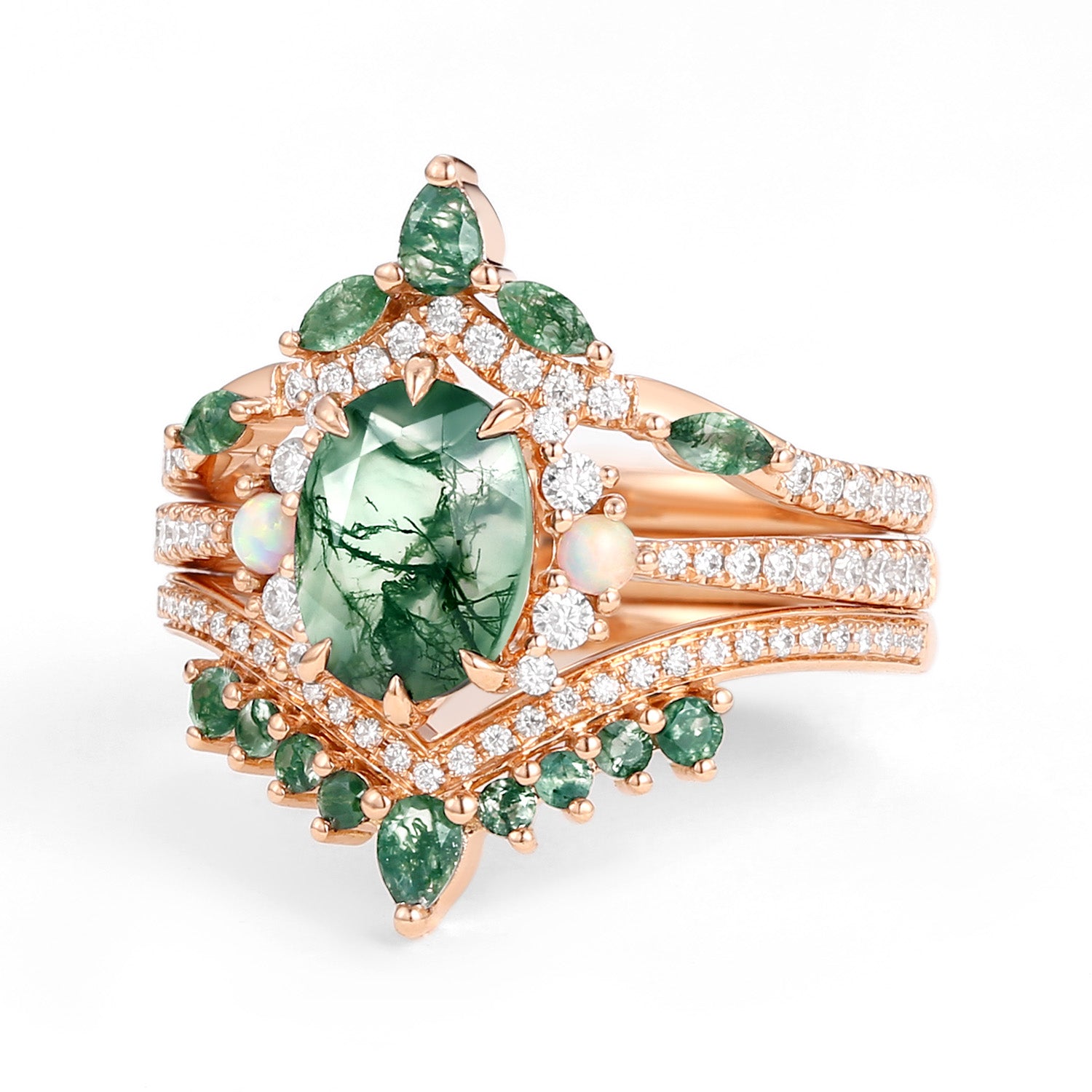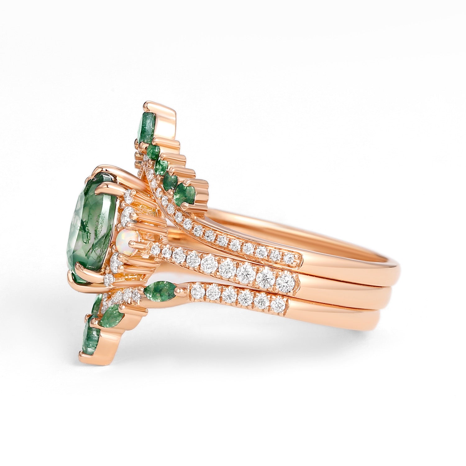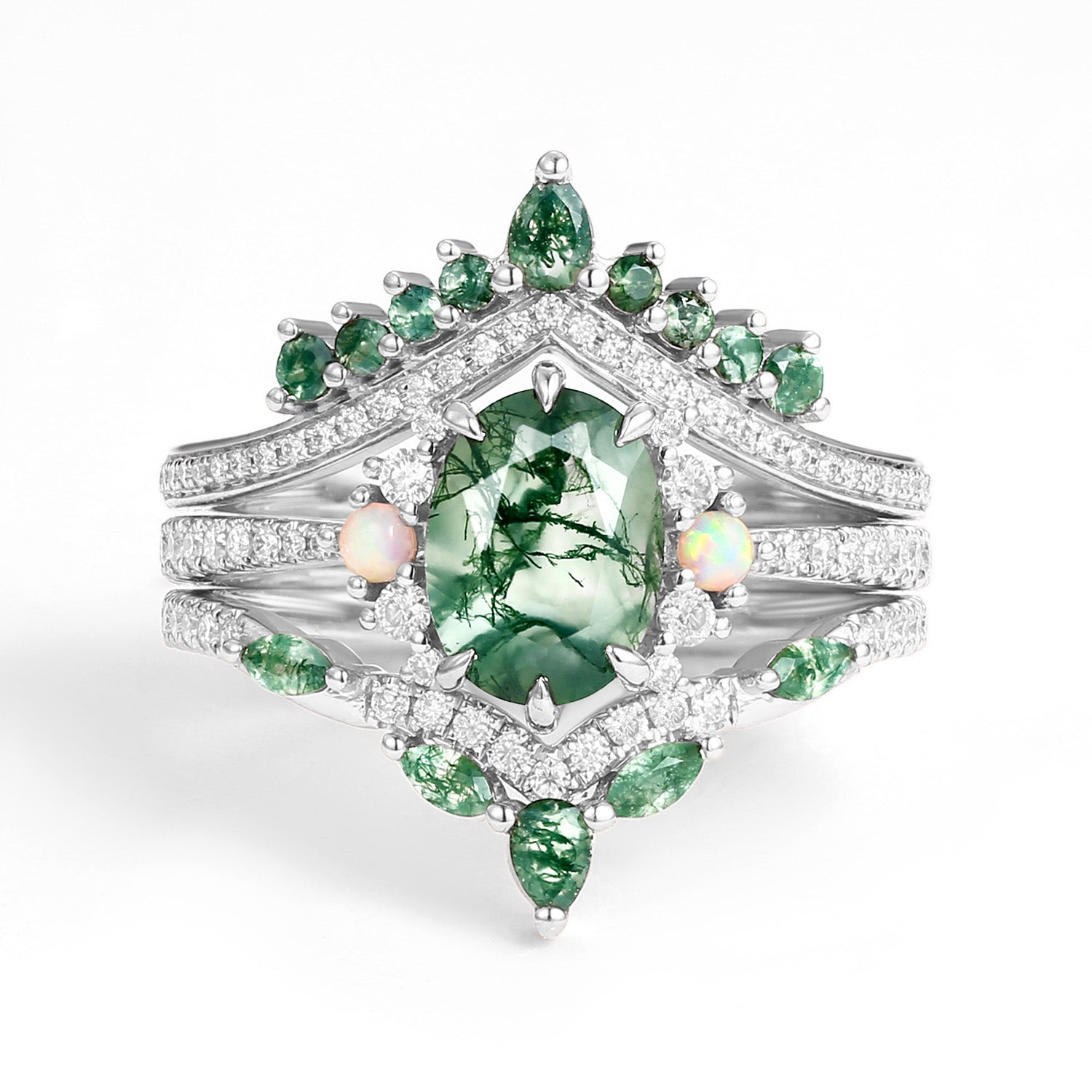 Unique Oval Cut Moss Agate Opal Engagement Ring Set 3pcs - Ethan