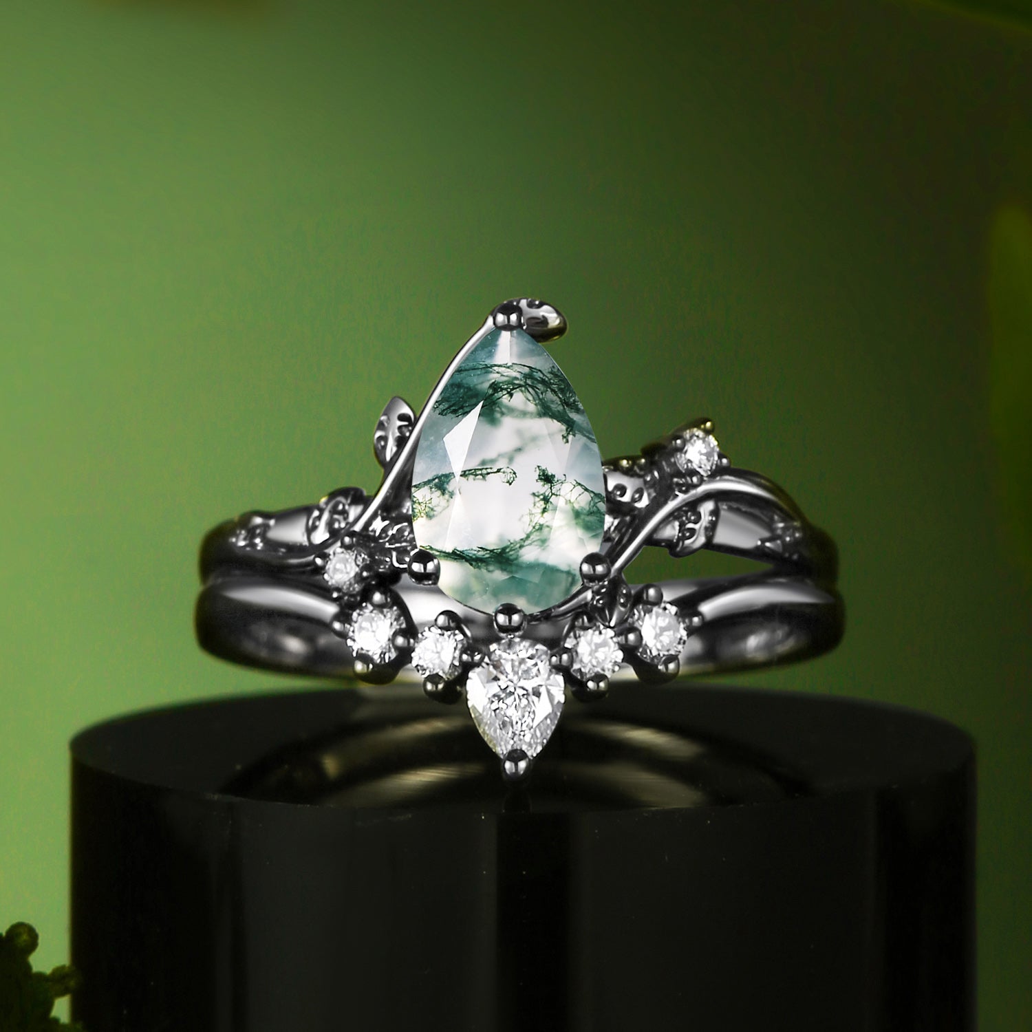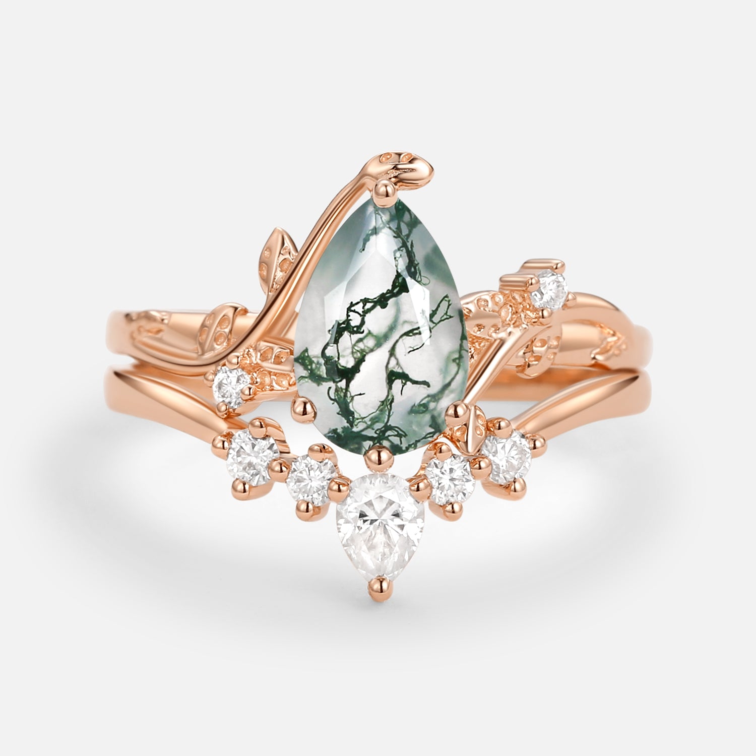 Unique Pear Shaped Moss Agate Leafy Bridal Ring Sets 2pcs - Willow