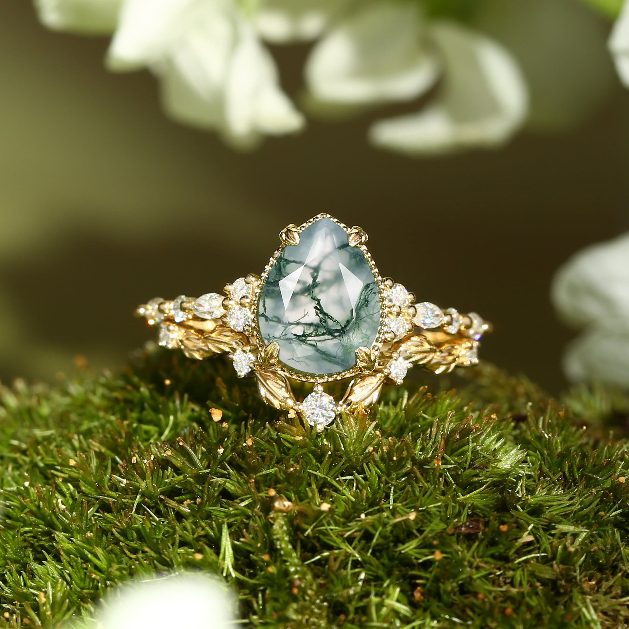 Vintage Pear Shaped Moss Agate Leafy Ring Set 2pcs - Bryony