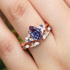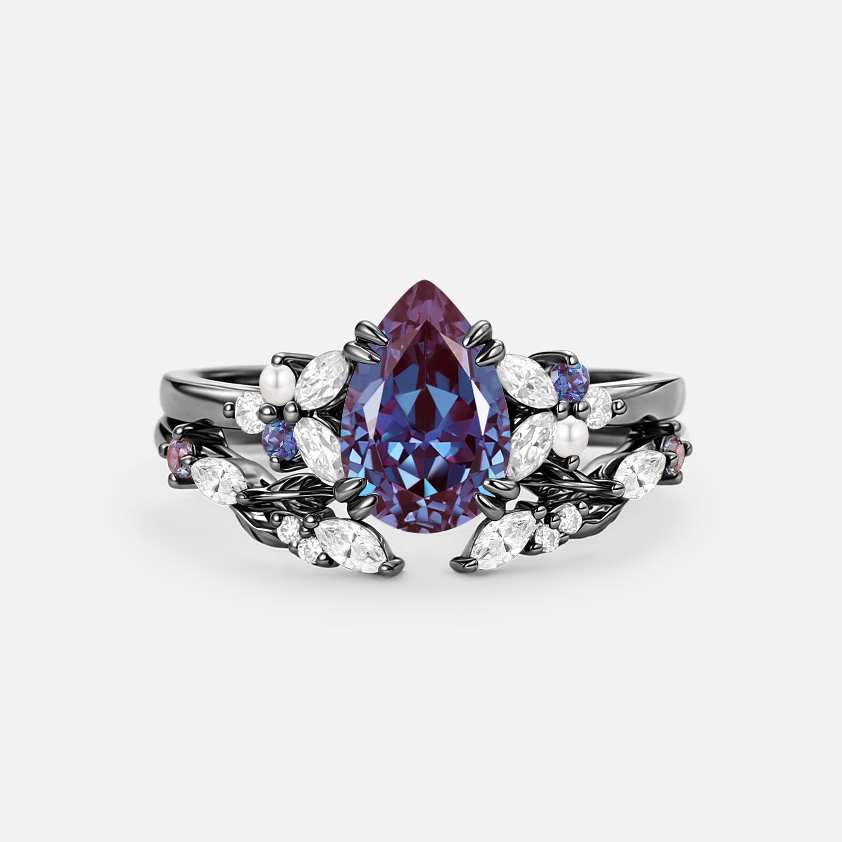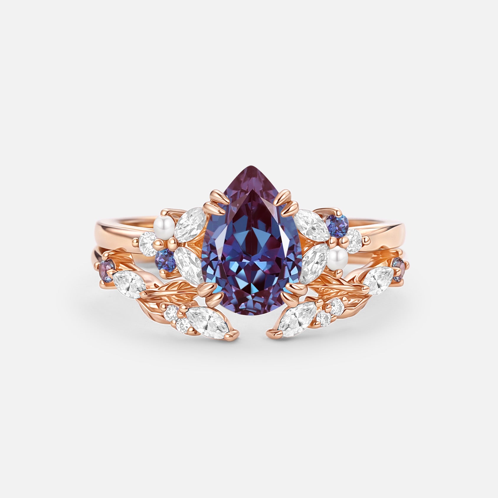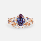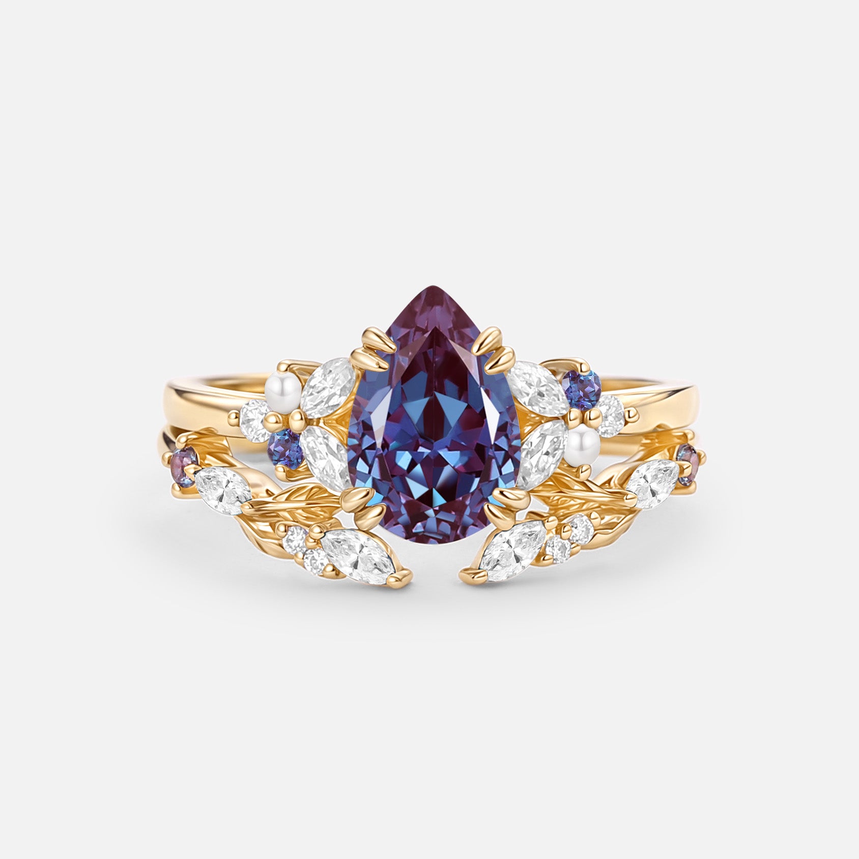 Cluster Pear Shaped Lab Alexandrite Chevron Gold Ring Set 2pcs - Chloris