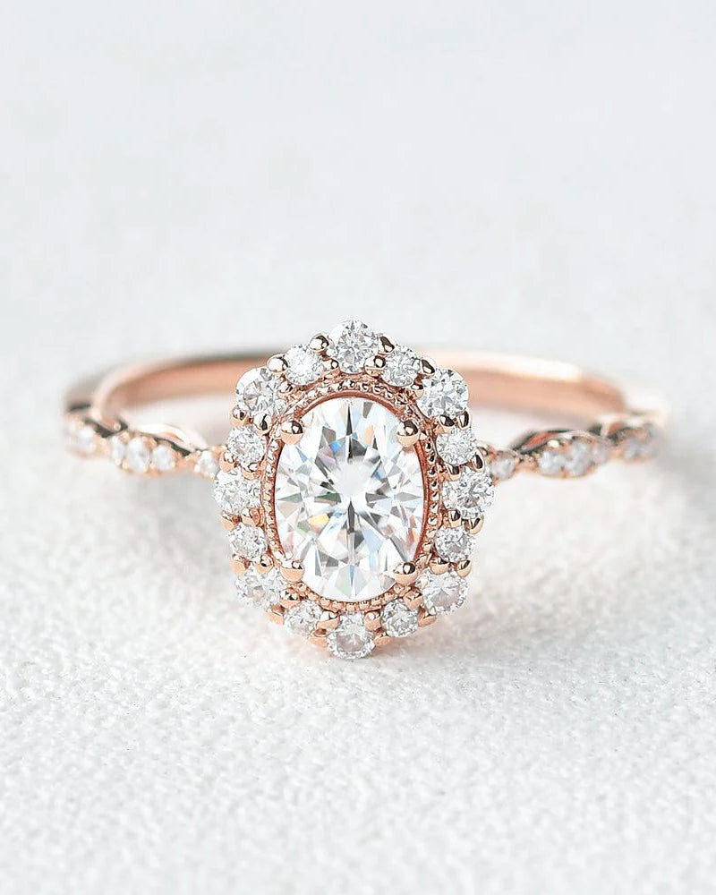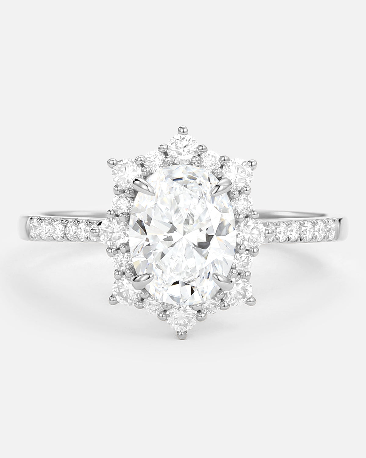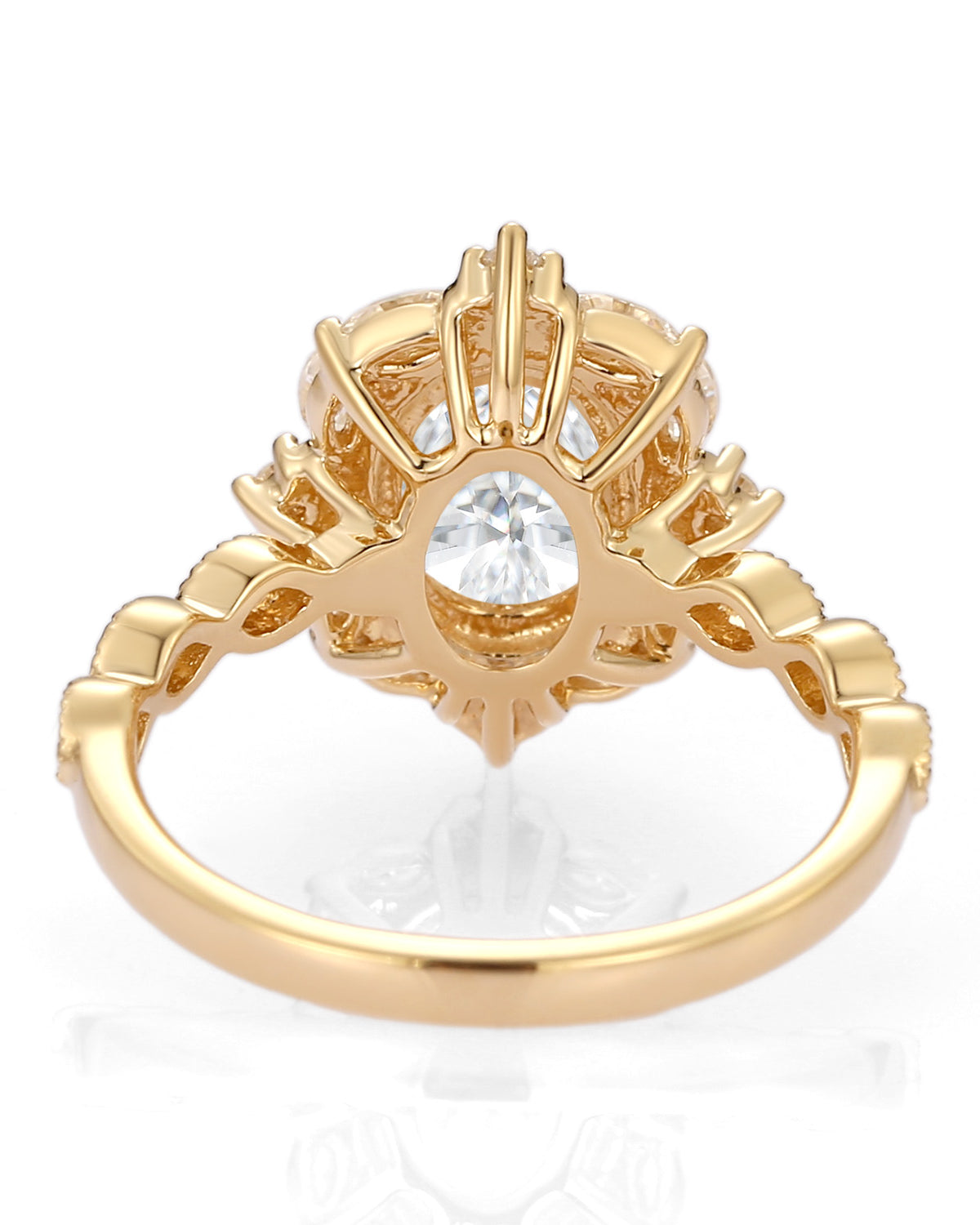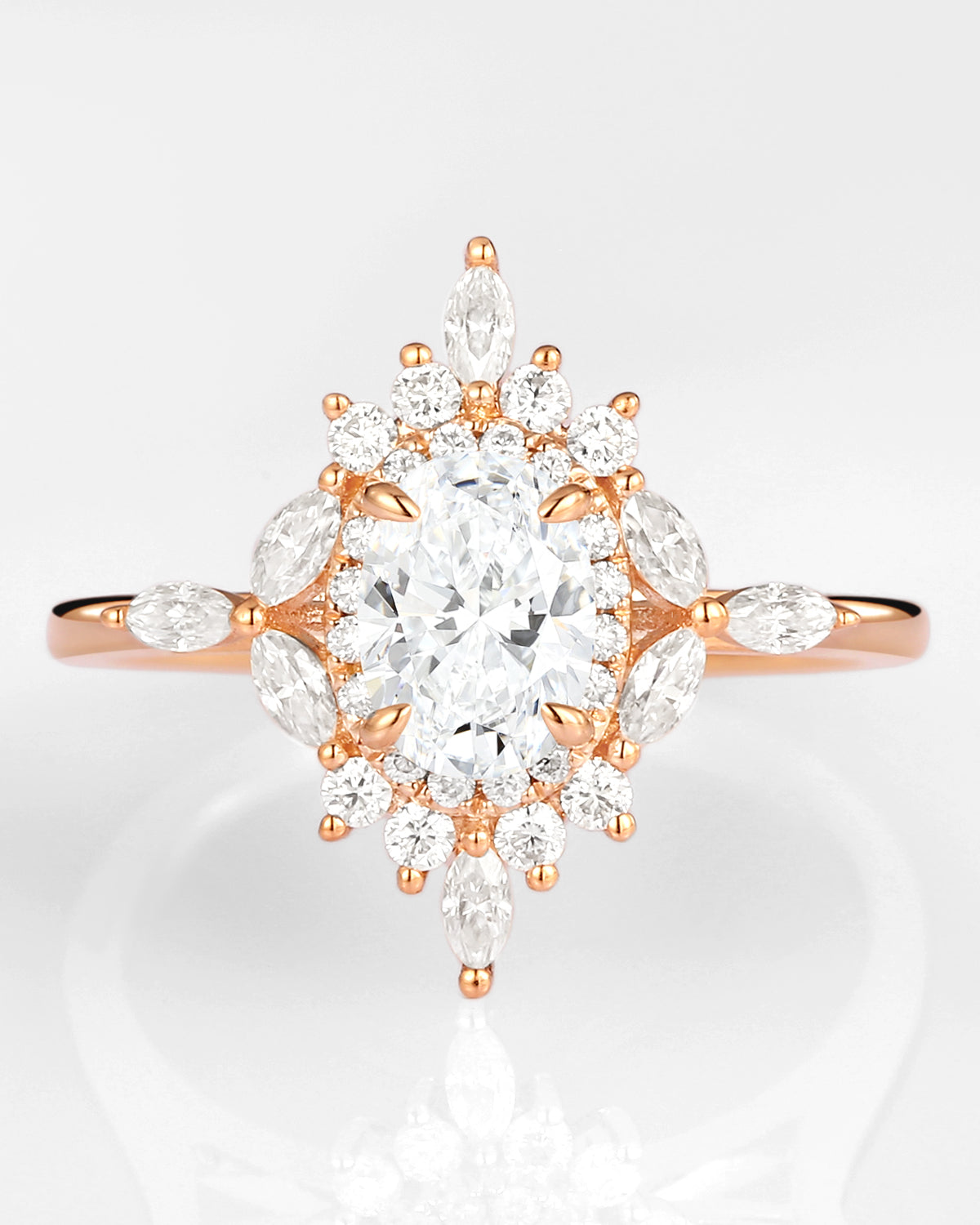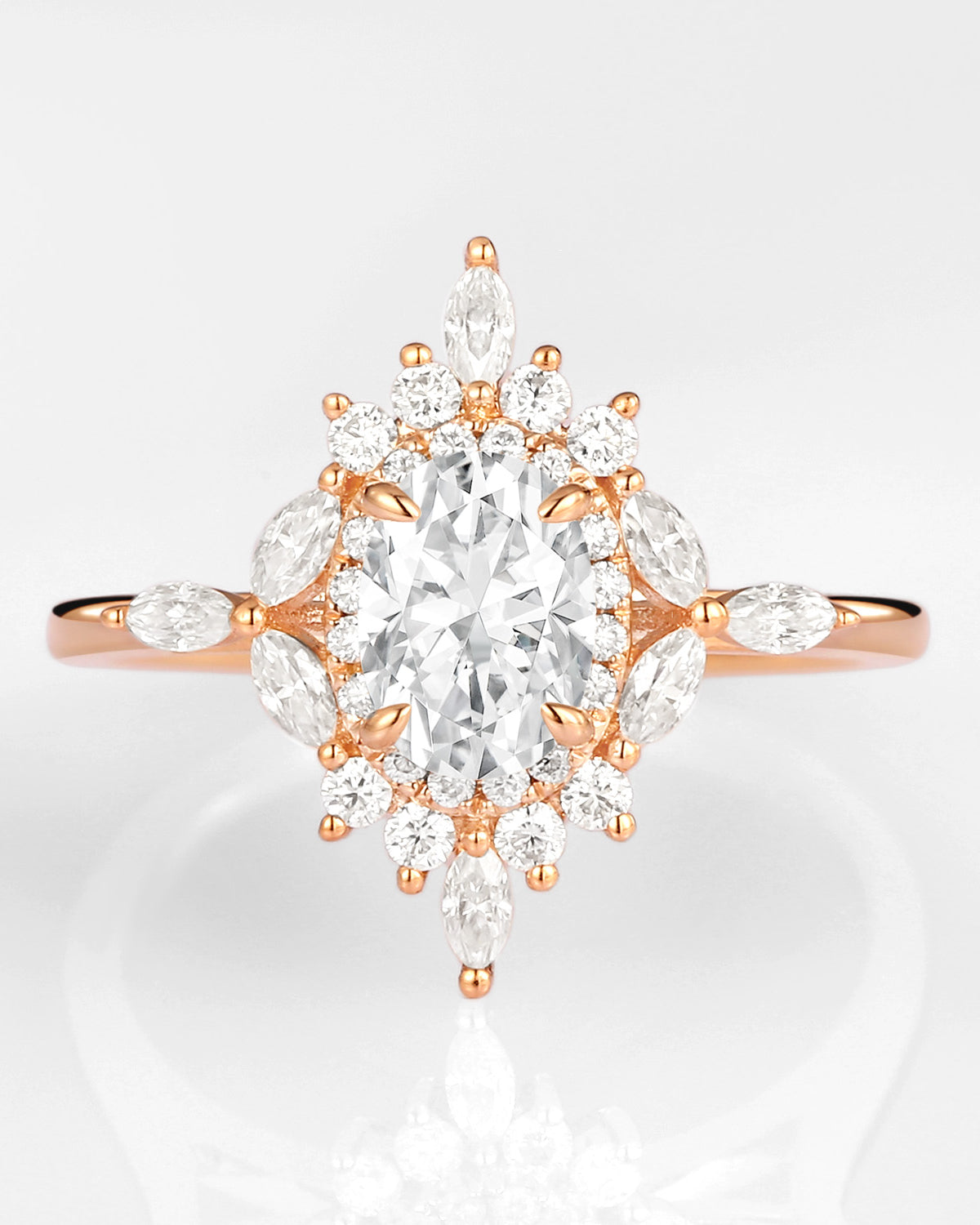 The Enchanted Halo ring features a combination of center stones and small diamonds or gemstones surrounding it, creating a halo effect that resembles a radiant aura. Countless small diamonds are clustered around the main stone, making it appear larger and more dazzling, while also adding to the overall brilliance and grandeur of halo moissanite engagement rings. Felicegals's halo moissanite ring design is delicate and harmonious, showcasing an elegant and refined style. Legend has it that during a solar eclipse, young couples make wishes, and their love will be blessed by the gods. The halo ring has become a guardian of love.