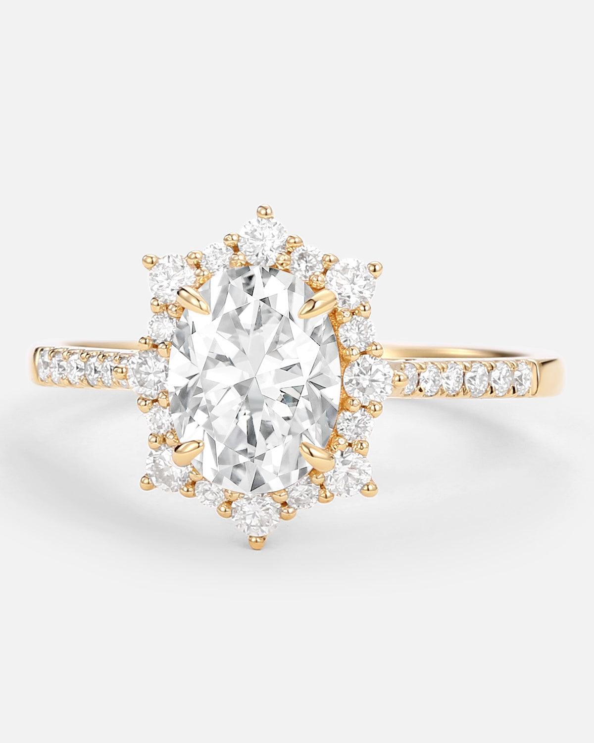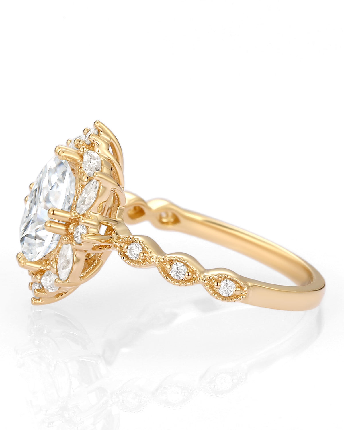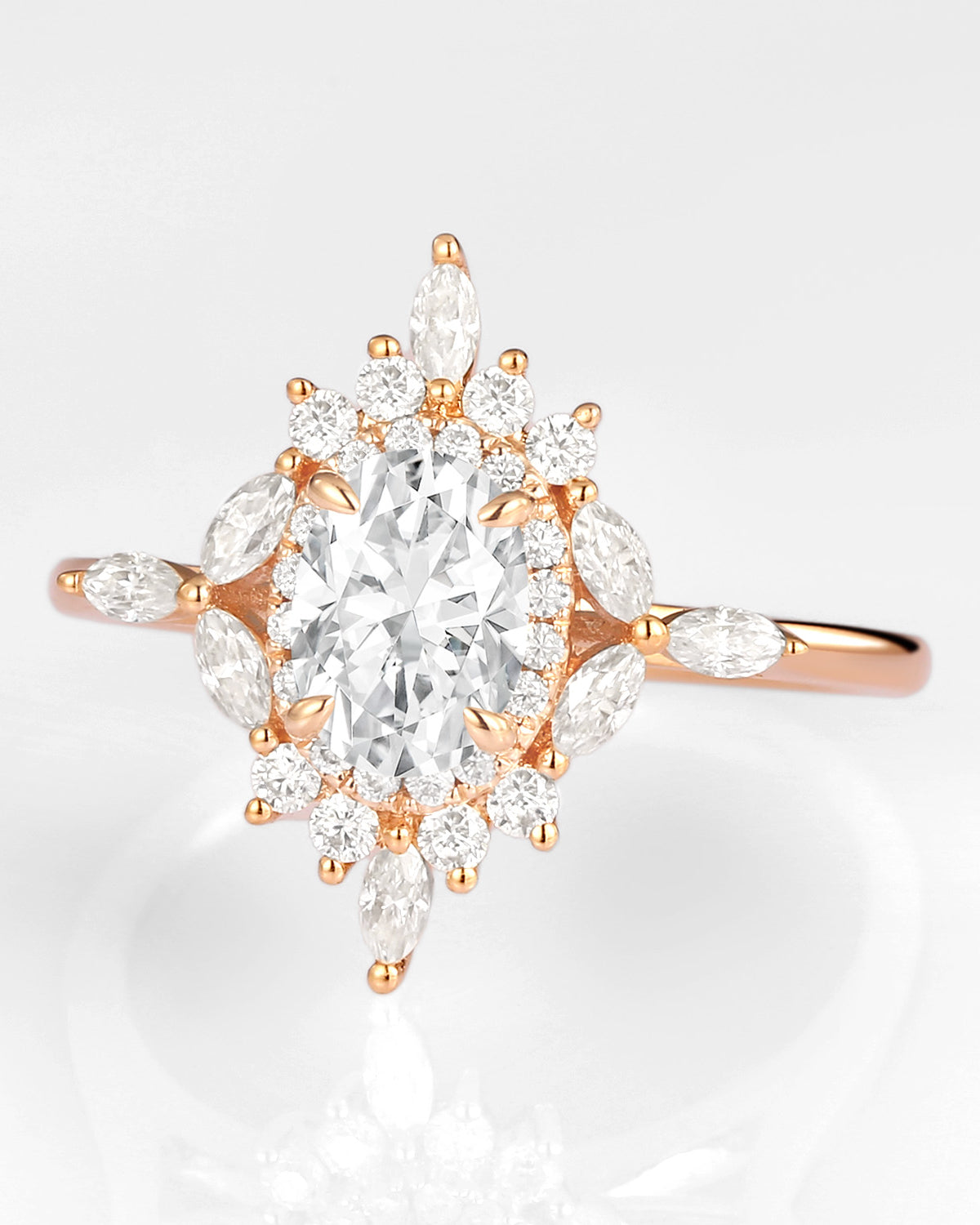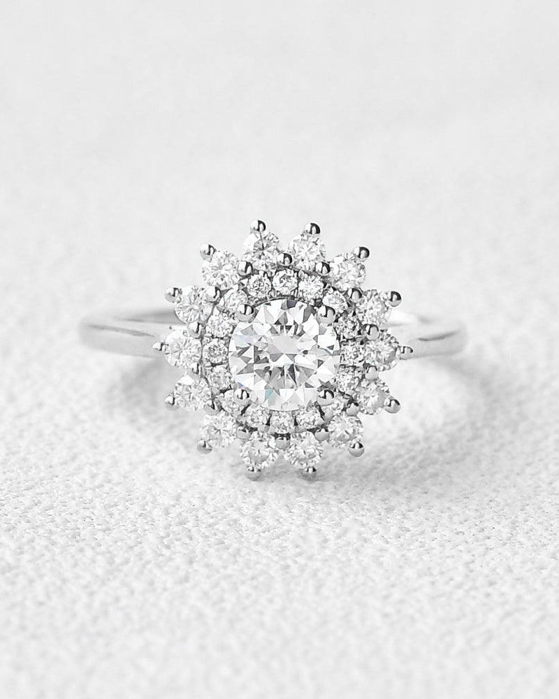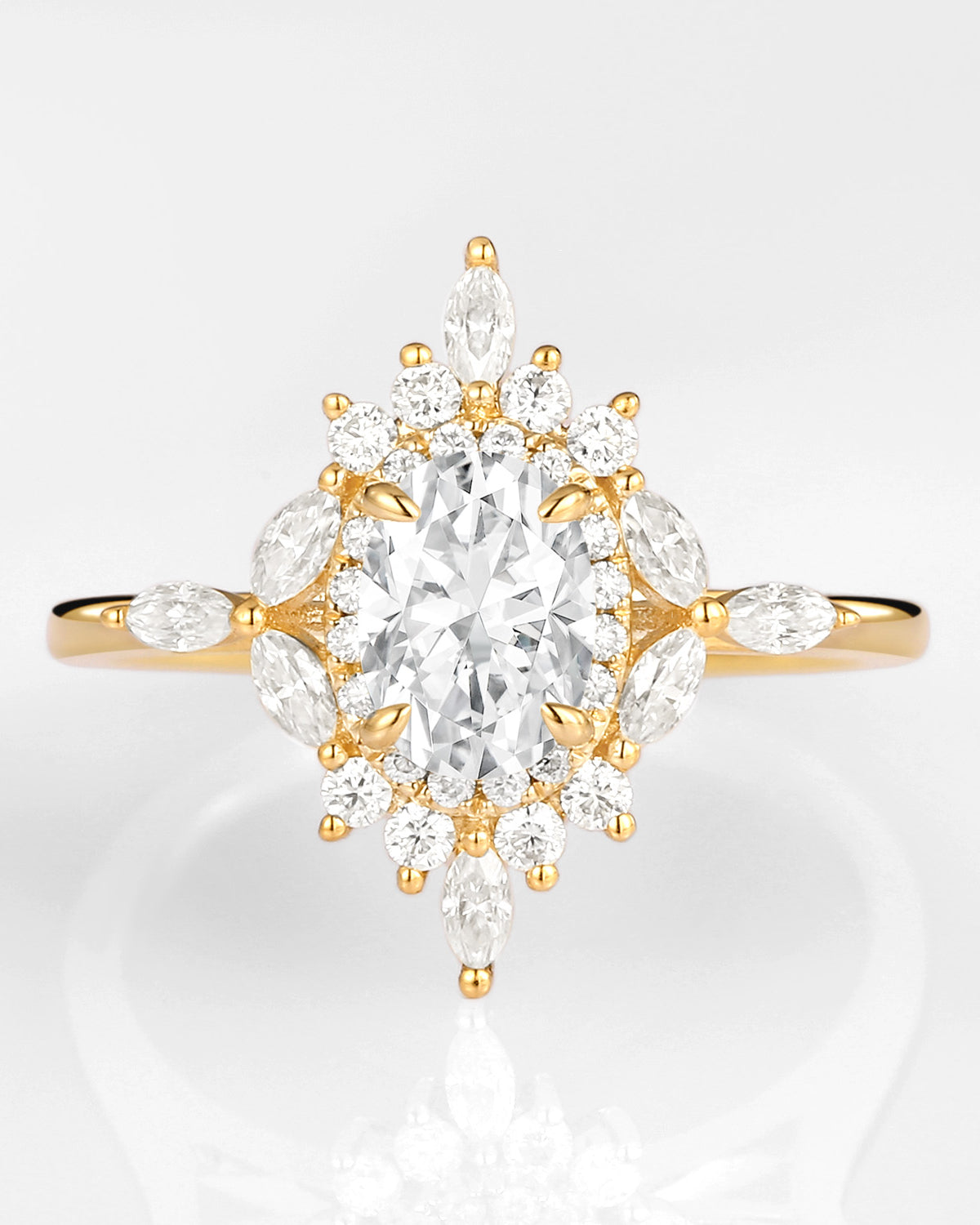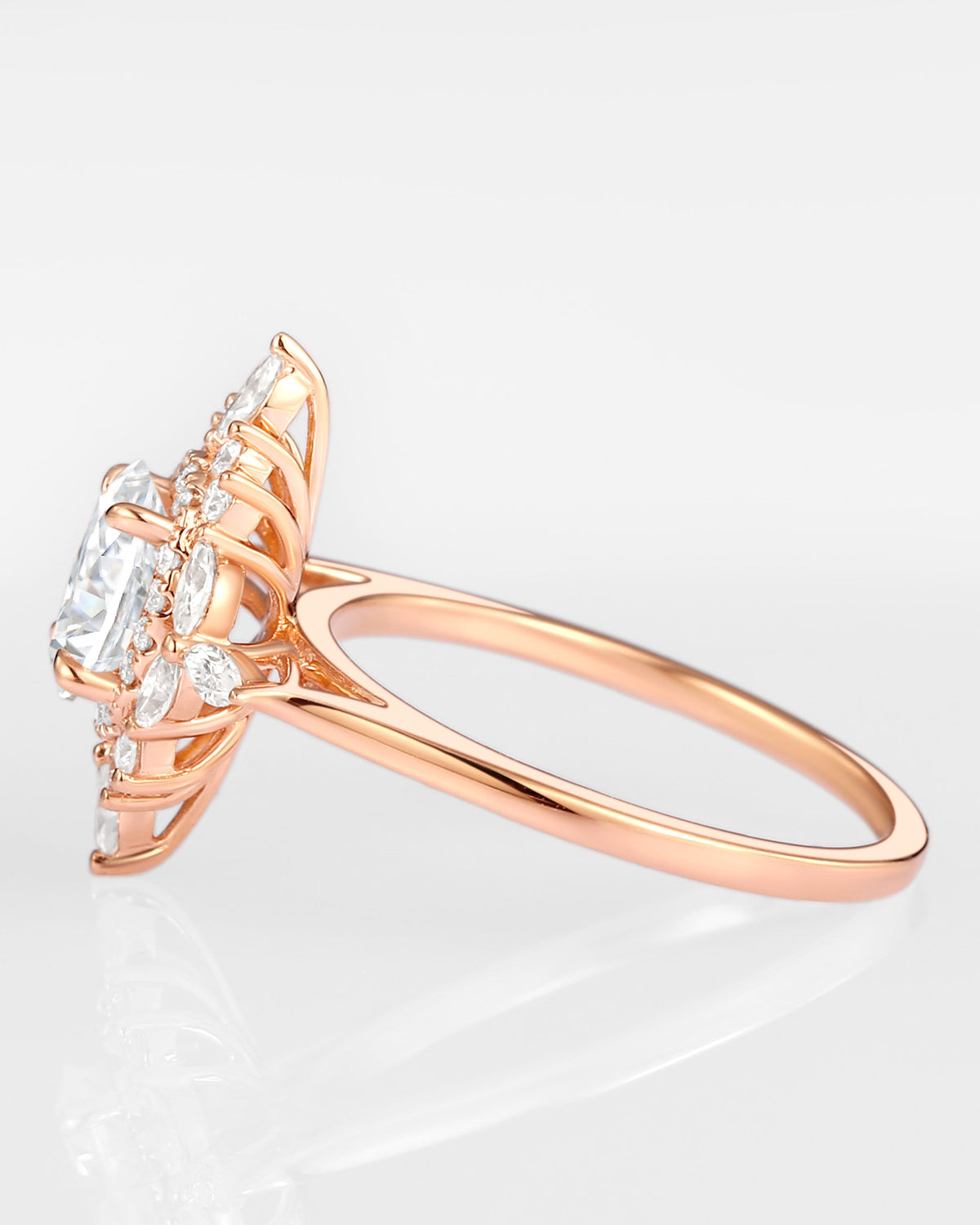 The Enchanted Halo ring features a combination of center stones and small diamonds or gemstones surrounding it, creating a halo effect that resembles a radiant aura. Countless small diamonds are clustered around the main stone, making it appear larger and more dazzling, while also adding to the overall brilliance and grandeur of halo moissanite engagement rings. Felicegals's halo moissanite ring design is delicate and harmonious, showcasing an elegant and refined style. Legend has it that during a solar eclipse, young couples make wishes, and their love will be blessed by the gods. The halo ring has become a guardian of love.