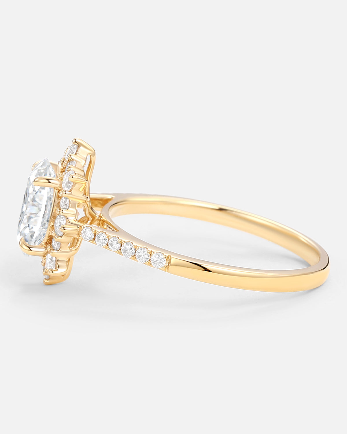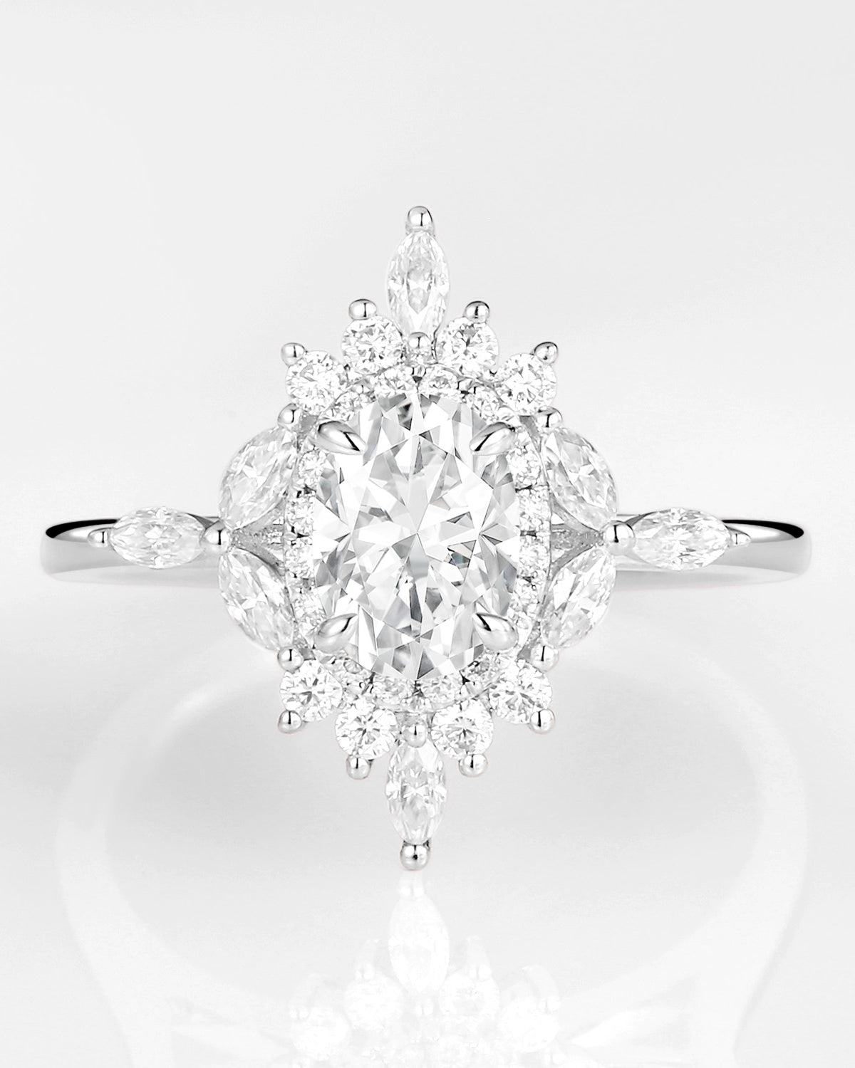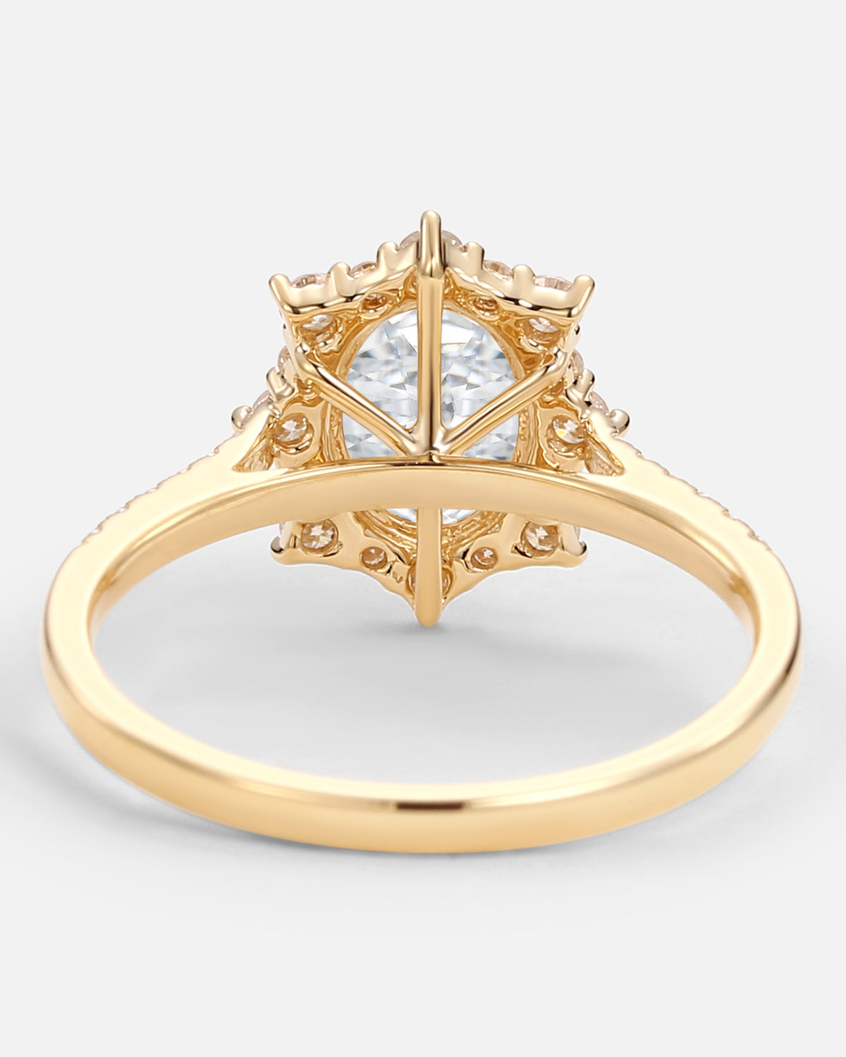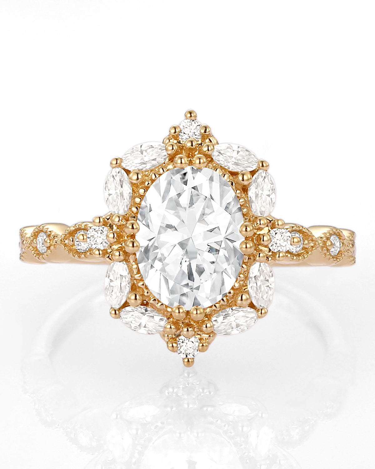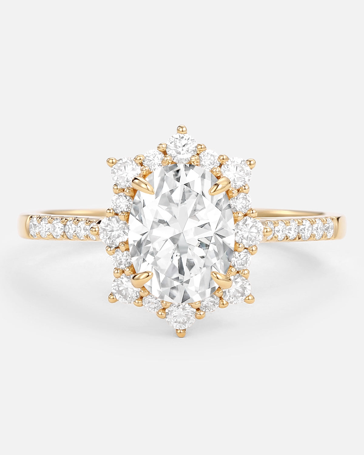The Enchanted Halo ring features a combination of center stones and small diamonds or gemstones surrounding it, creating a halo effect that resembles a radiant aura. Countless small diamonds are clustered around the main stone, making it appear larger and more dazzling, while also adding to the overall brilliance and grandeur of halo moissanite engagement rings. Felicegals's halo moissanite ring design is delicate and harmonious, showcasing an elegant and refined style. Legend has it that during a solar eclipse, young couples make wishes, and their love will be blessed by the gods. The halo ring has become a guardian of love.