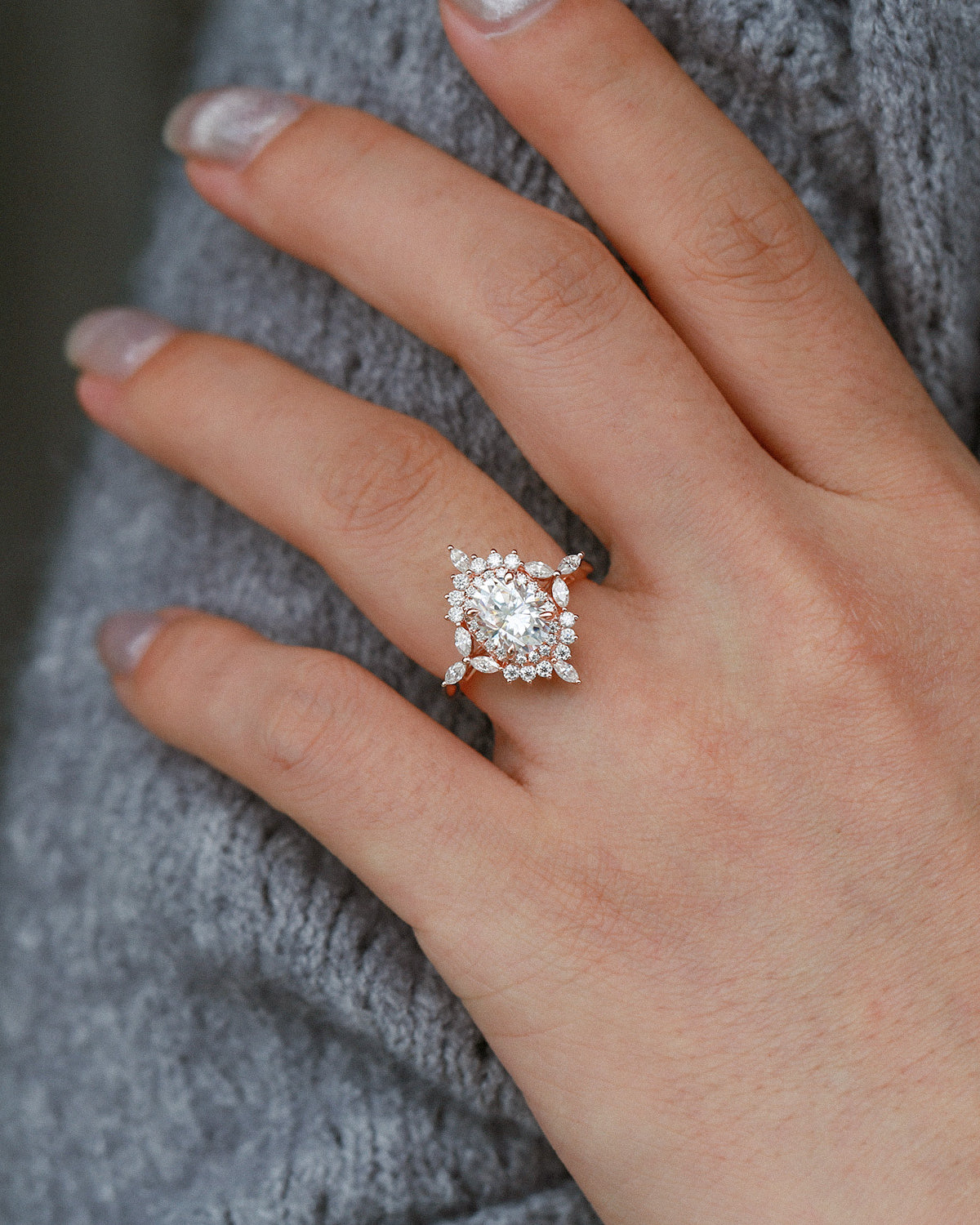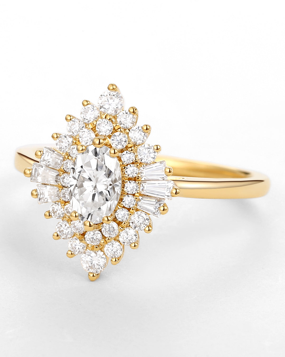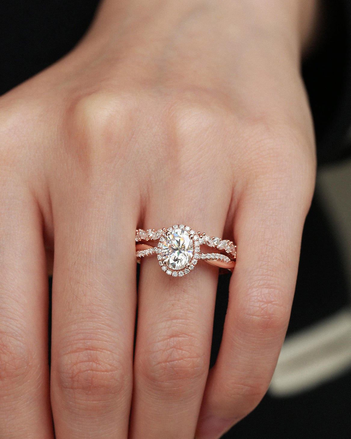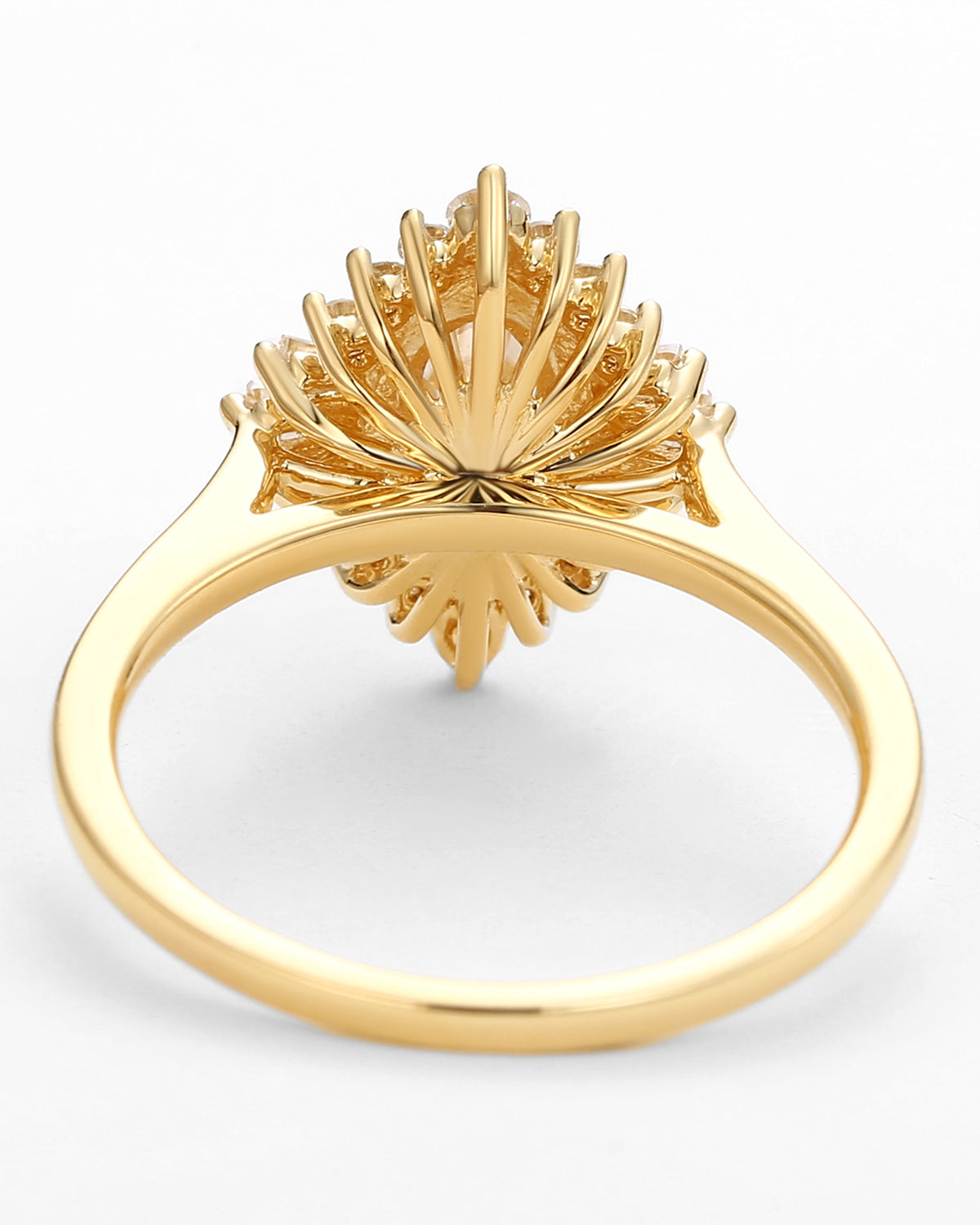 The Enchanted Halo ring features a combination of center stones and small diamonds or gemstones surrounding it, creating a halo effect that resembles a radiant aura. Countless small diamonds are clustered around the main stone, making it appear larger and more dazzling, while also adding to the overall brilliance and grandeur of halo moissanite engagement rings. Felicegals's halo moissanite ring design is delicate and harmonious, showcasing an elegant and refined style. Legend has it that during a solar eclipse, young couples make wishes, and their love will be blessed by the gods. The halo ring has become a guardian of love.