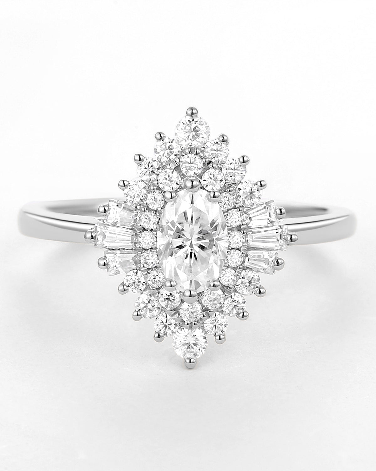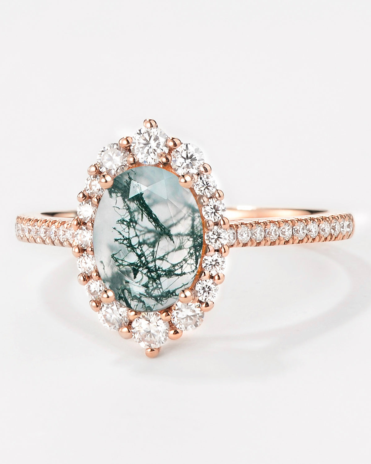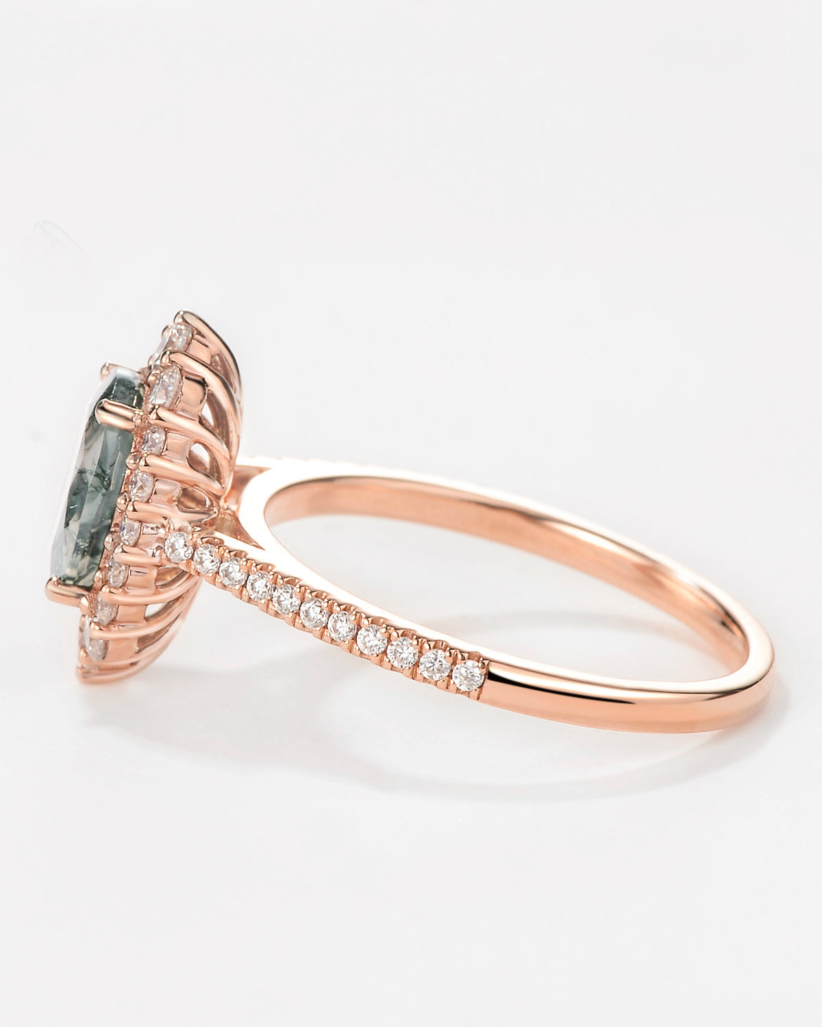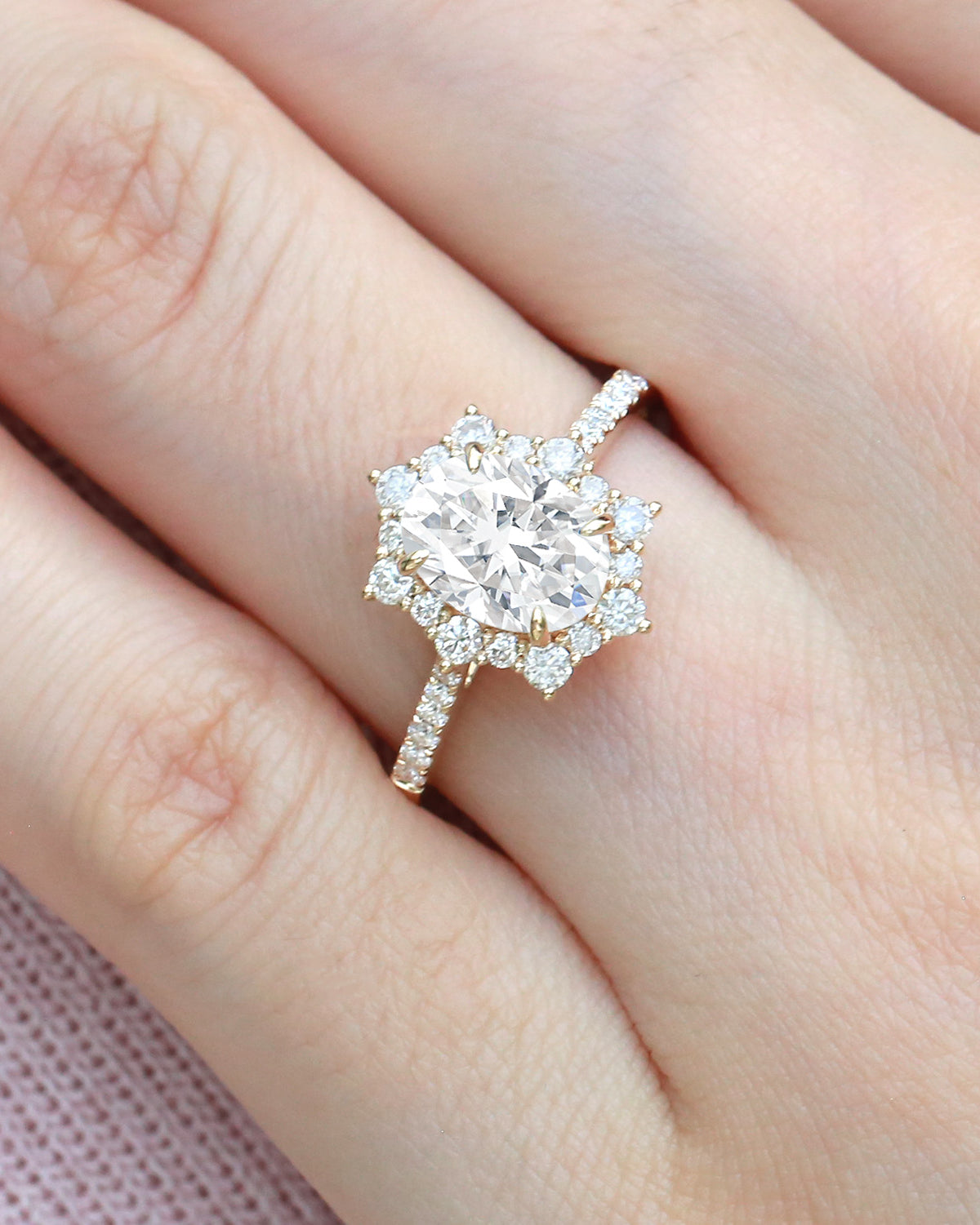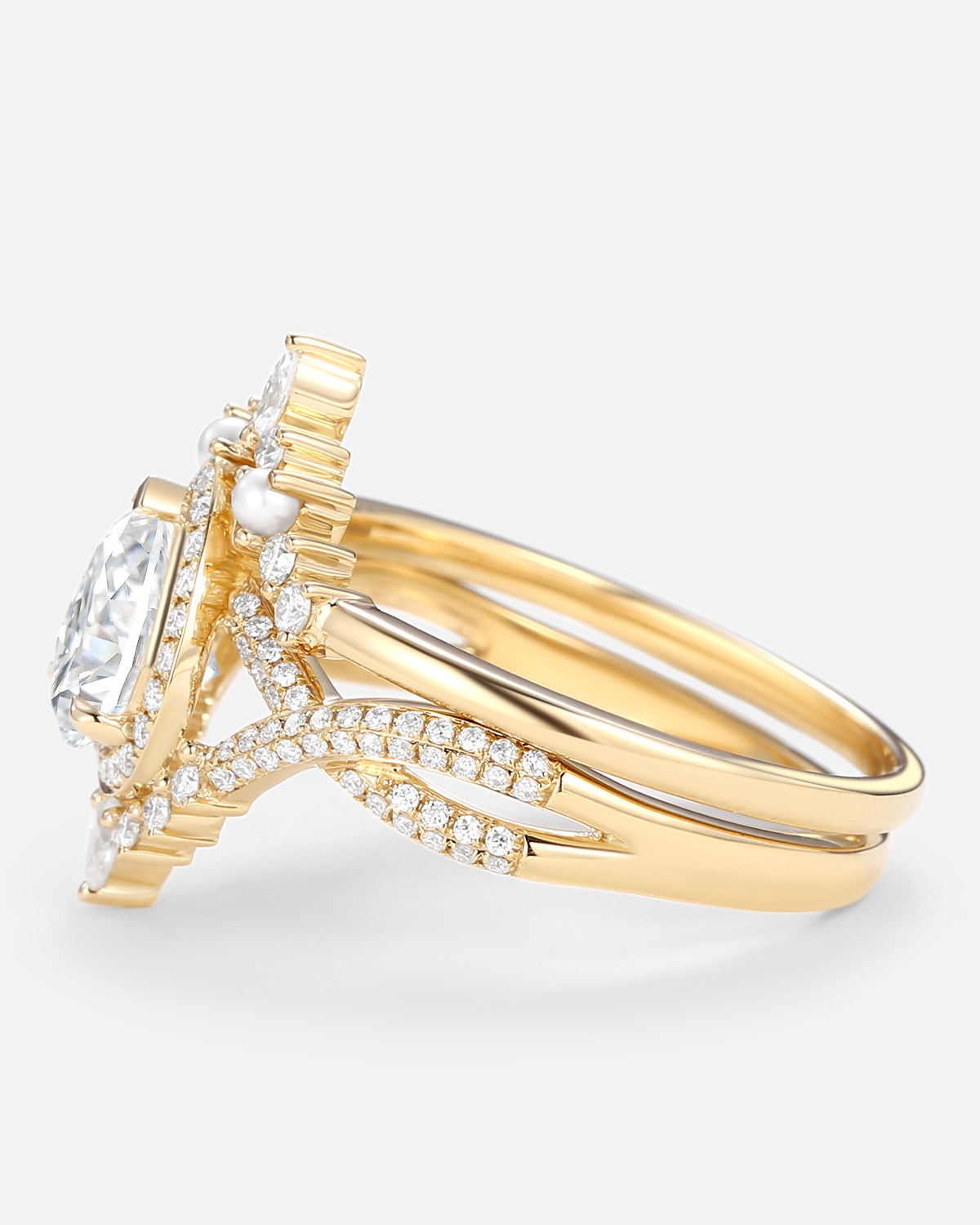 The Enchanted Halo ring features a combination of center stones and small diamonds or gemstones surrounding it, creating a halo effect that resembles a radiant aura. Countless small diamonds are clustered around the main stone, making it appear larger and more dazzling, while also adding to the overall brilliance and grandeur of halo moissanite engagement rings. Felicegals's halo moissanite ring design is delicate and harmonious, showcasing an elegant and refined style. Legend has it that during a solar eclipse, young couples make wishes, and their love will be blessed by the gods. The halo ring has become a guardian of love.