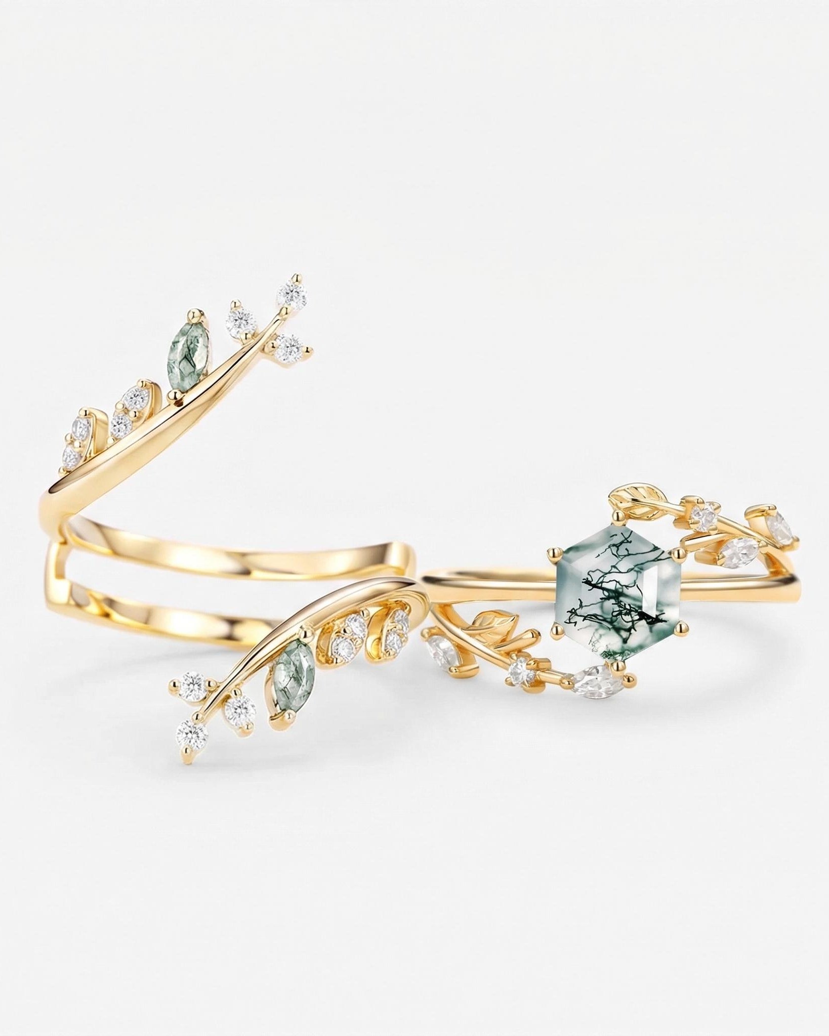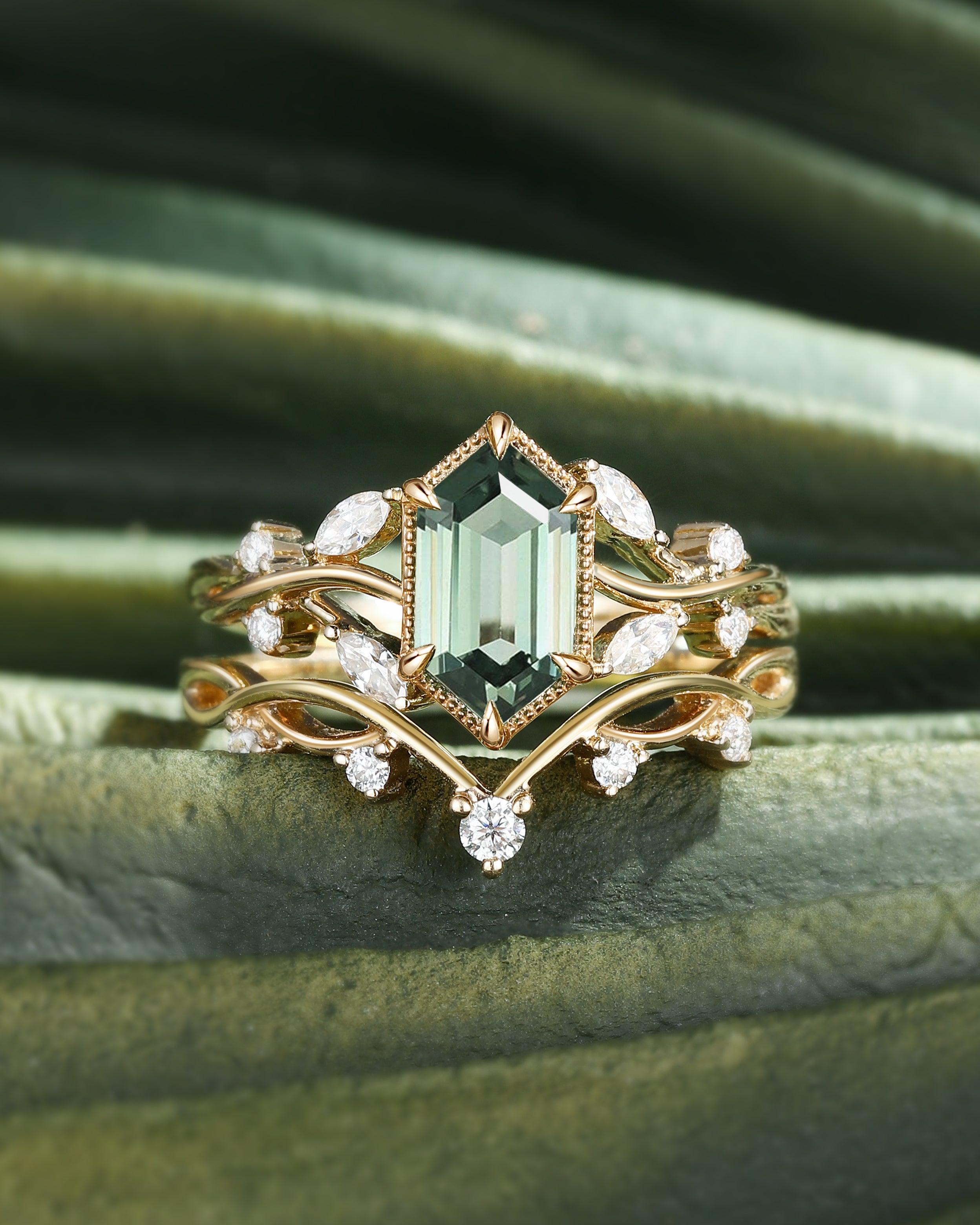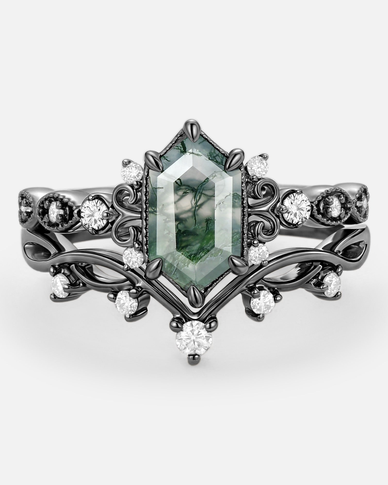 For Nature Inspired lovers: Choose a elongated hexagon engagement ring set with moss agate—its swirled green inclusions pair with the hexagon’s organic symmetry (echoing honeycombs or river stones), adding earthy charm to the ring’s clean lines.