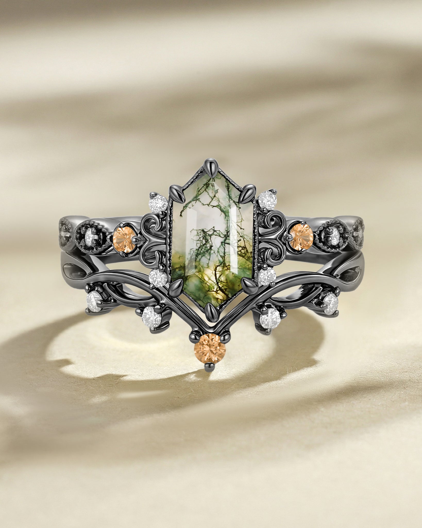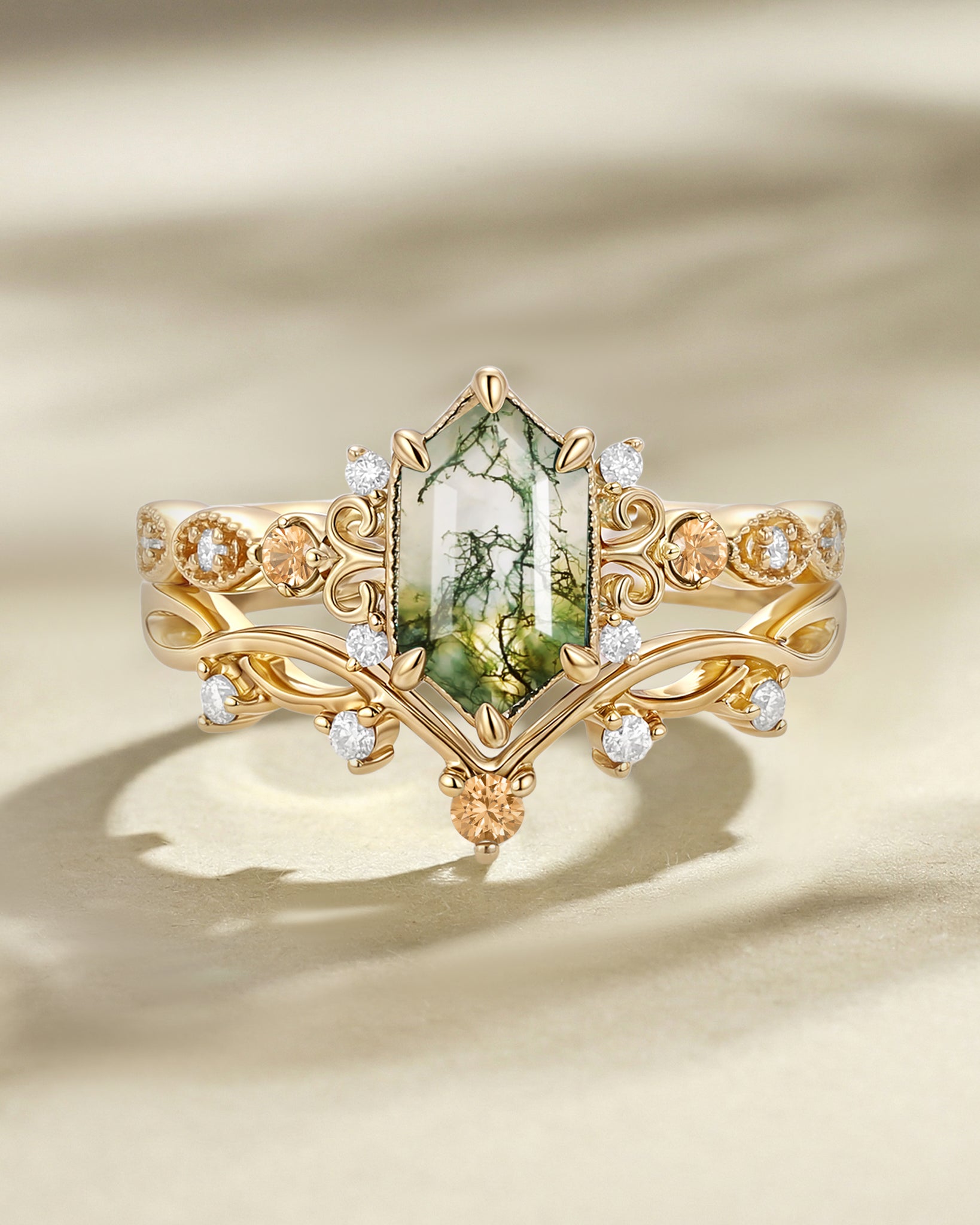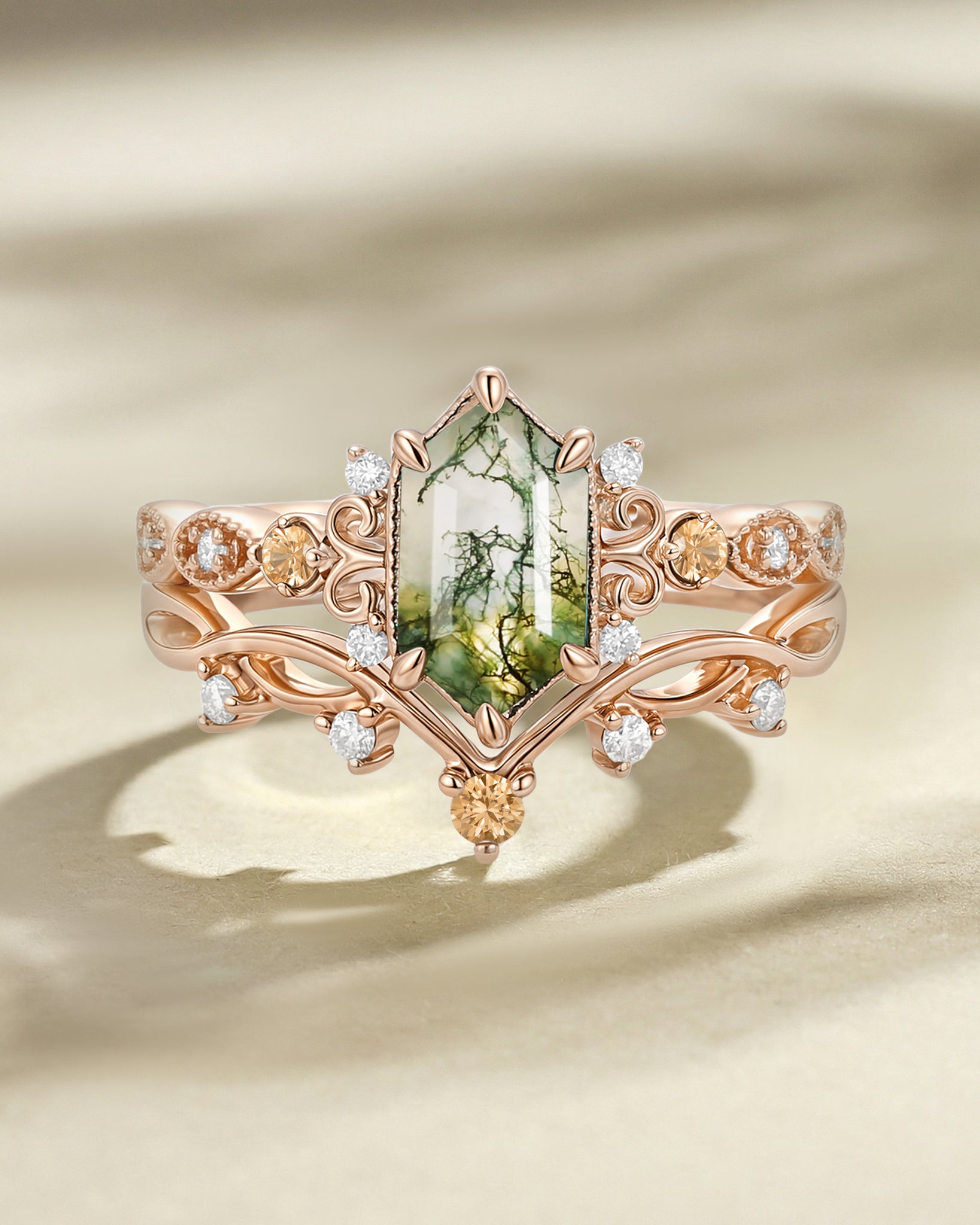 For Nature Inspired lovers: Choose a elongated hexagon engagement ring set with moss agate—its swirled green inclusions pair with the hexagon’s organic symmetry (echoing honeycombs or river stones), adding earthy charm to the ring’s clean lines.