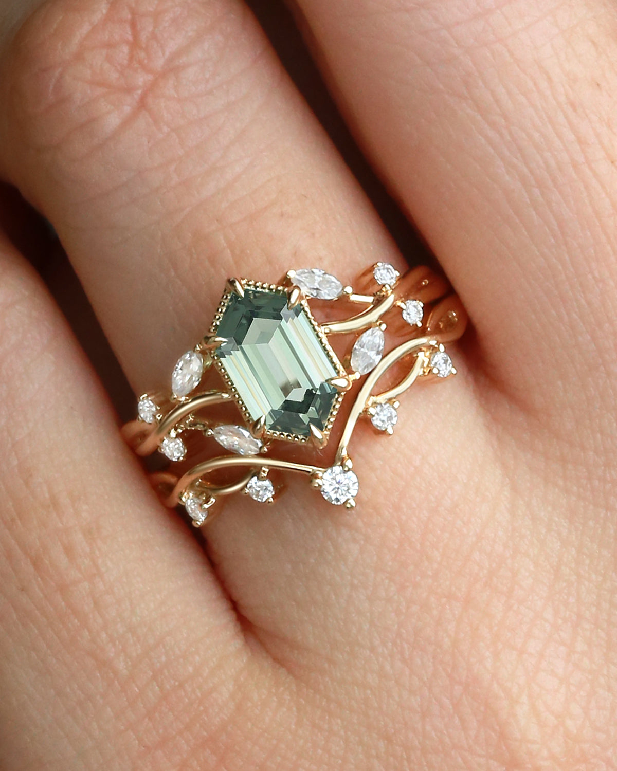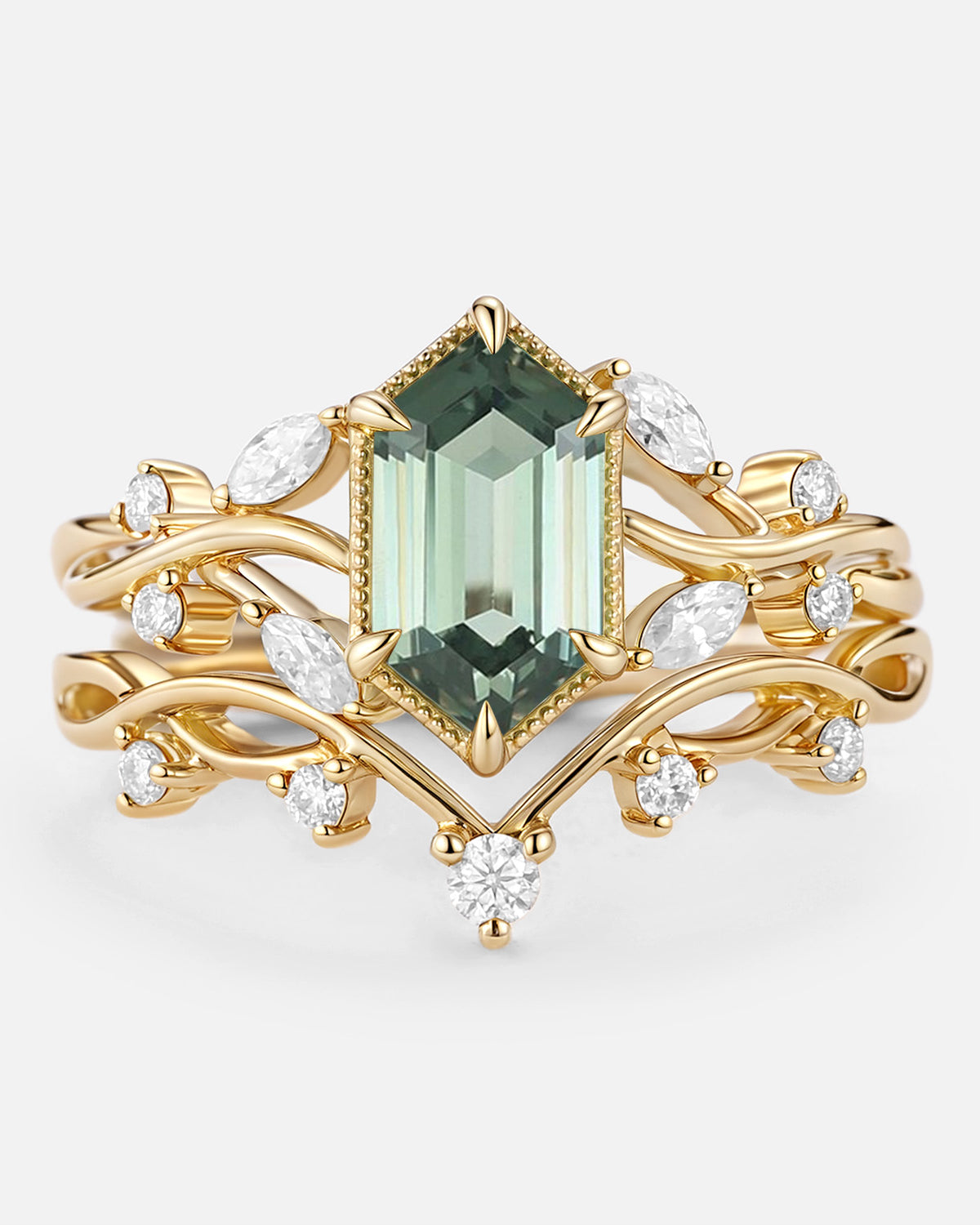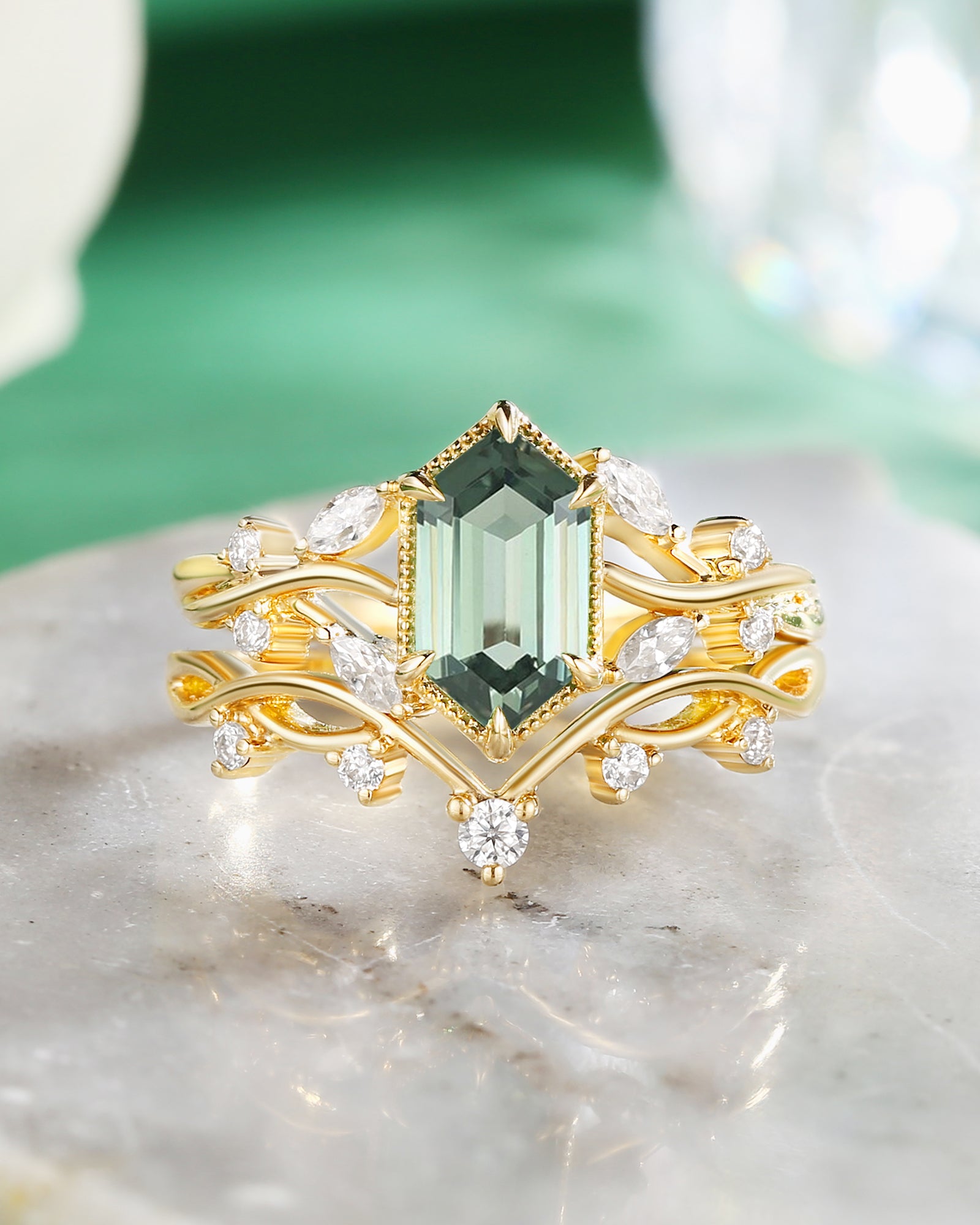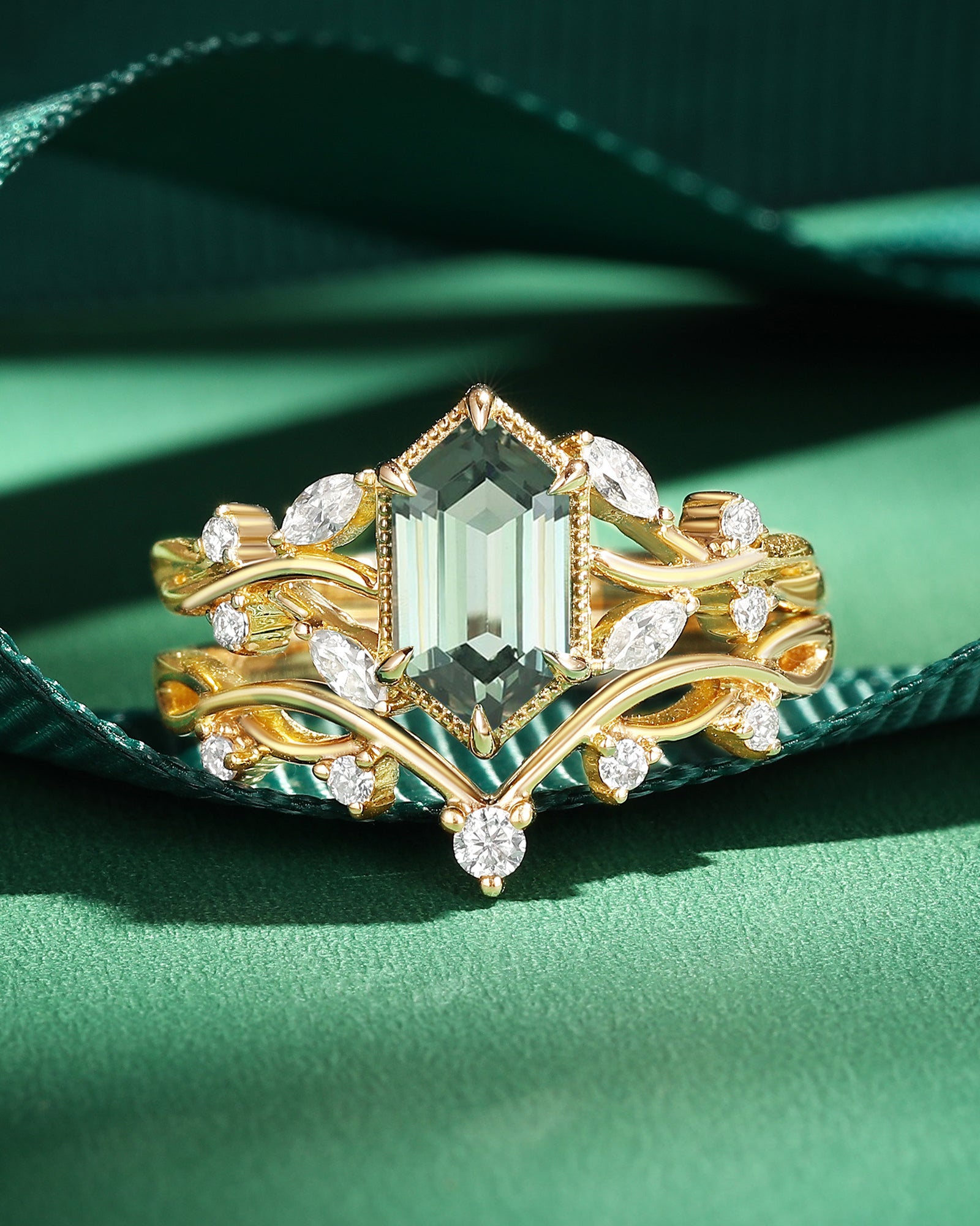Beyond gemstones, the elongated hexagon engagement ring comes in metals tailored to your vibe: Warm yellow gold amplifies Signature Vintage charm (perfect with sapphire or salt and pepper diamond), crisp white gold elevates Classic Engagement elegance (ideal for moss agate), and soft rose gold enhances Nature Inspired warmth. Lets you craft a elongated hexagon engagement ring that mirrors your love story—no generic choices, just a piece that feels uniquely yours.