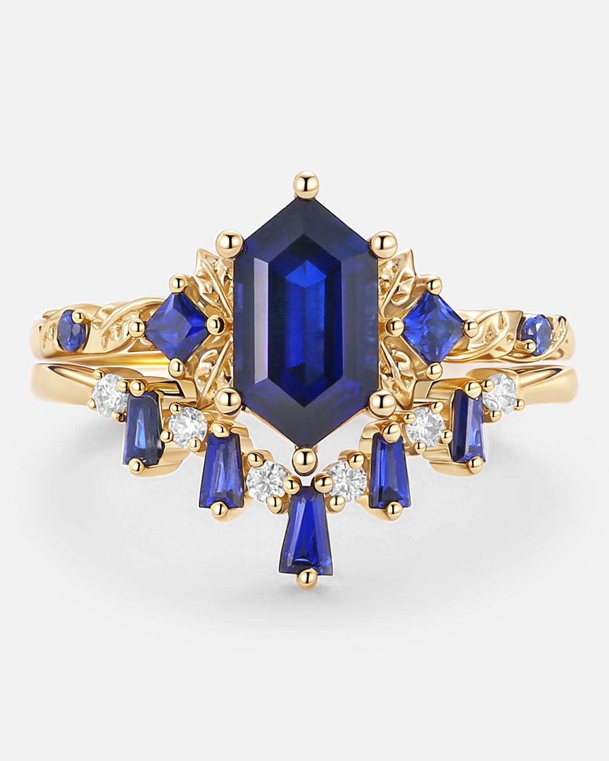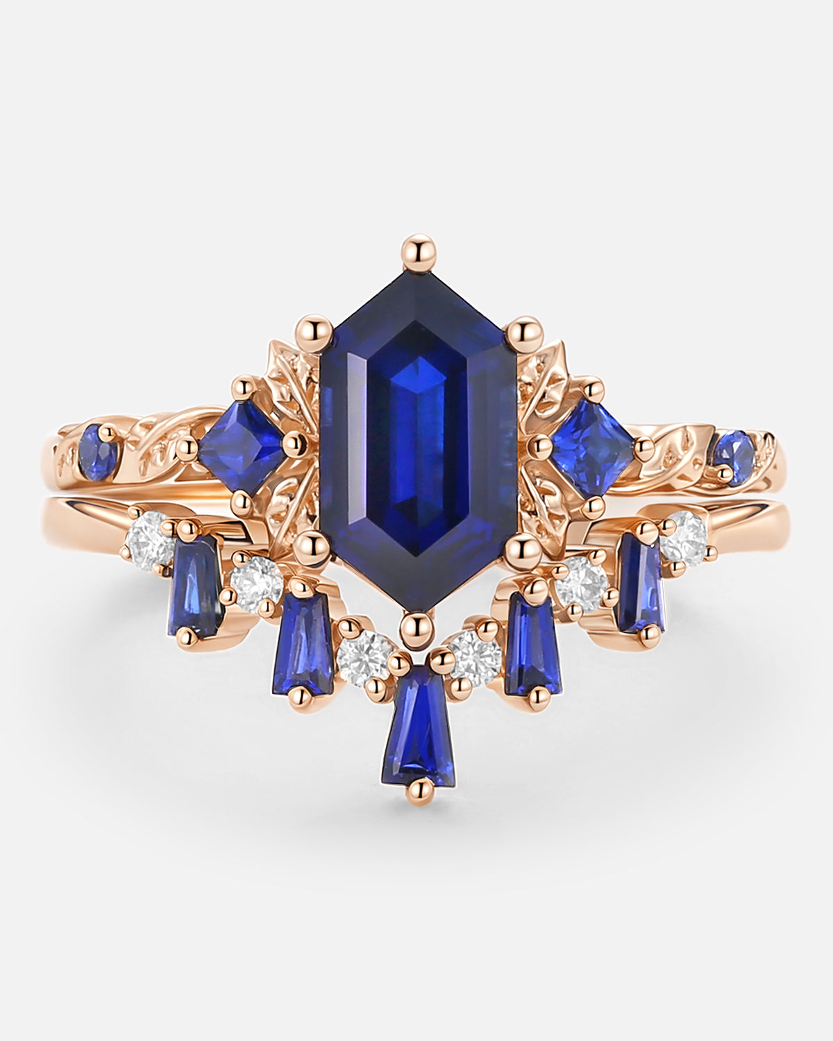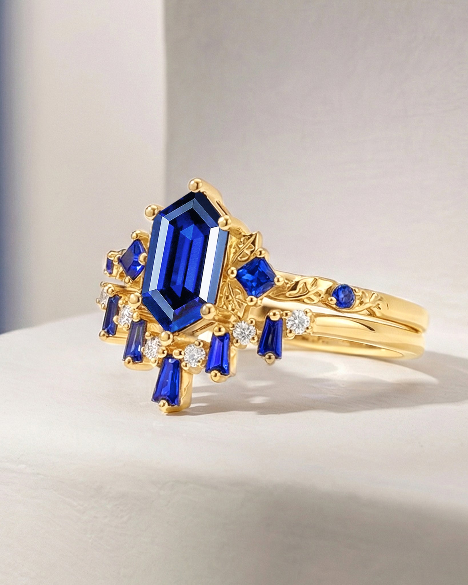For lovers of vibrant color: Opt for a elongated hexagon engagement ring with multi-color sapphire—rich blues, soft pinks, or deep greens of the sapphire pop against the hexagon’s sleek form, adding personality whether paired with vintage filigree or classic polished metal.