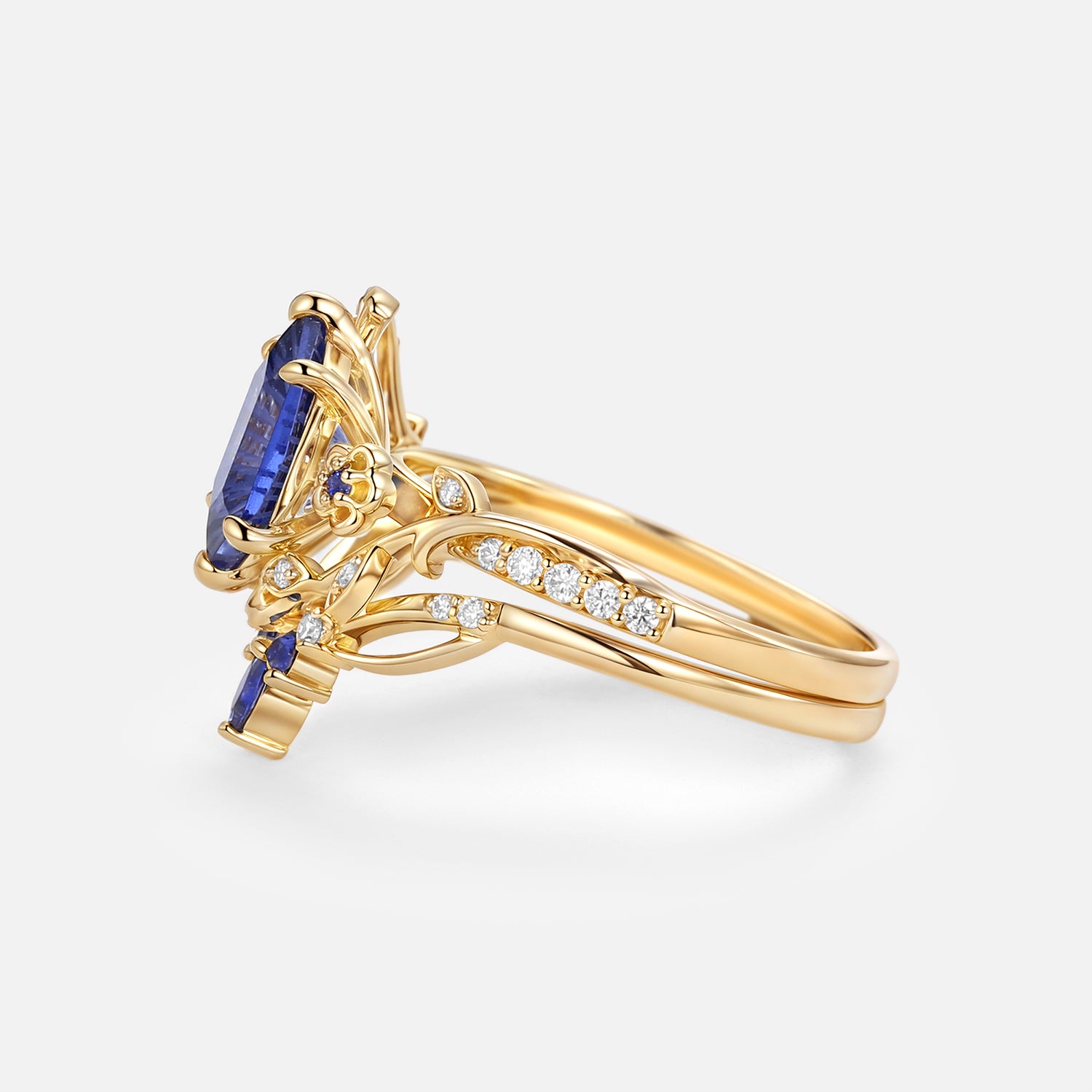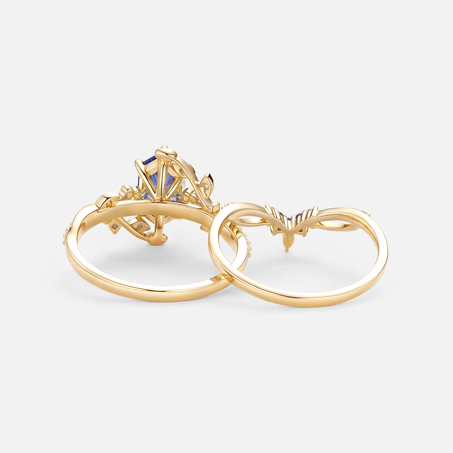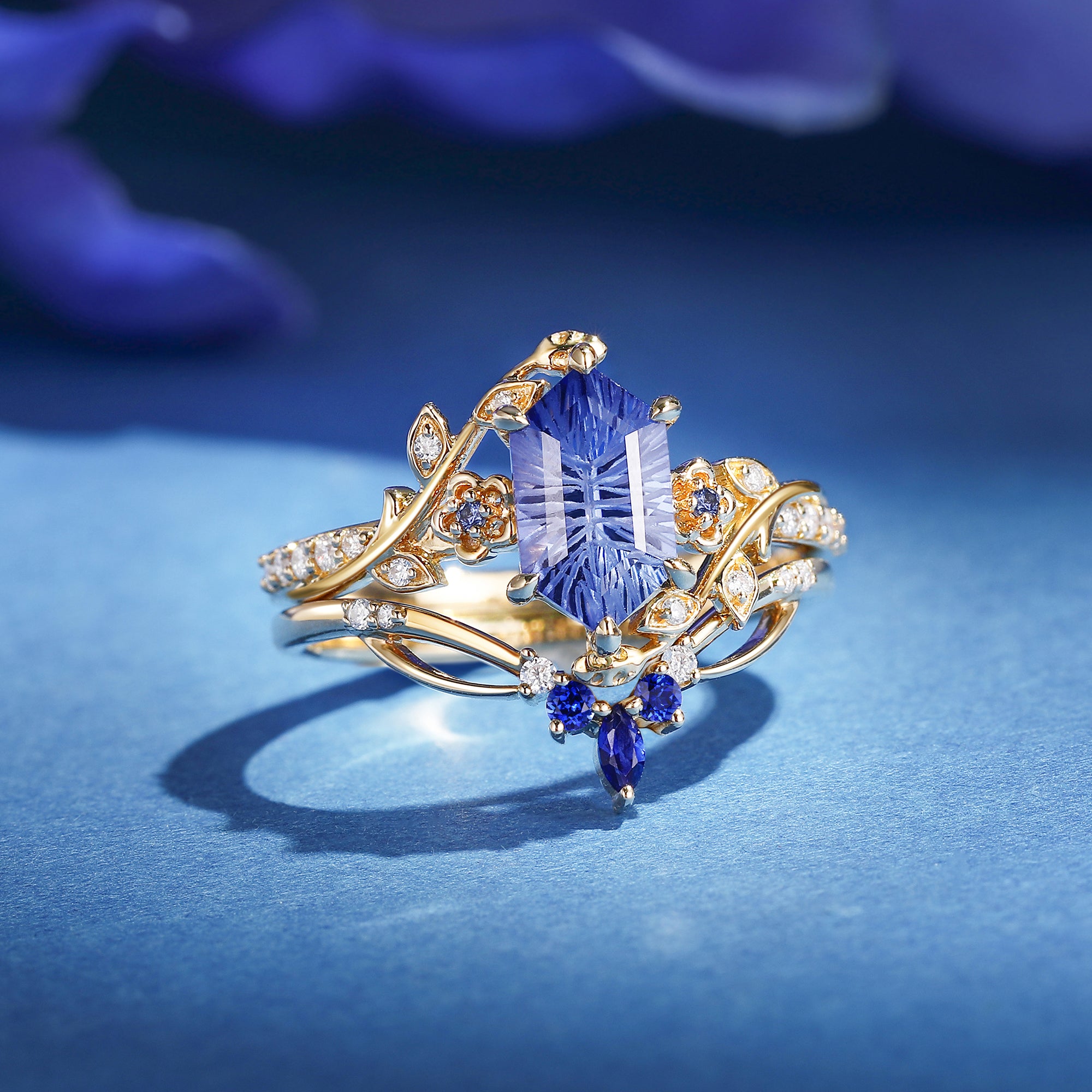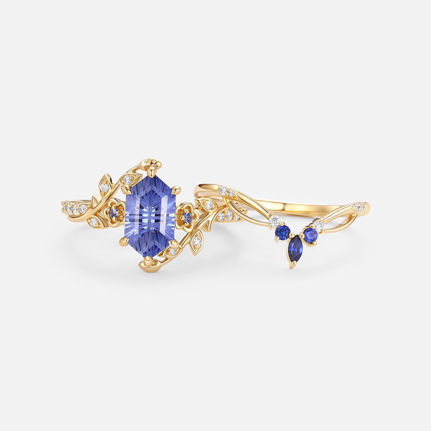 Embrace the bold brilliance of the Zane engagement ring set. The luminous lab cornflower sapphire at its core, shaped into a sleek elongated hexagon with a dazzling fireworks cut, features multi-layered facets that catch light to cast a soft, sky-kissed blue glow with every subtle movement—capturing the quiet vibrancy of cornflower blooms under the sun. It’s delicately secured by refined prongs, while both bands of the 2pcs set are adorned with exquisitely carved leafy patterns that echo the graceful lines of elm leaves dancing in a gentle breeze. This intricate detailing lets the set exude bold, natural charm from every angle.