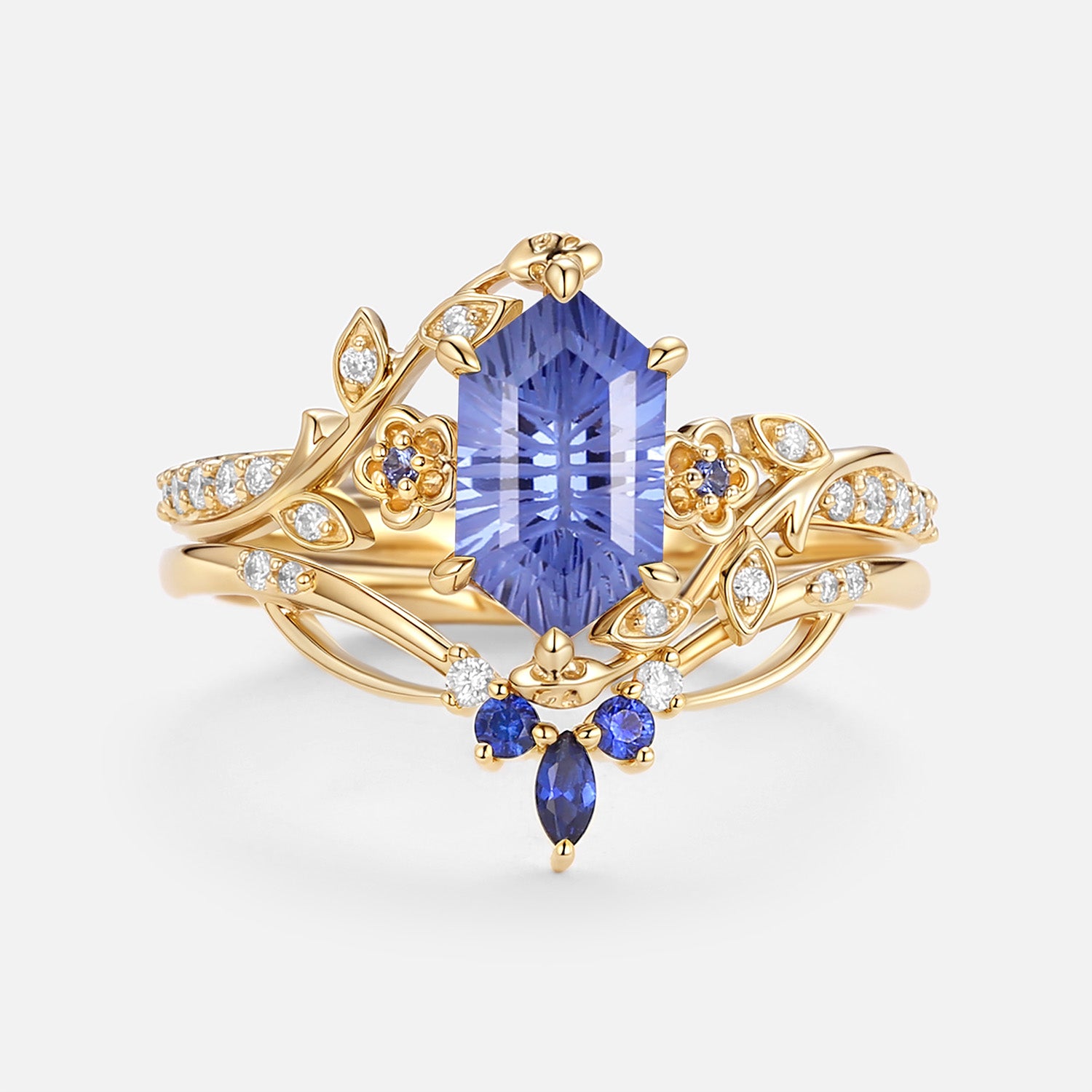 Fireworks Cut Lab Cornflower Sapphire Elongated Hexagon Engagement Ring Set - Zane