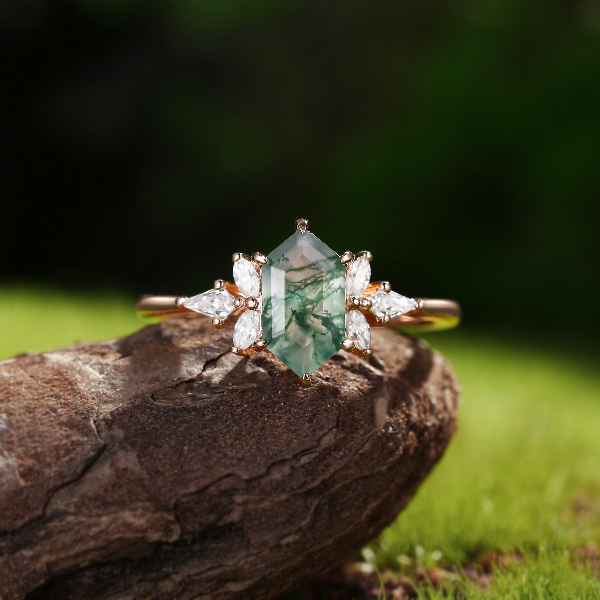 Hexagon & Kite Moss Agate Cluster Engagement Ring