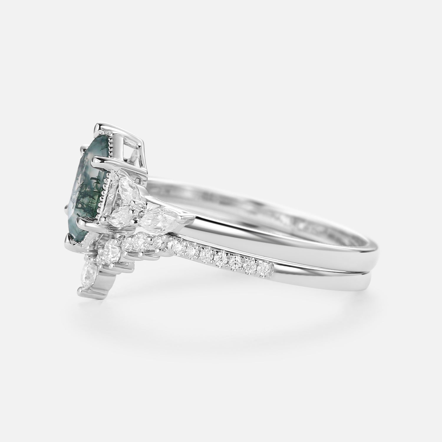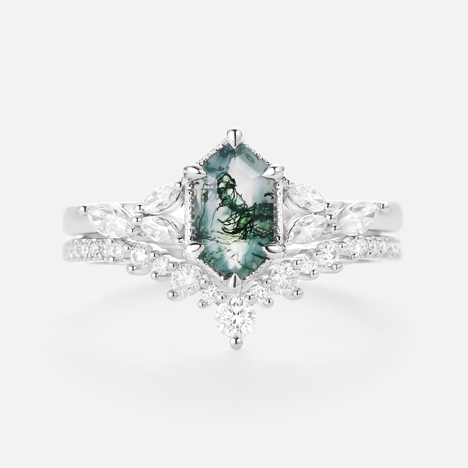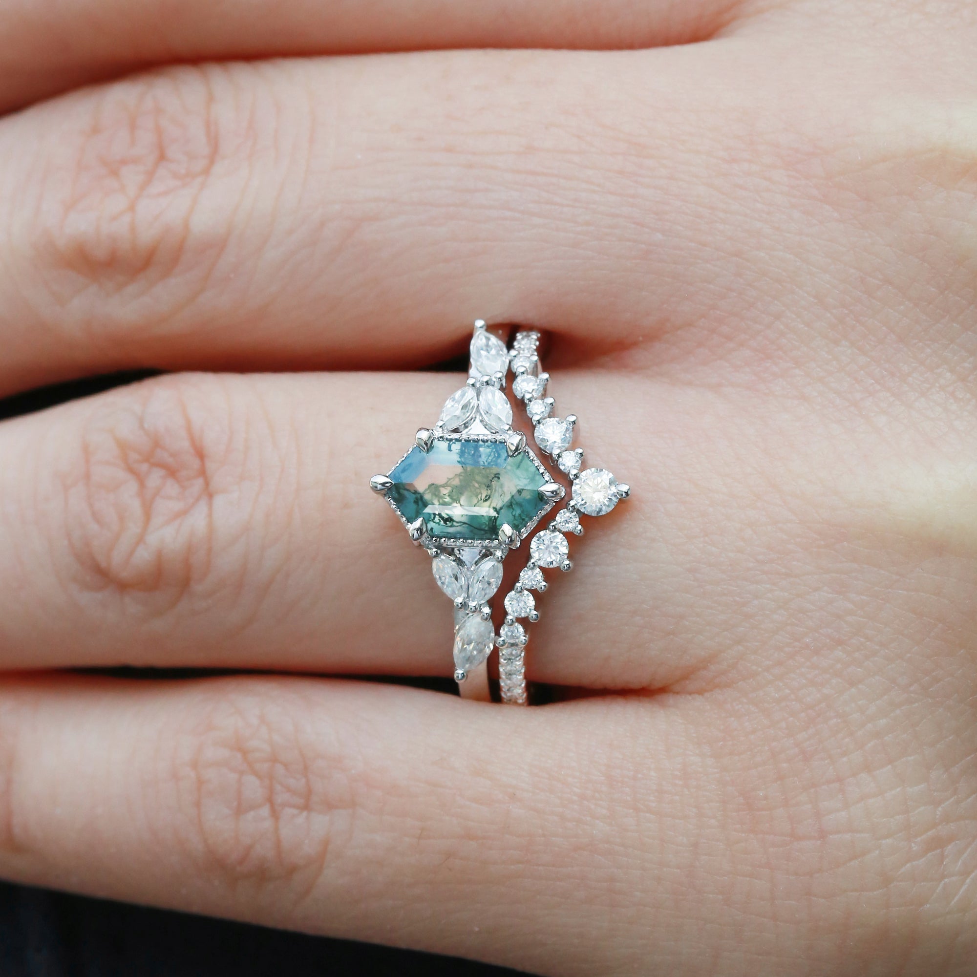 Long Hexagon Moss Agate Cluster Engagement Ring Set 2pcs