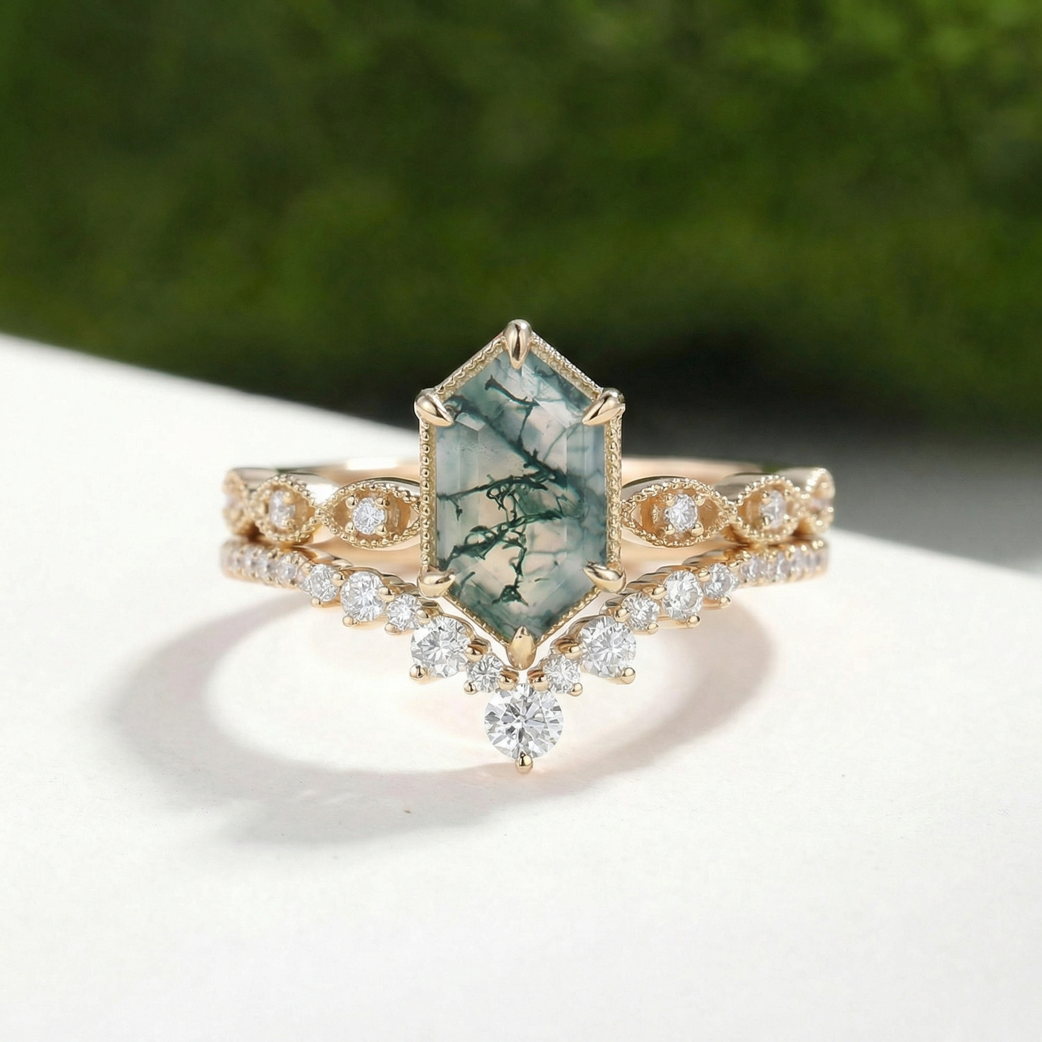 For Nature Inspired lovers: Choose a elongated hexagon engagement ring set with moss agate—its swirled green inclusions pair with the hexagon’s organic symmetry (echoing honeycombs or river stones), adding earthy charm to the ring’s clean lines.