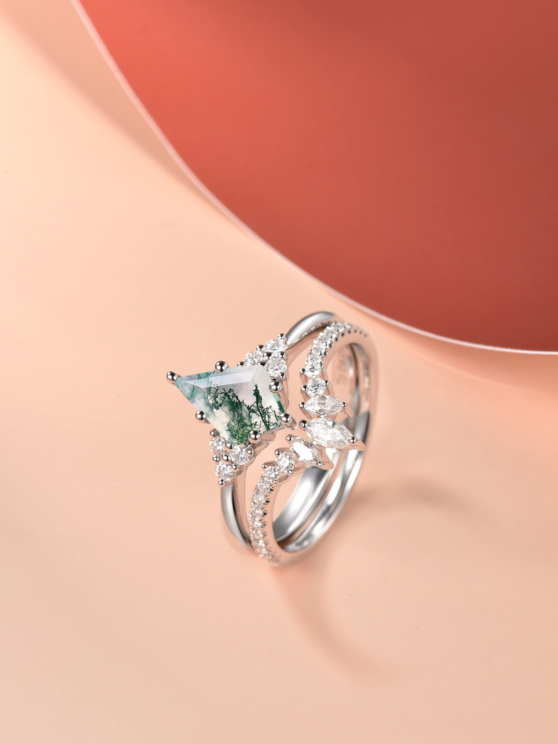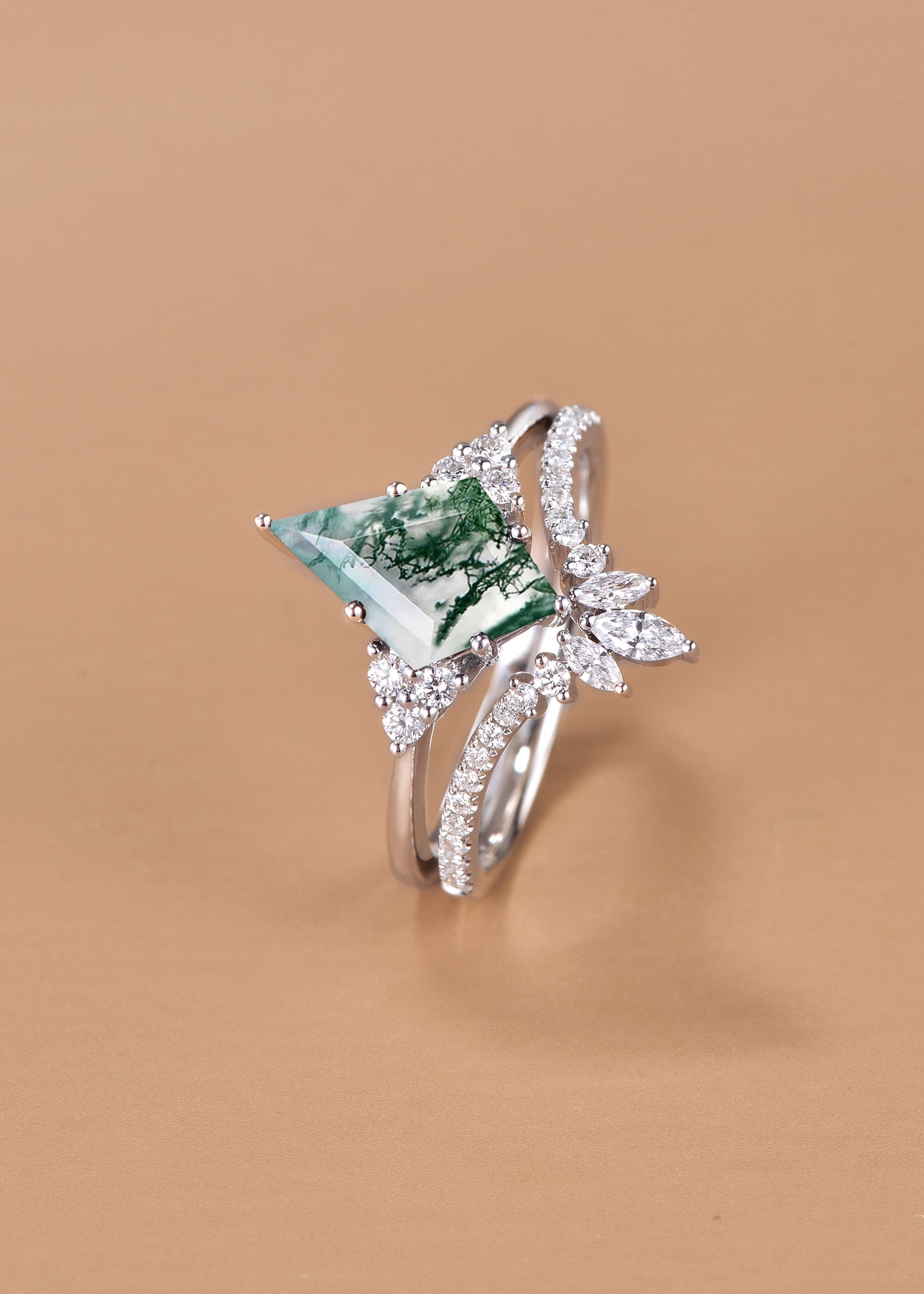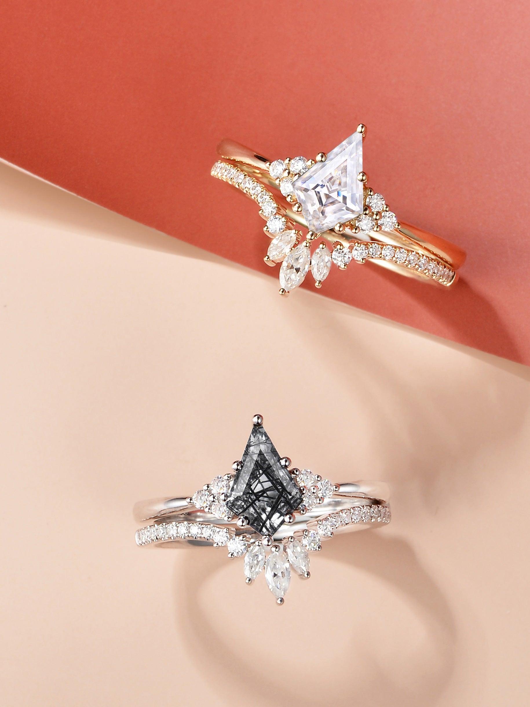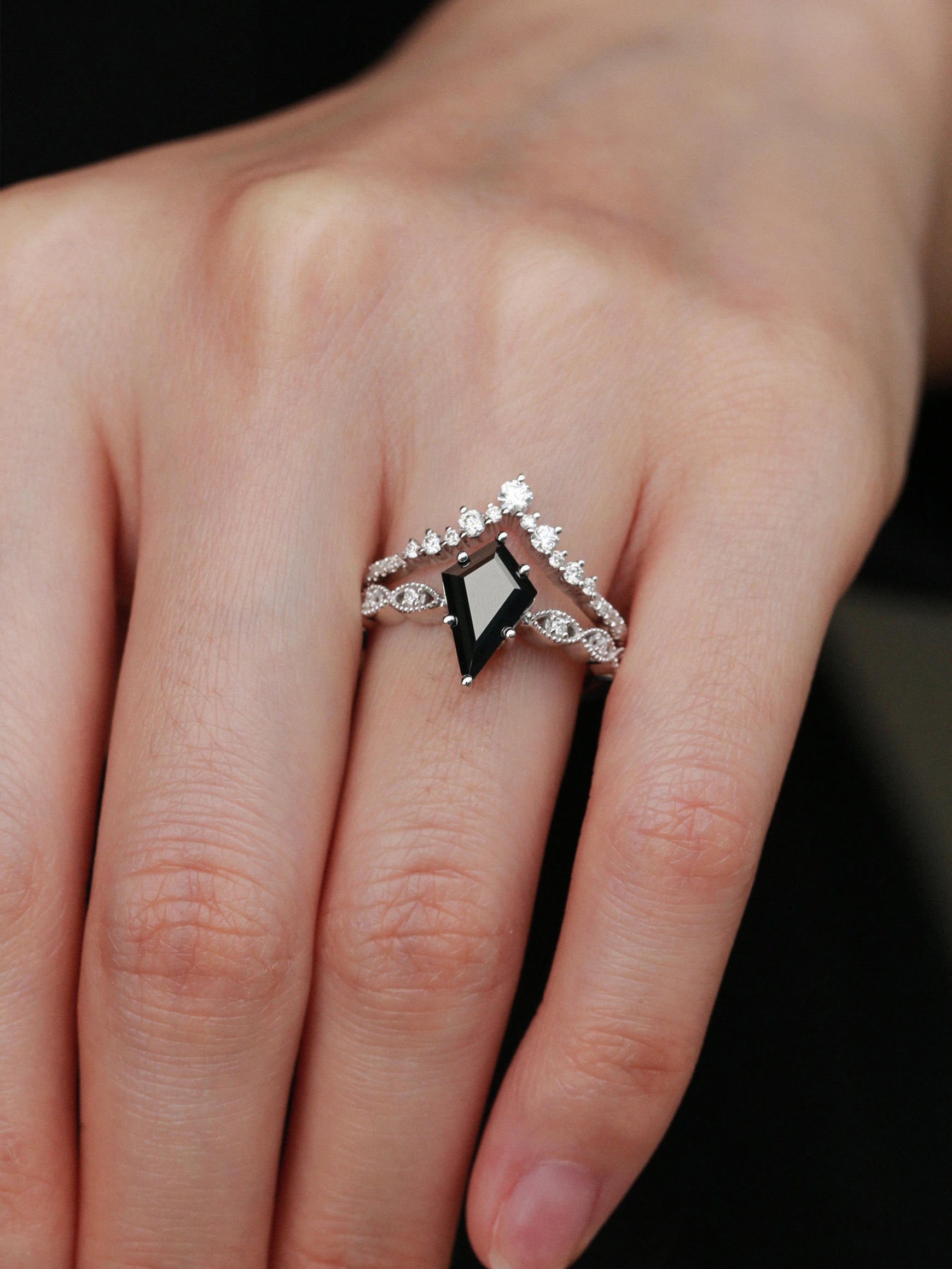 Features a unique kite-shaped center stone that is beautifully centered by a cluster of three-stone trio. The balance between minimalism and vintage vibes is what we're after.