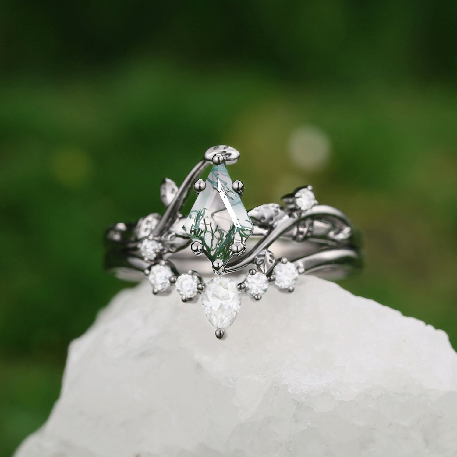 Black Gold Kite Cut Moss Agate Leafy Bridal Ring Sets 2pcs - Willow