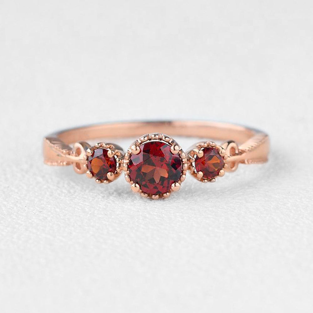Felicegals 5mm & 3 mm Garnet Rose Gold Ring Three Stone Vintage Inspired Engagement Ring Stacking Ring Anniversary Gift