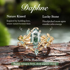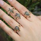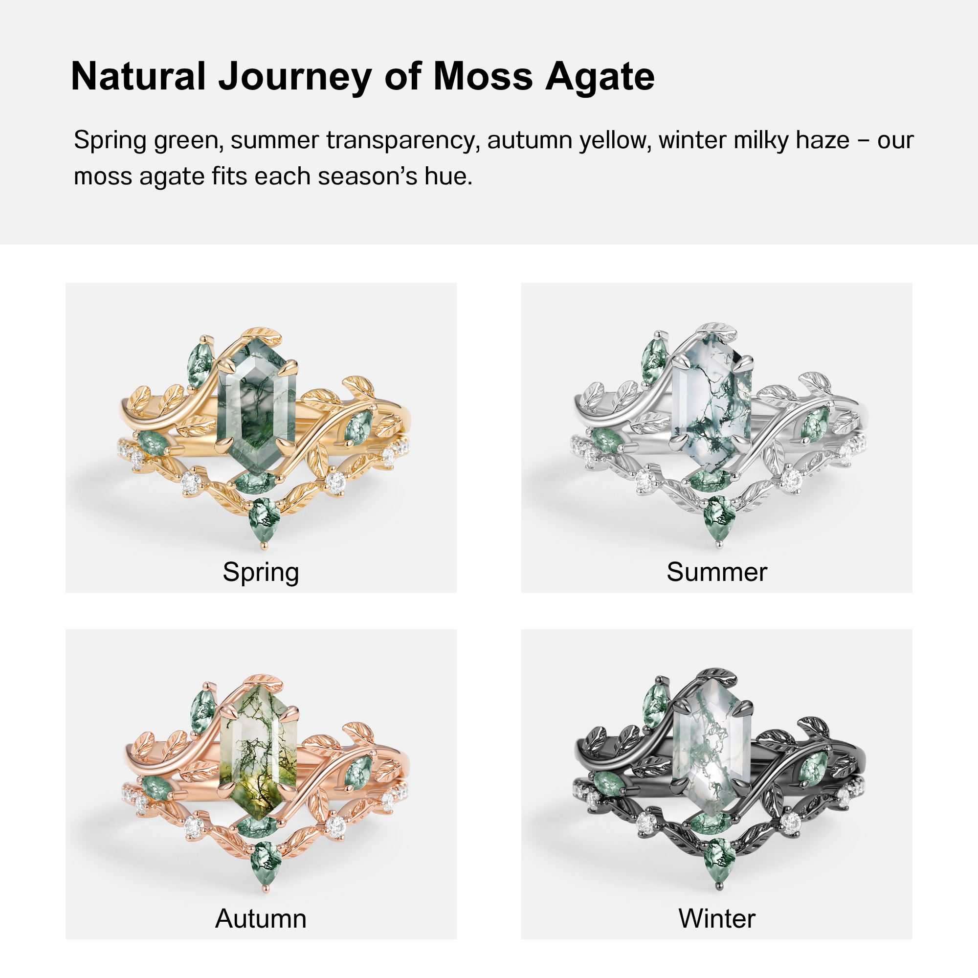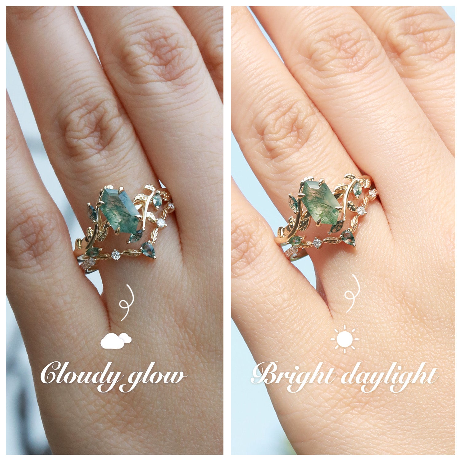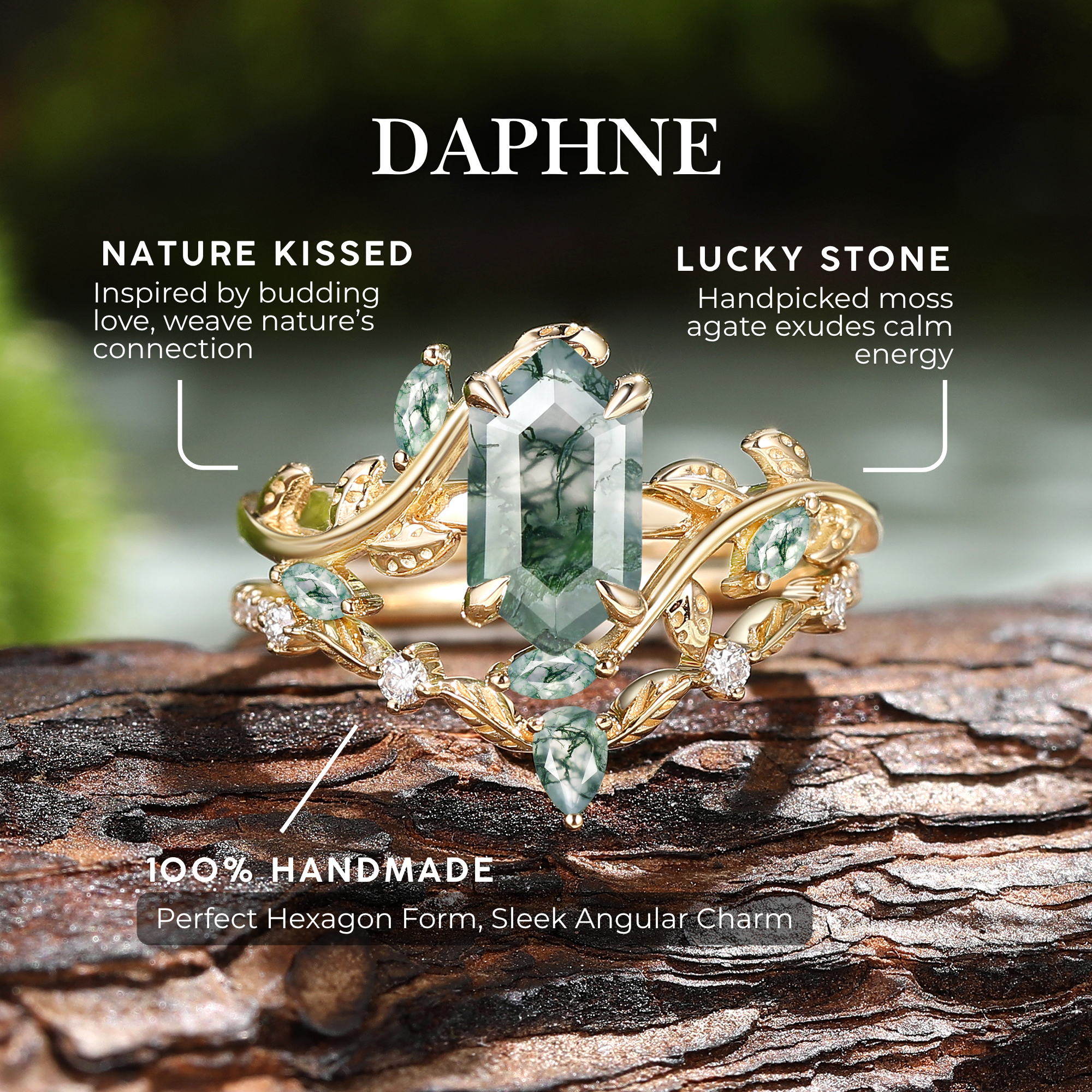 Green Moss Agate Long Hexagon Vine Engagement Ring Set 2pcs - Daphne