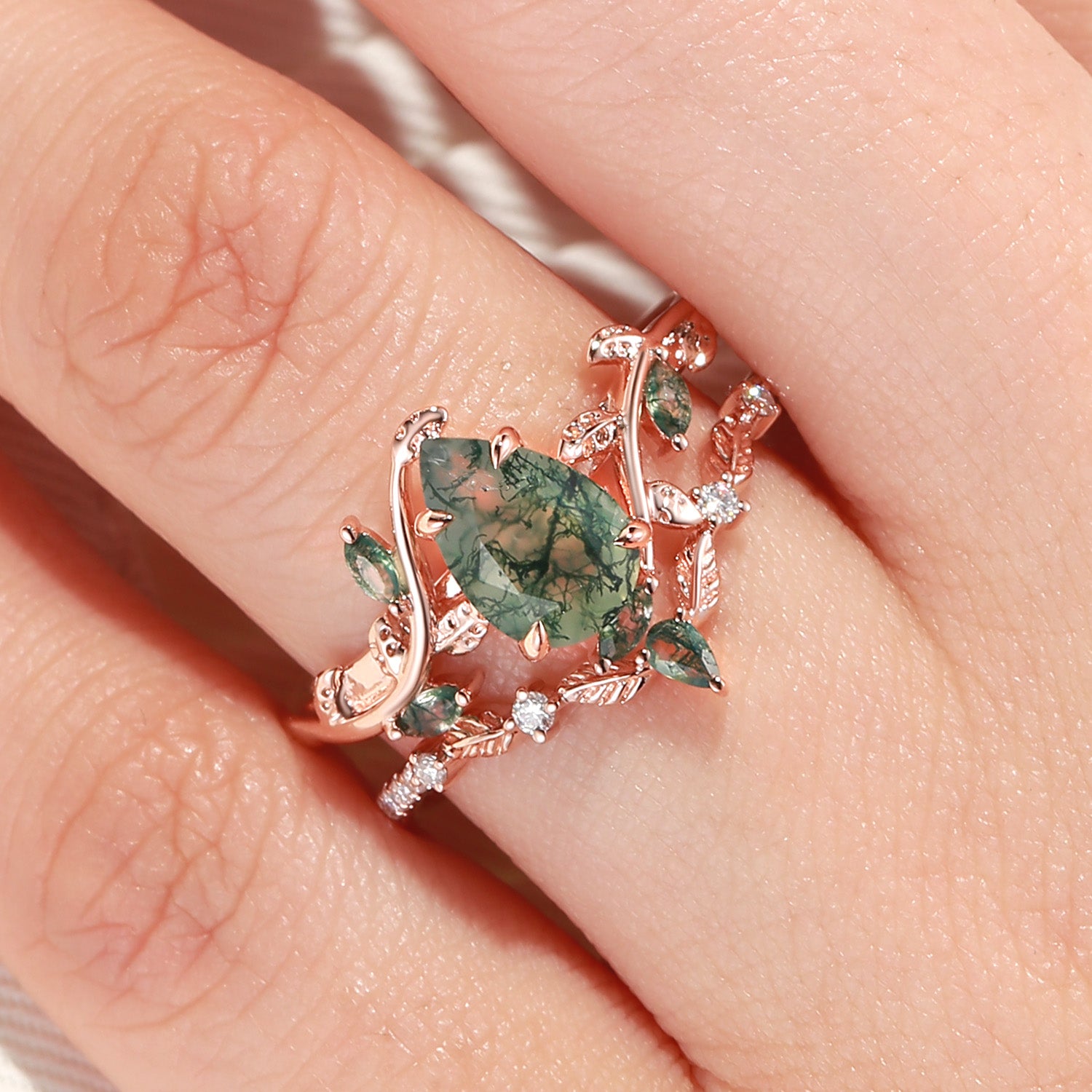Green Moss Agate Pear Vine Engagement Ring Set 2pcs - Daphne
