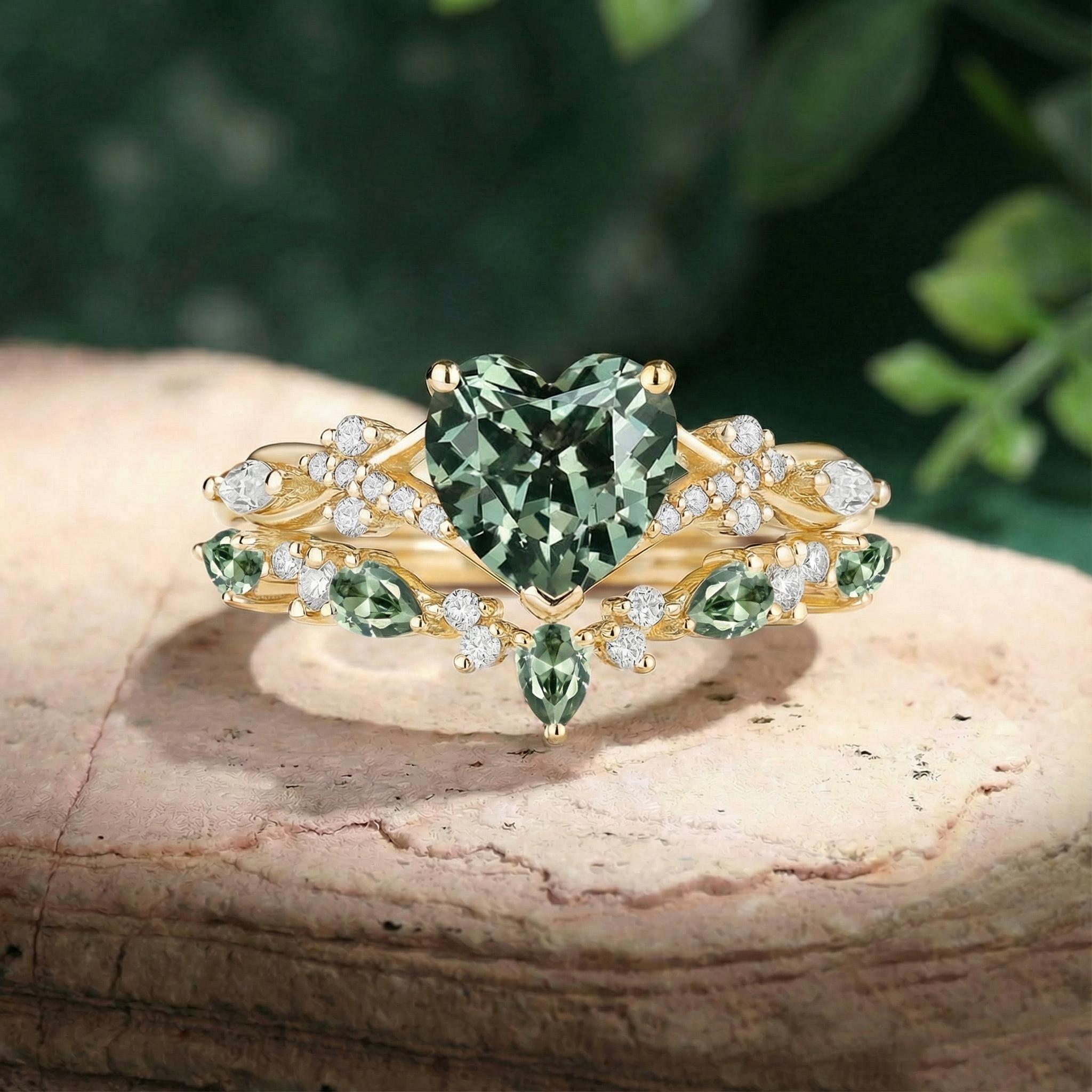 Heart Shaped Lab Green Sapphire Engagement Ring Set 2pcs - Eulalia