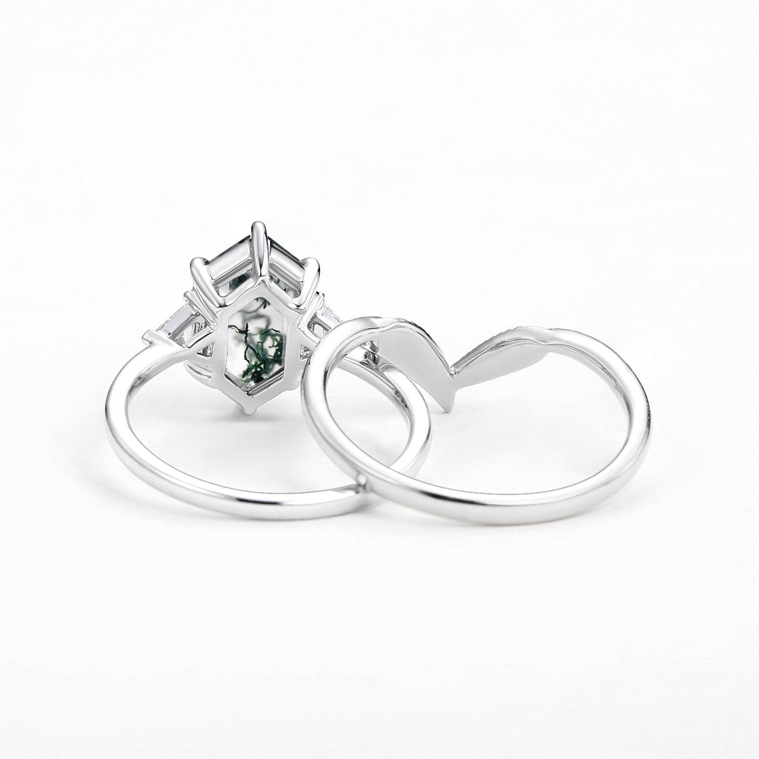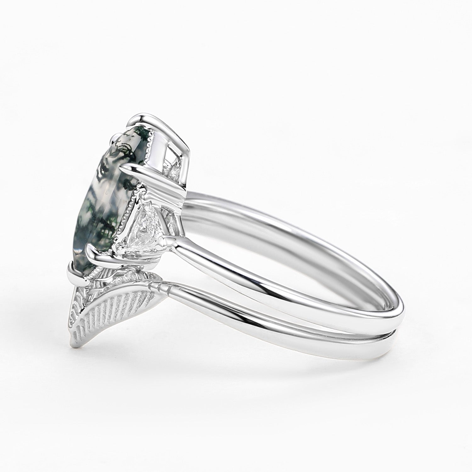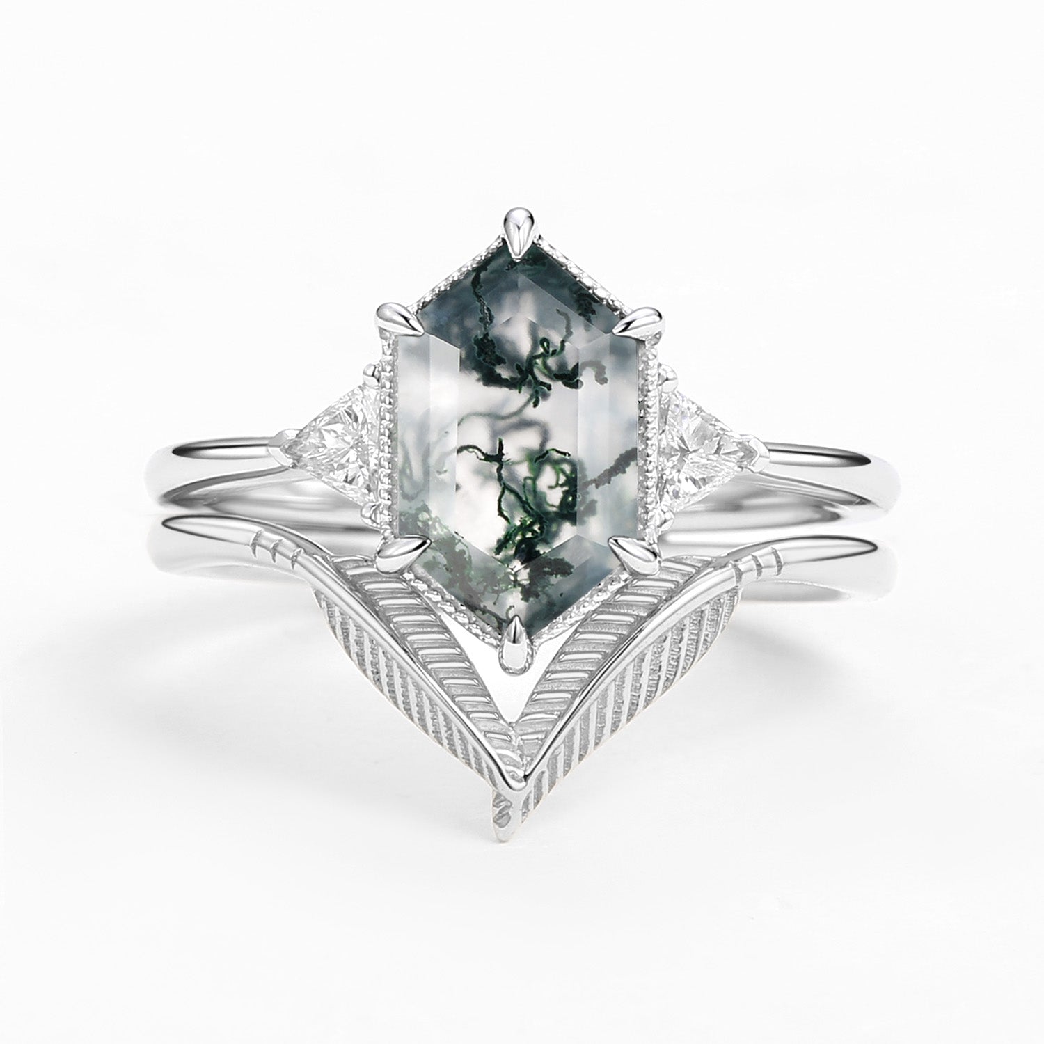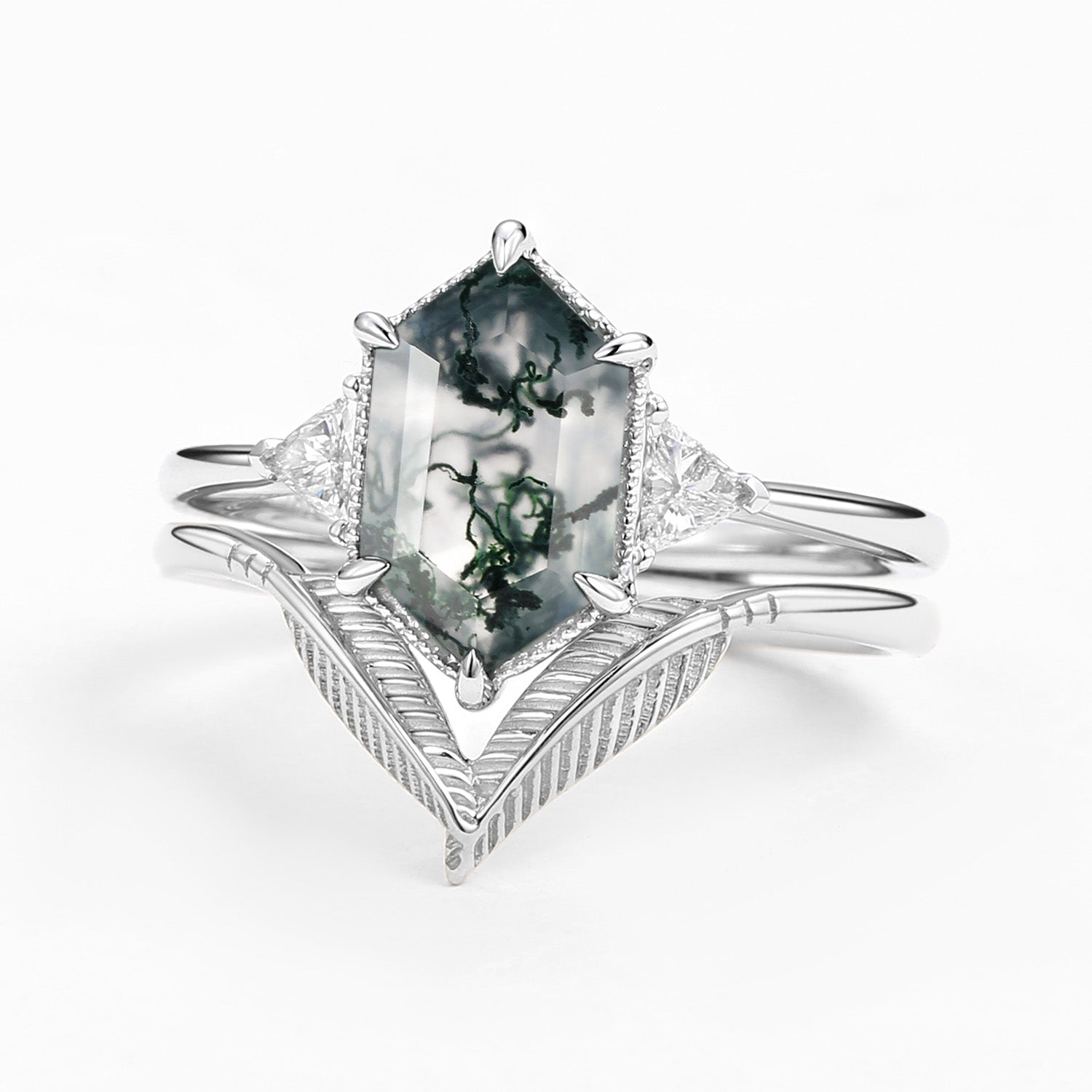 Long Hexagon Big Moss Agate Coconut Tree Leafy Ring Set 2pcs - Ariel