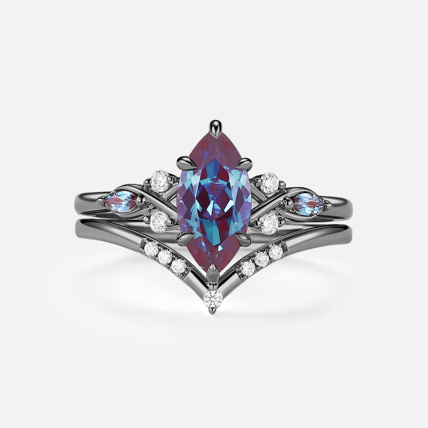 Marquise Cut Minimalist Lab Alexandrite Engagement Ring Sets 2pcs - Mirage