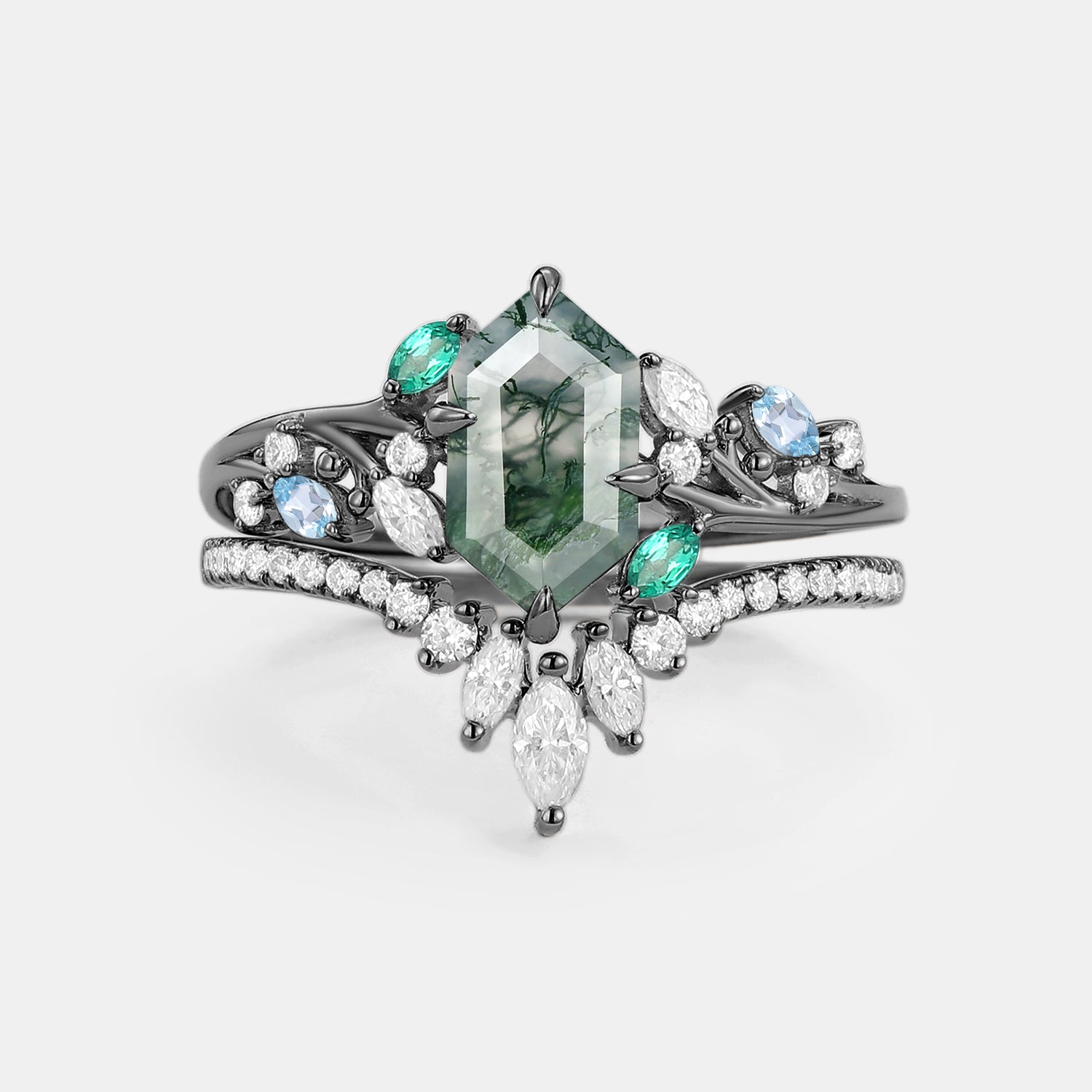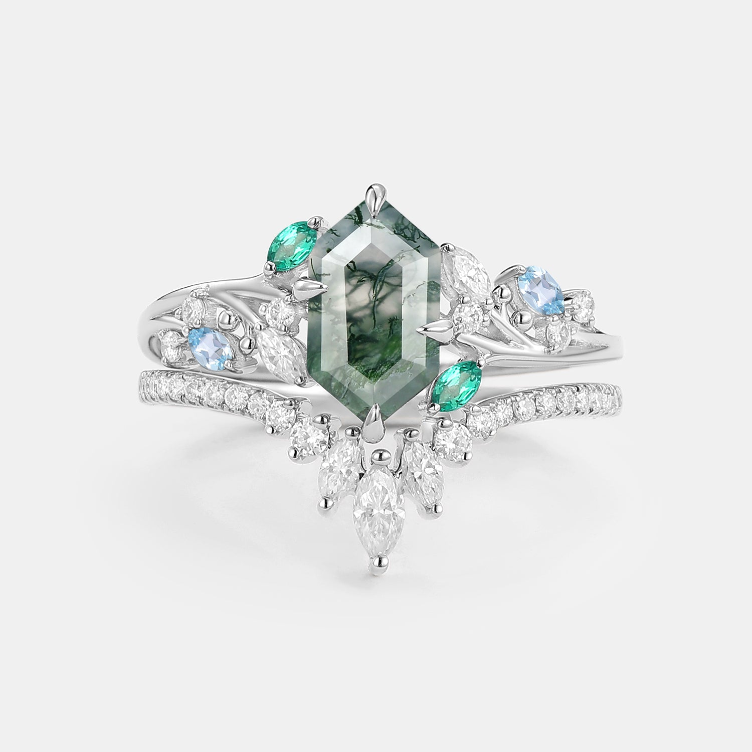 Moss Agate Vine Elongated Hexagon Engagement Ring Set - Hollow