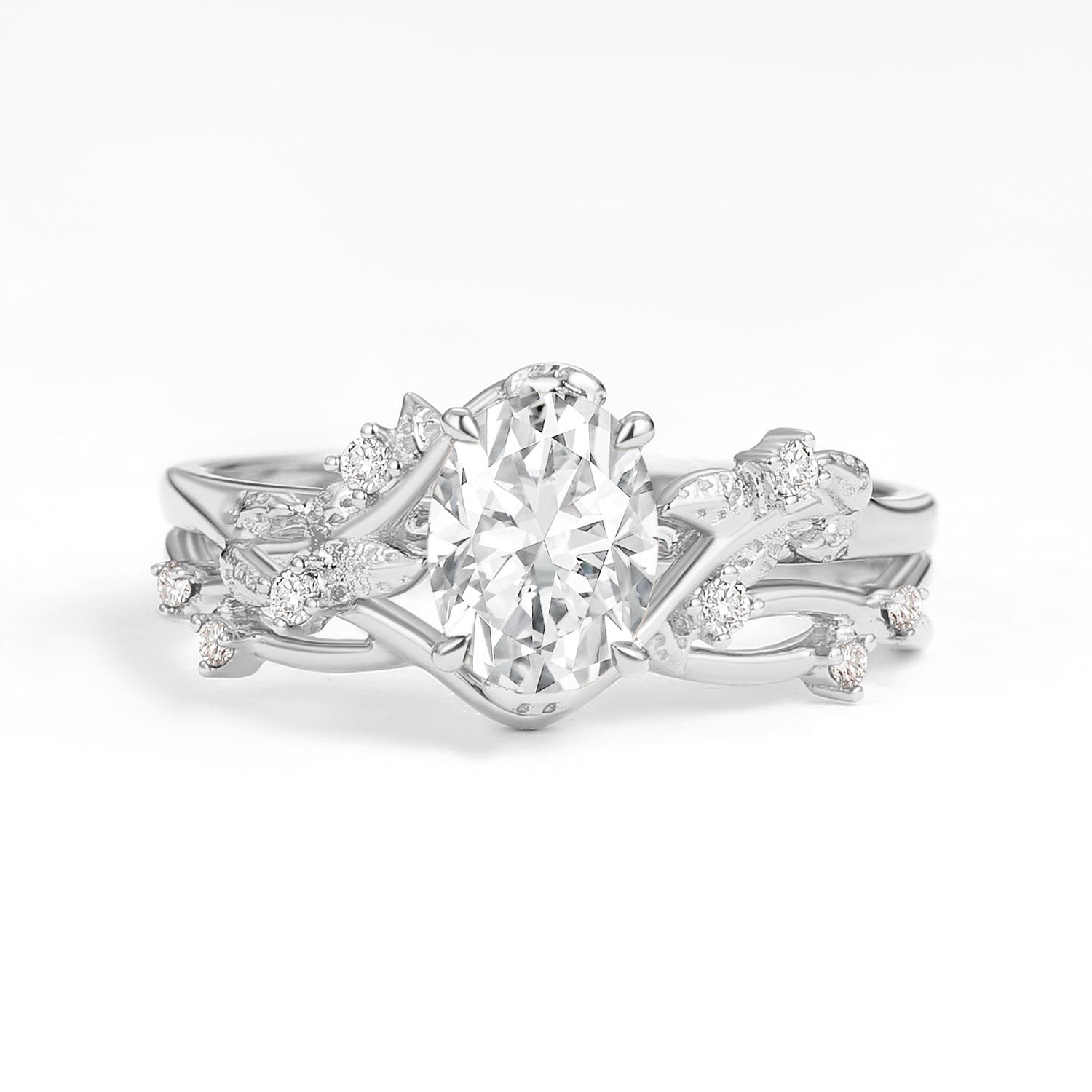 Nature Inspired - Oval Cut Moissanite Leafy Gold Ring Set 2pcs - Mossy
