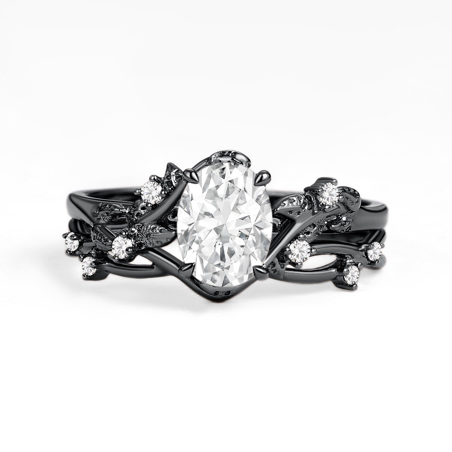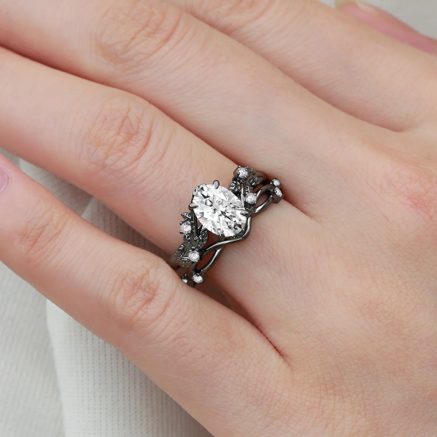 Felicegals 1.5ct Oval Cut Moissanite Leafy Gold Ring Set 2pcs Stacking Curved Custom Ring Gift for Her Witchy Bridal Set Gift