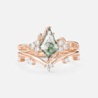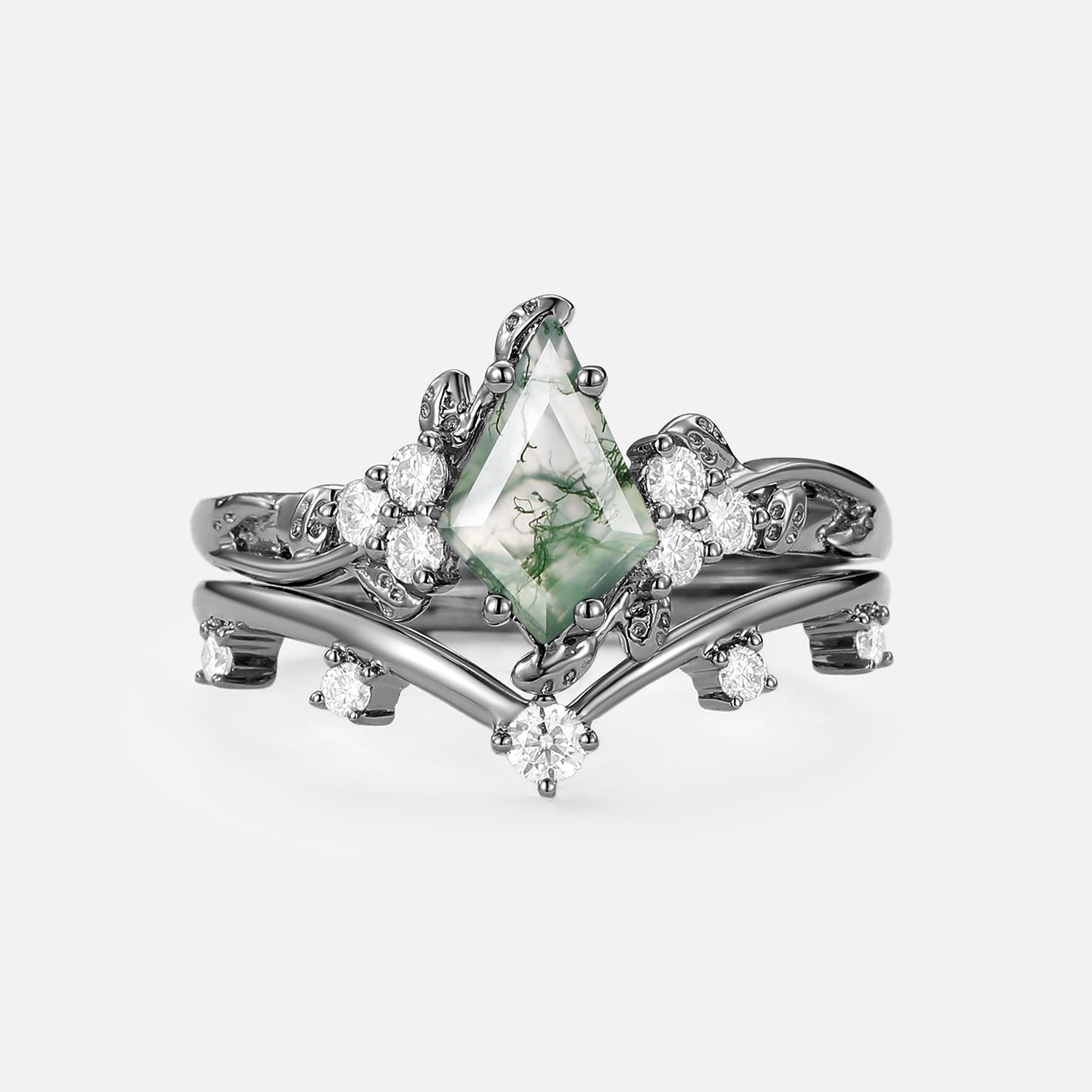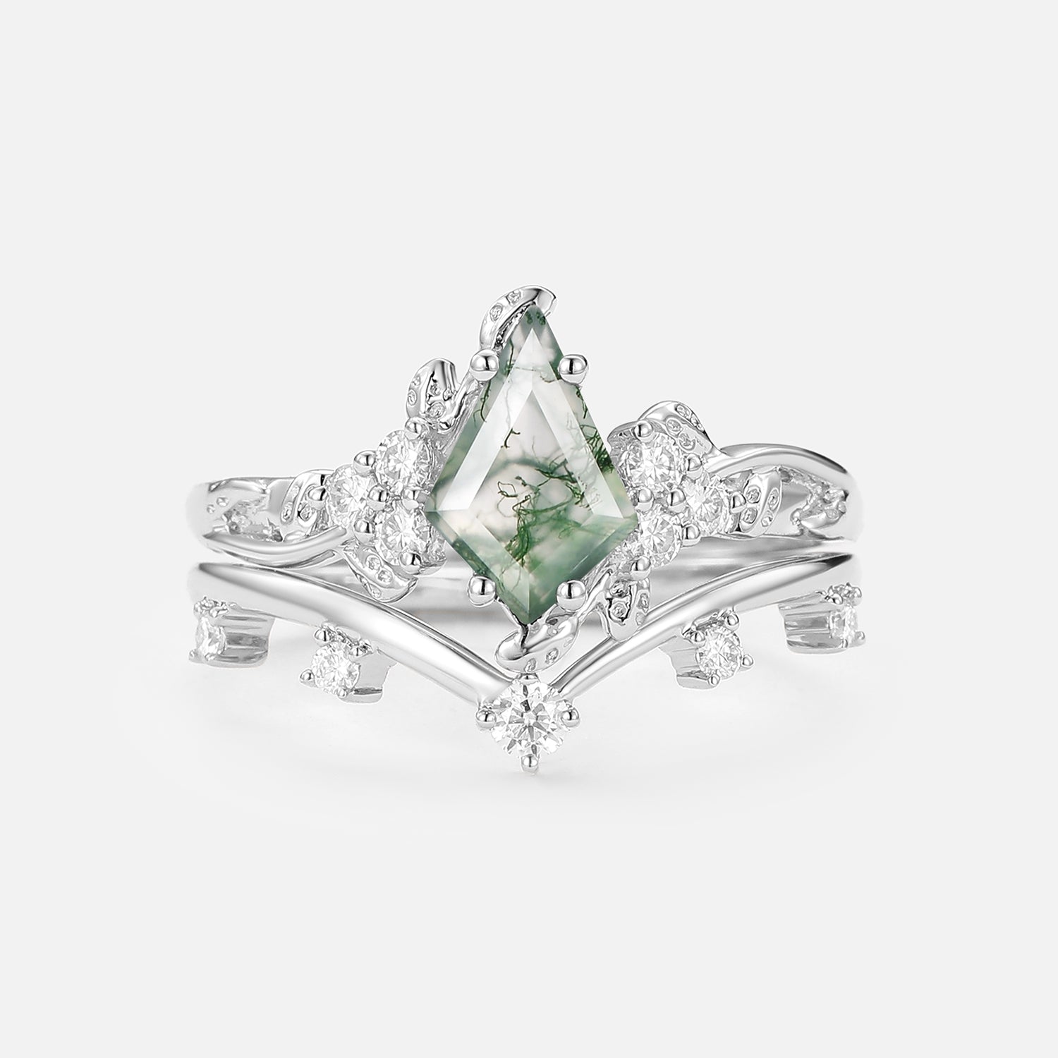 Unique Kite Cut Moss Agate Cluster Engagement Ring Set 2pcs - Bramble