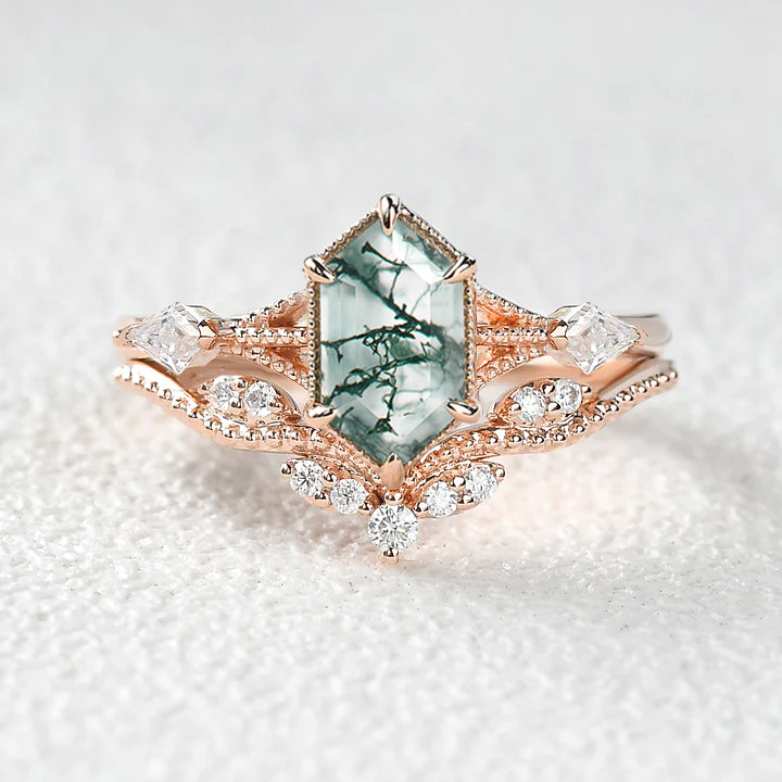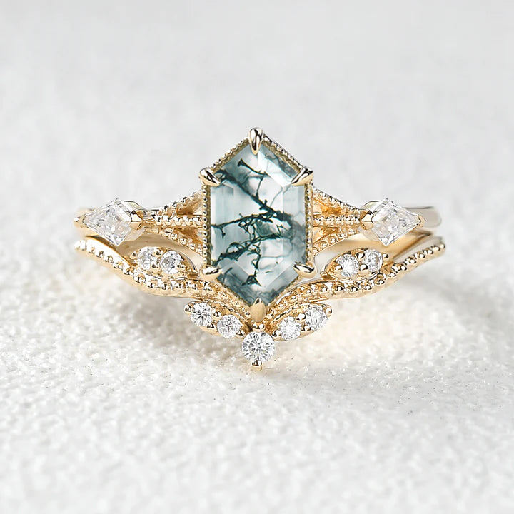Vintage Long Hexagon Moss Agate Engagement Ring Set 2pcs