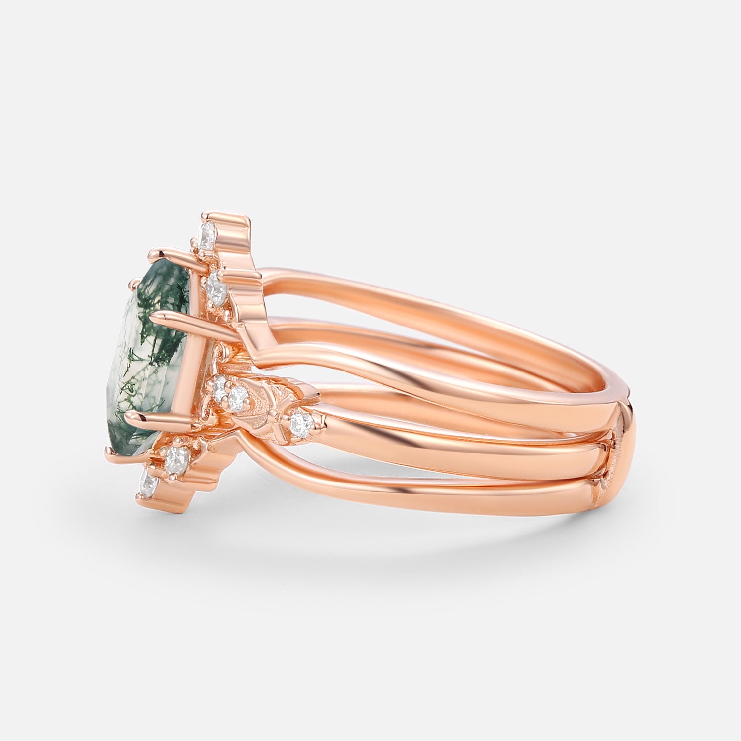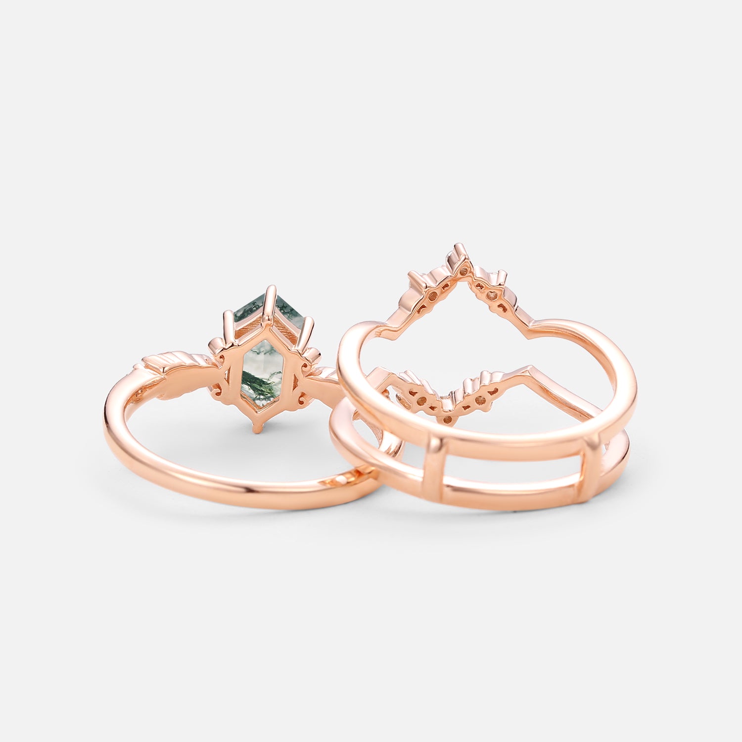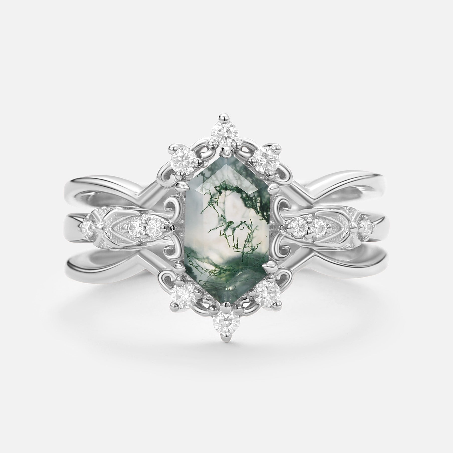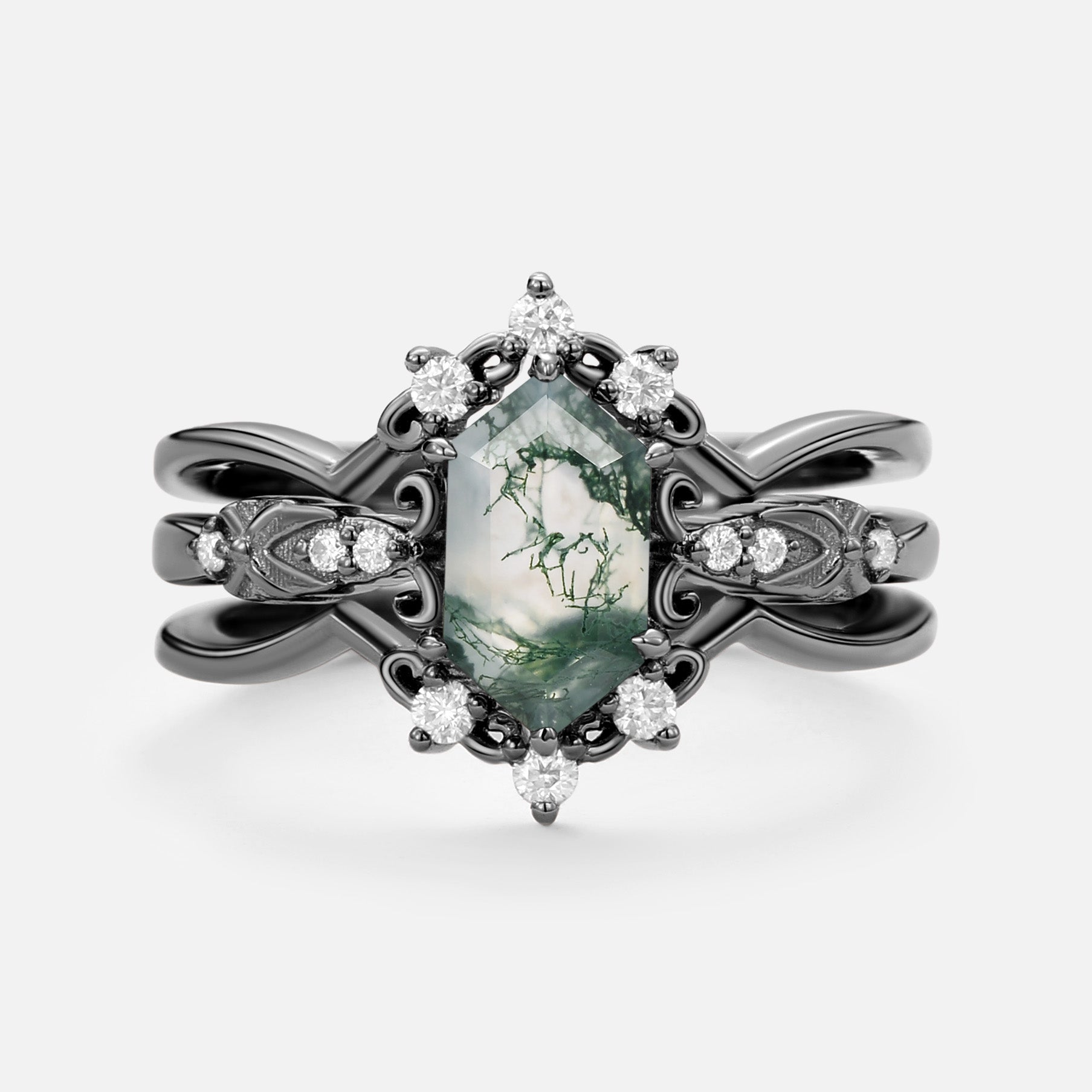 Vintage Long Hexagon Moss Agate Moissanite Ring Set 2pcs