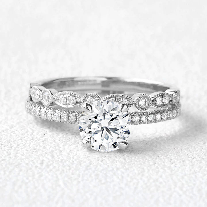 Felicegals Round Lab Grown Diamond Classic 4-Prong Solitaire Ring Sets 2PCS Wedding Ring White Gold Four Prongs Lab Diamond