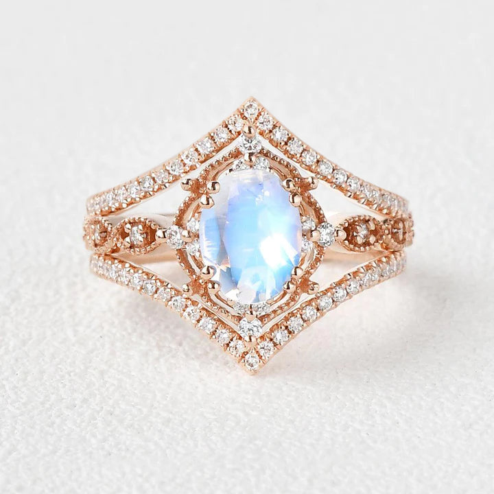 Felicegals Moonstone & Moissanite Engagement Ring Set 3pcs Antique Oval Vine Vintage Inspired Wedding Ring Moissanite V Shaped Wedding Band Anniversary Gift for Her