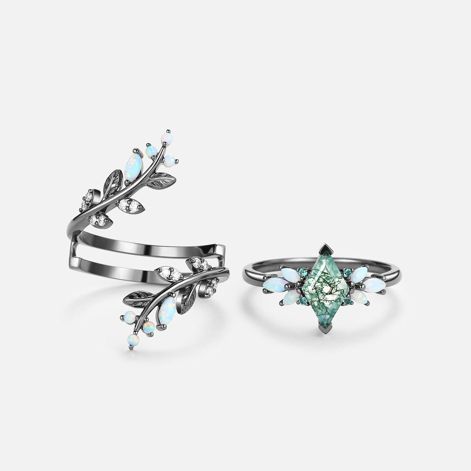 Black Gold Moss Agate & Opal & Emerald Cage Leafy Engagement Ring 2pcs - Knight