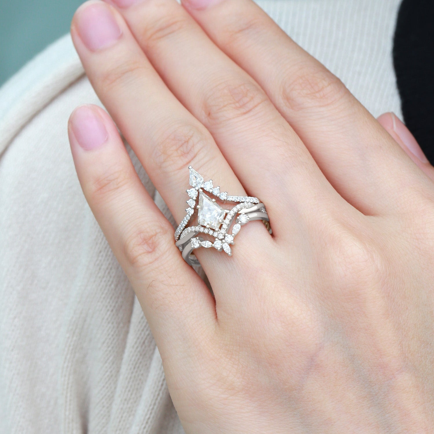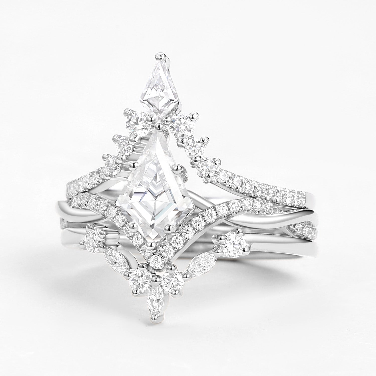 Kite Cut White Gold Moissanite Luxurious Engagement Bridal Set 3pcs