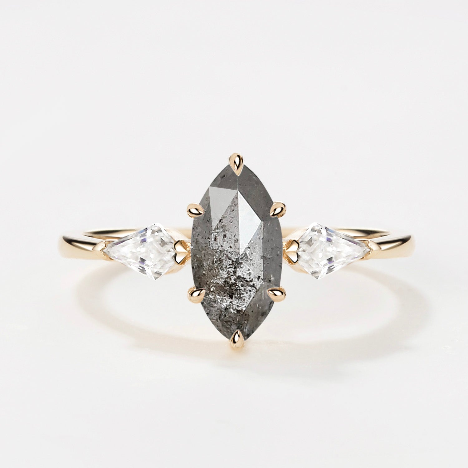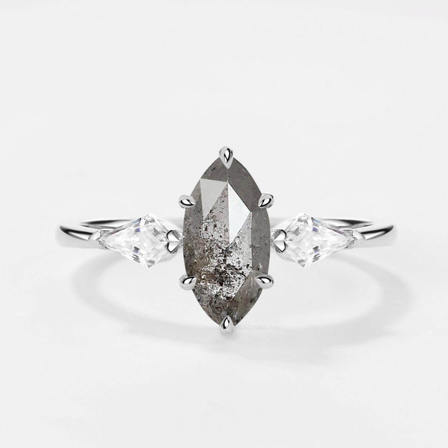 Marquise Cut Salt and Pepper Diamond Three-stone Engagement Ring