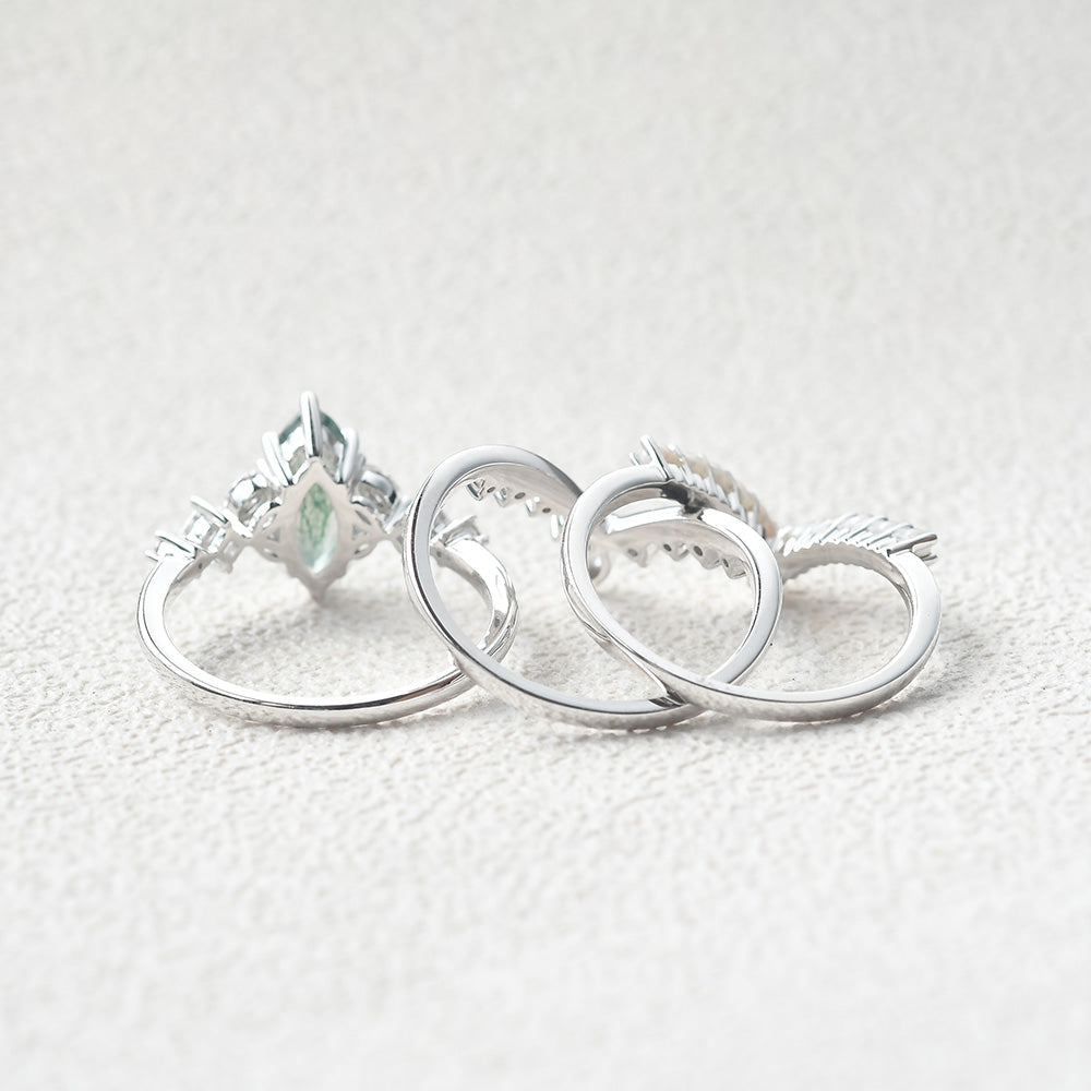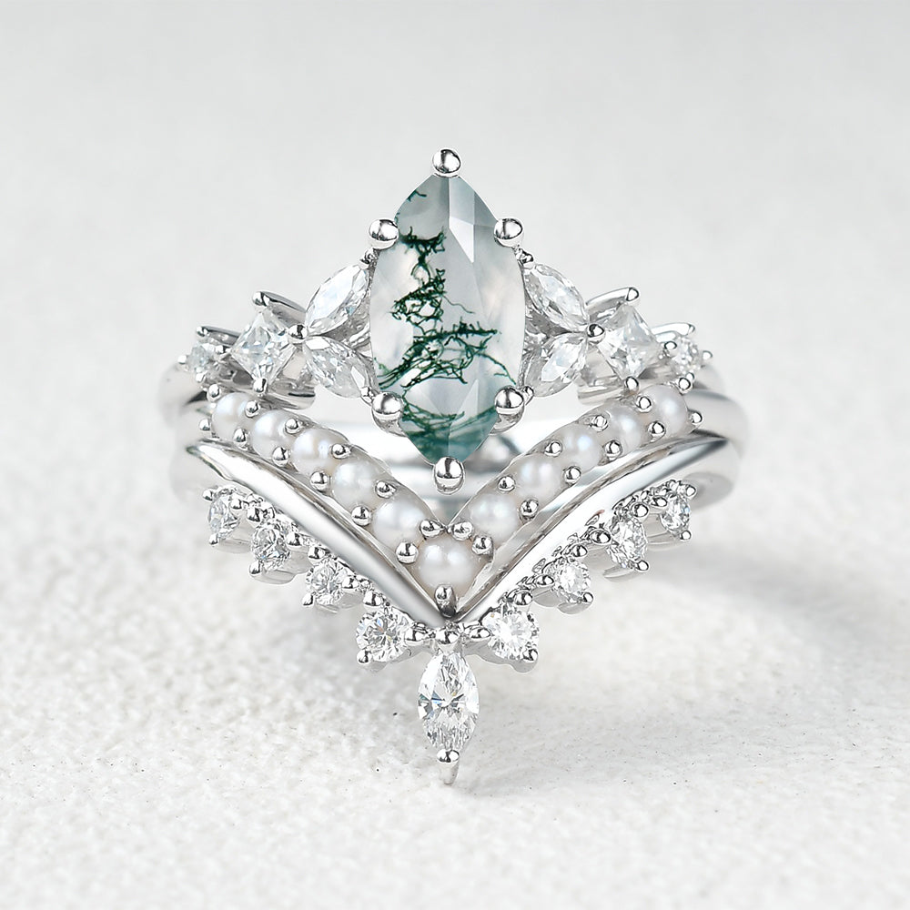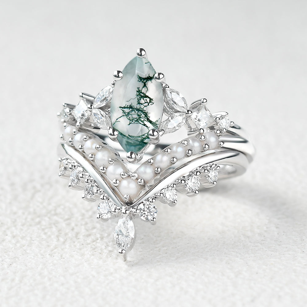 Marquise Moss Agate Pearl-fect Engagement Ring Set 3pcs
