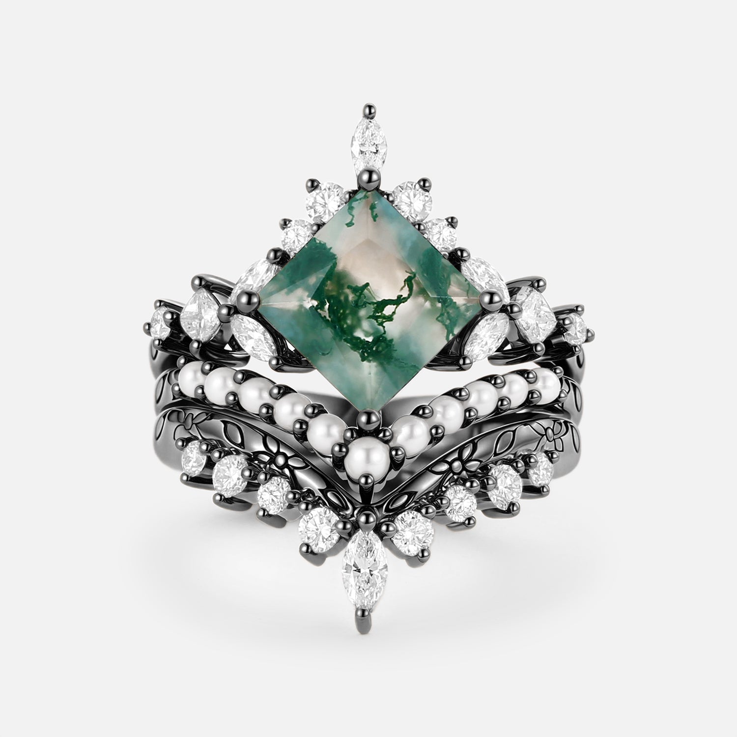 Moss Agate Engraved Princess Cut Cluster Engagement Ring Set 3pcs - Agnes