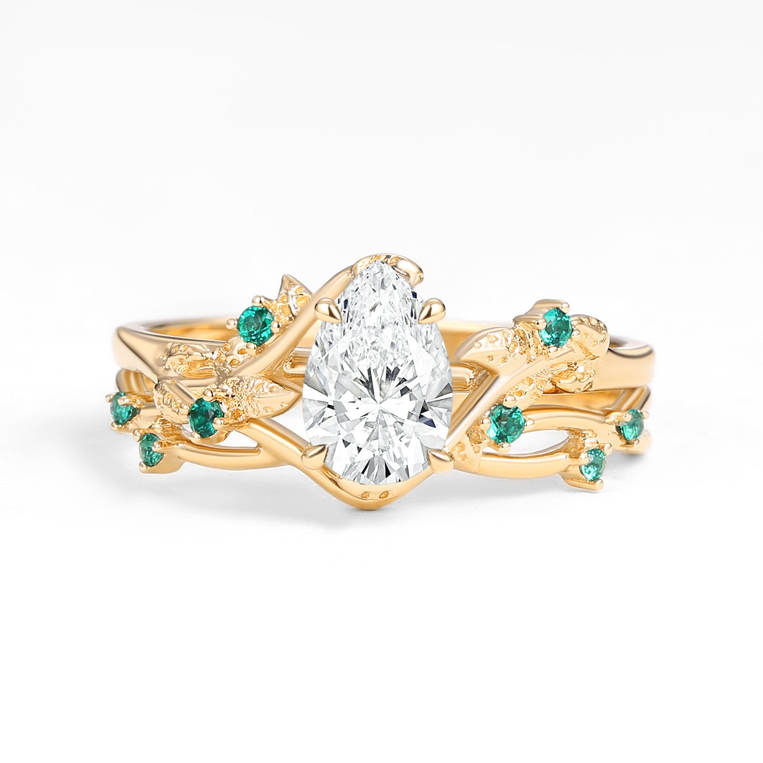 Nature Inspired - Pear Shaped Lab Grown Diamond & Lab Emerald Ring Set 2pcs - Mossy