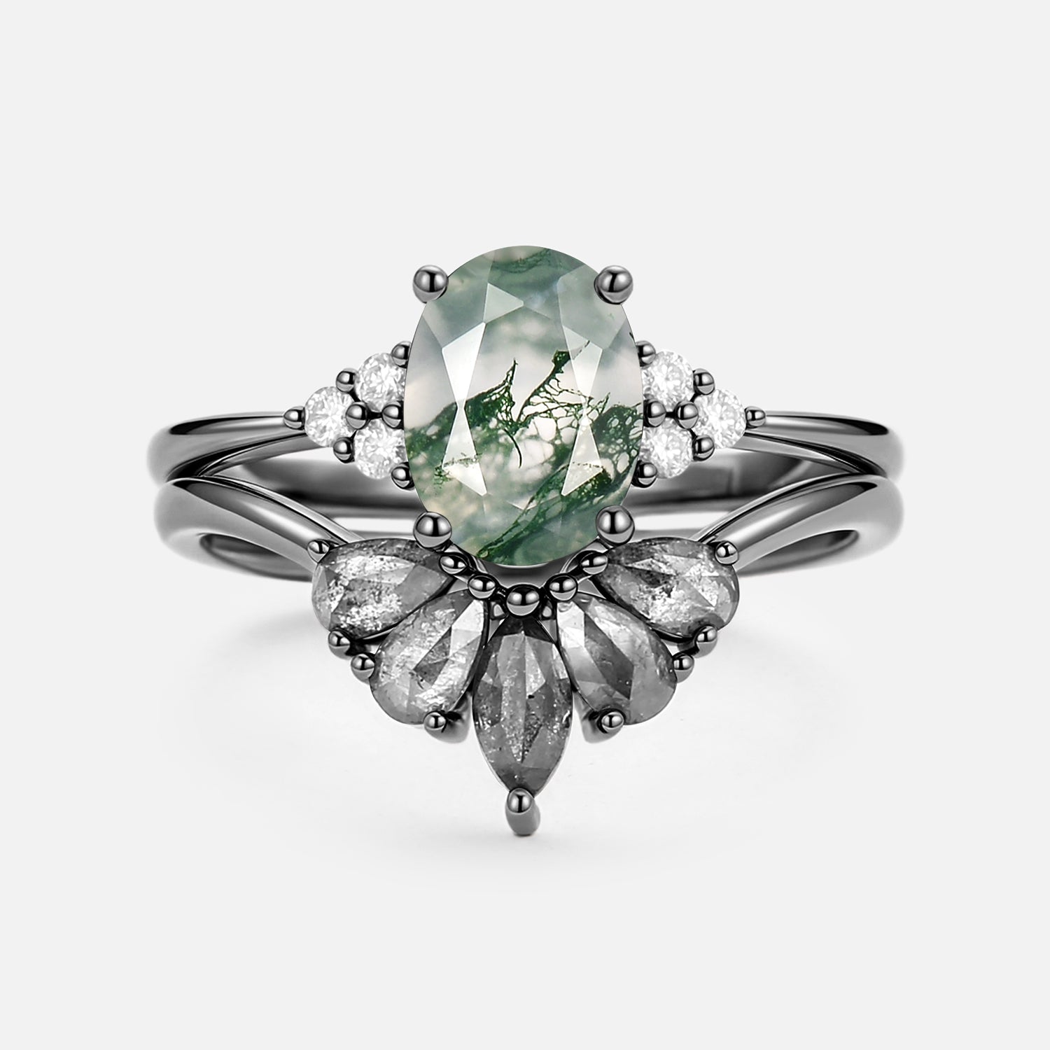 Oval Cut Moss Agate & Salt and Pepper Diamond Ring Set 2pcs - Terra