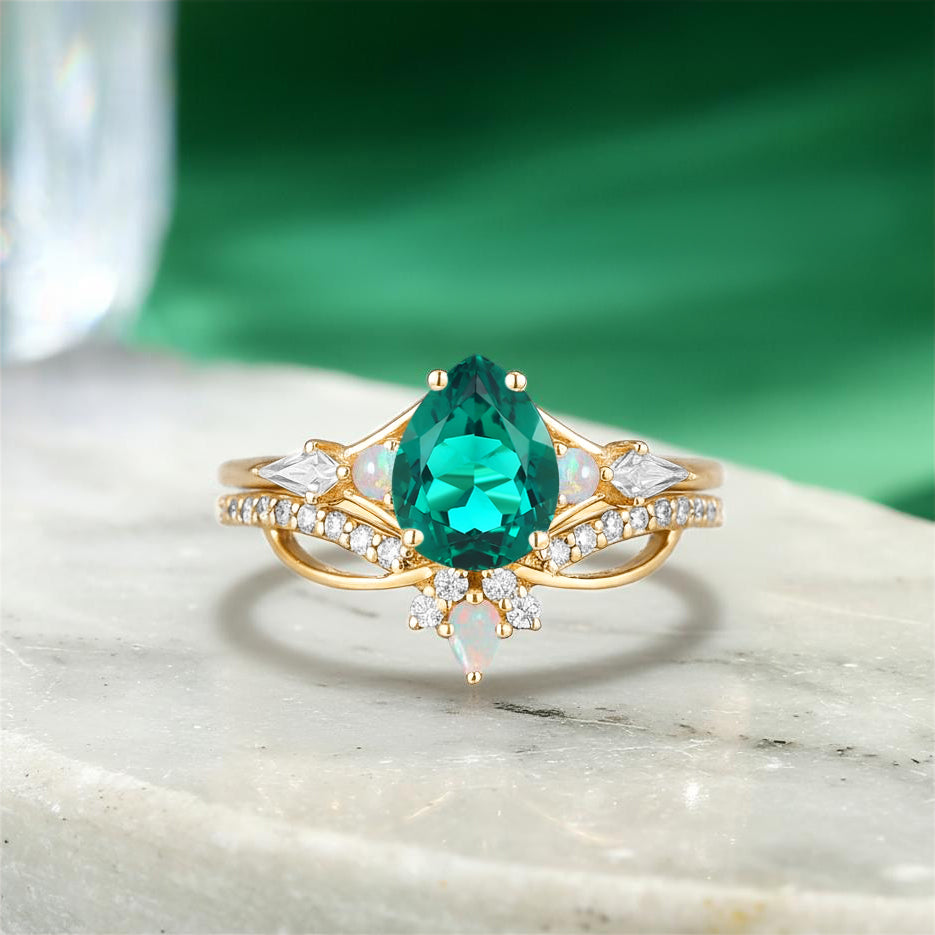 Pear Cut Lab Emerald Engagement Ring Set 2pcs - Elise