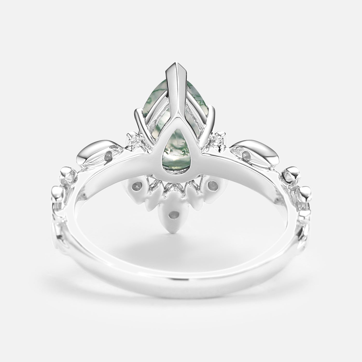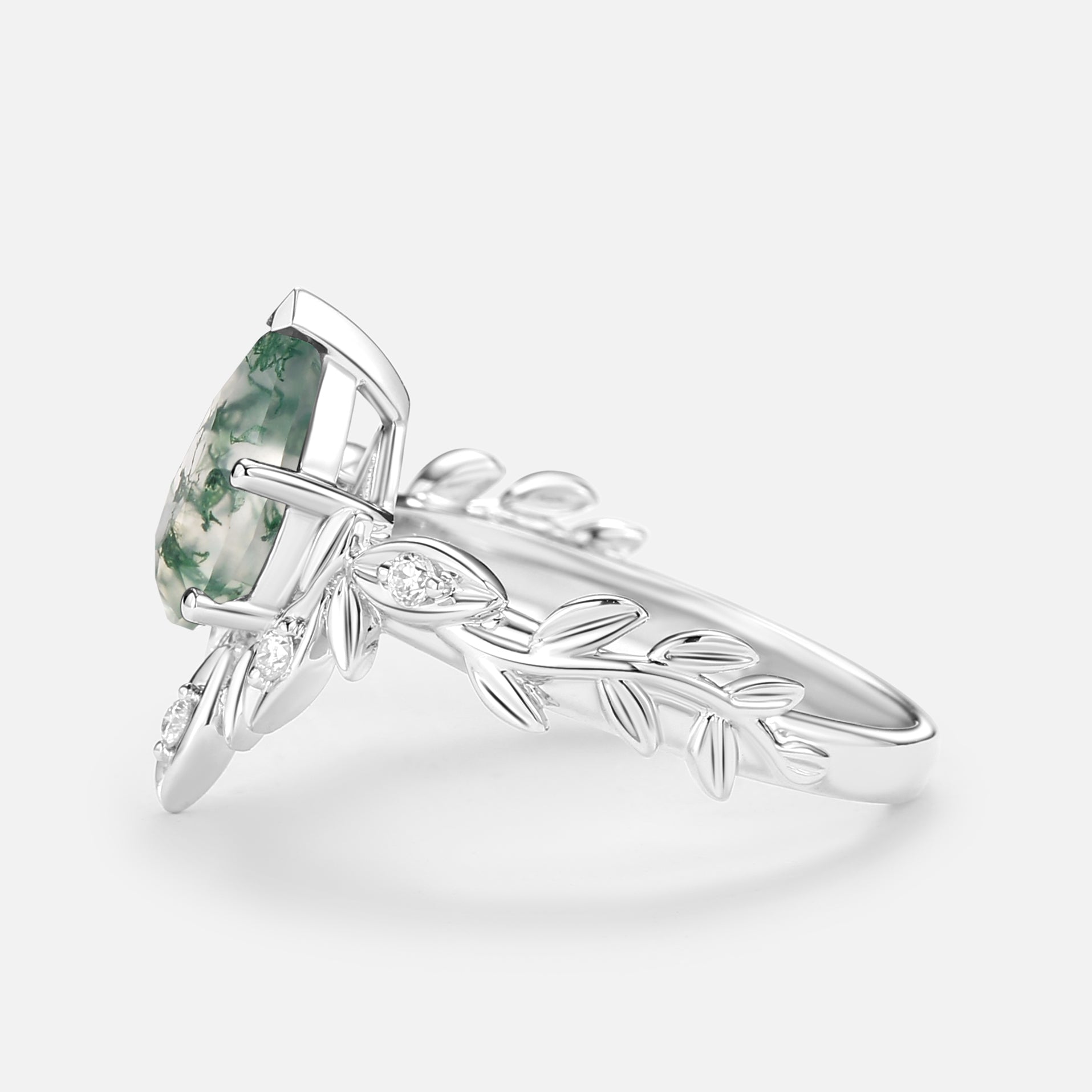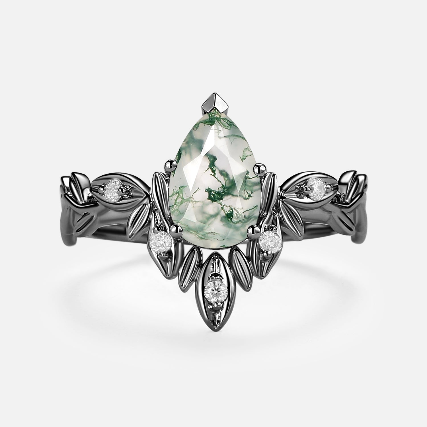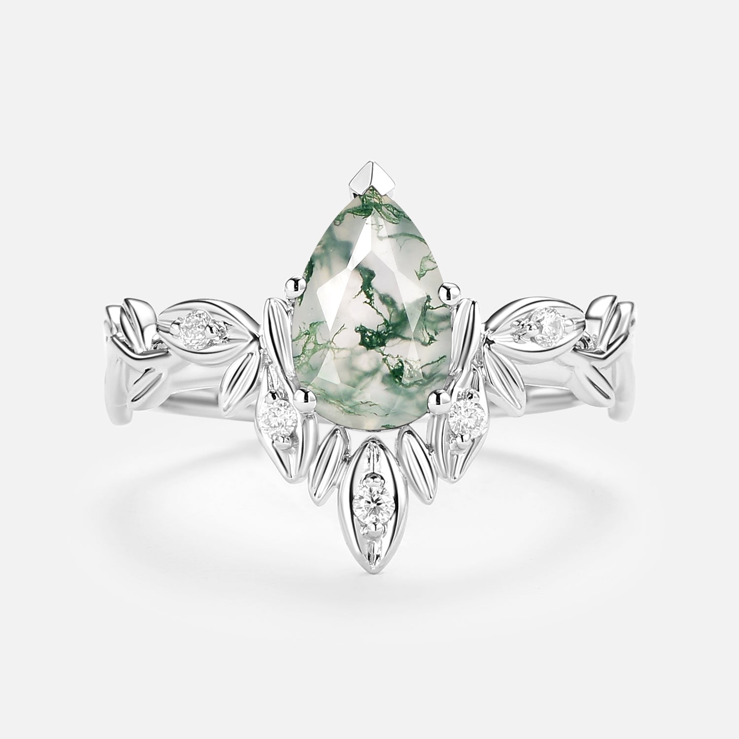 Pear Cut Leafy Nature Inspired Moss Agate Engagement Ring
