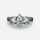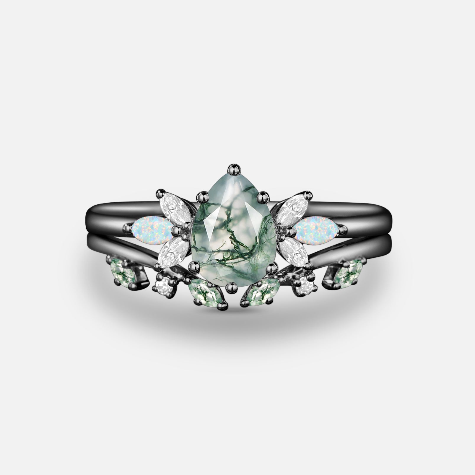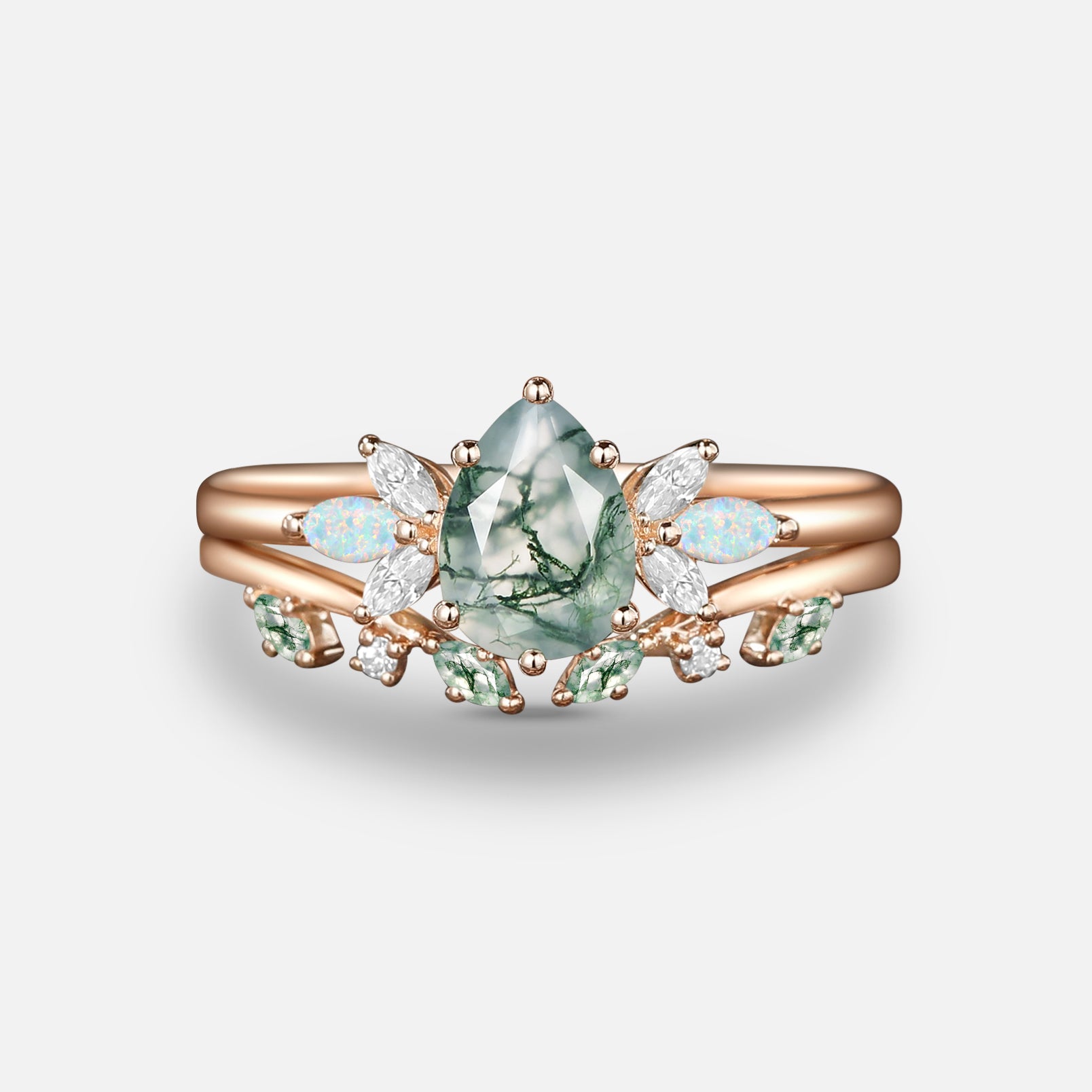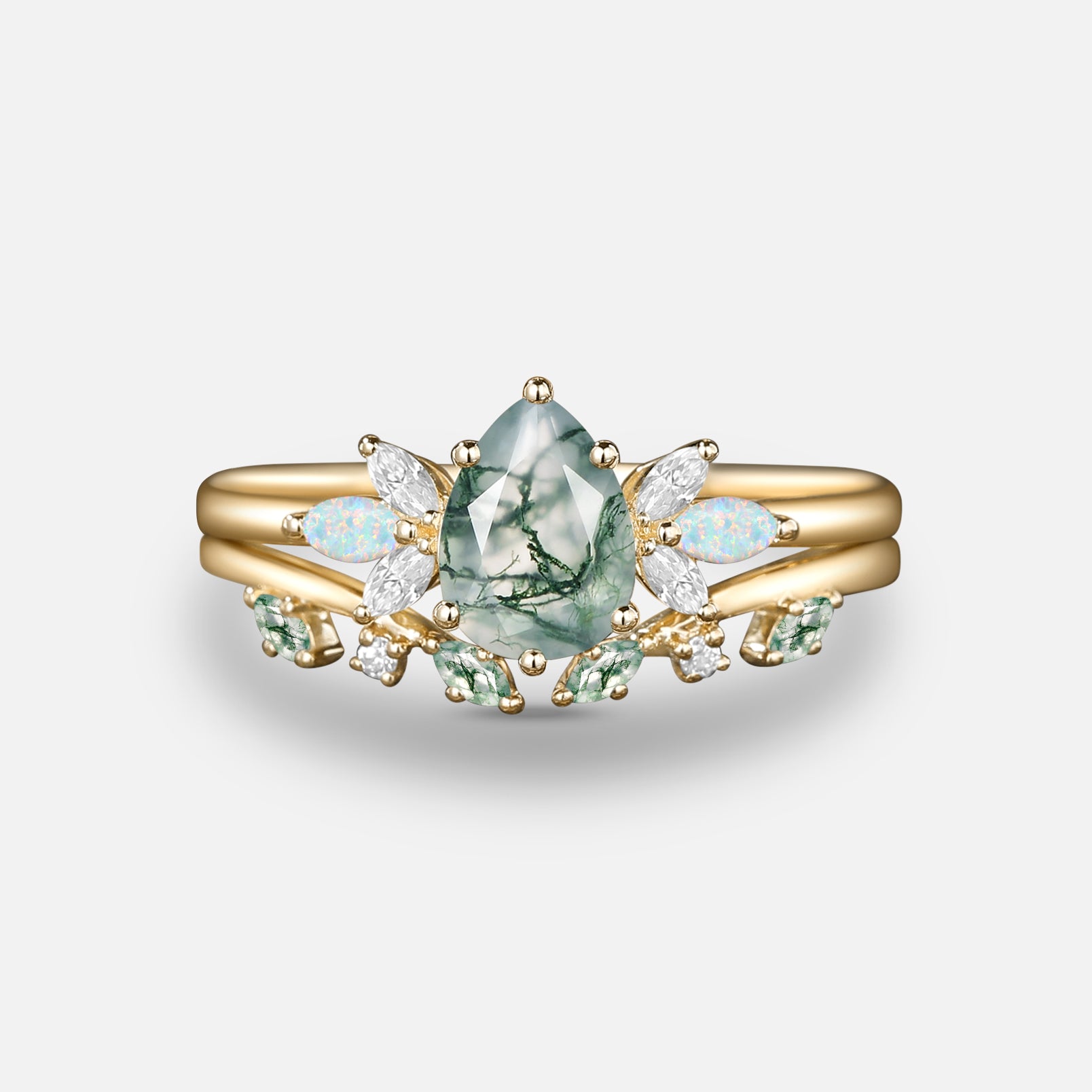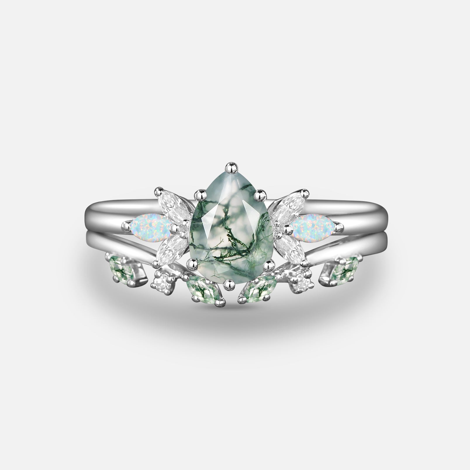 Pear Cut Moss Agate Engagement Ring Set 2pcs - Aster