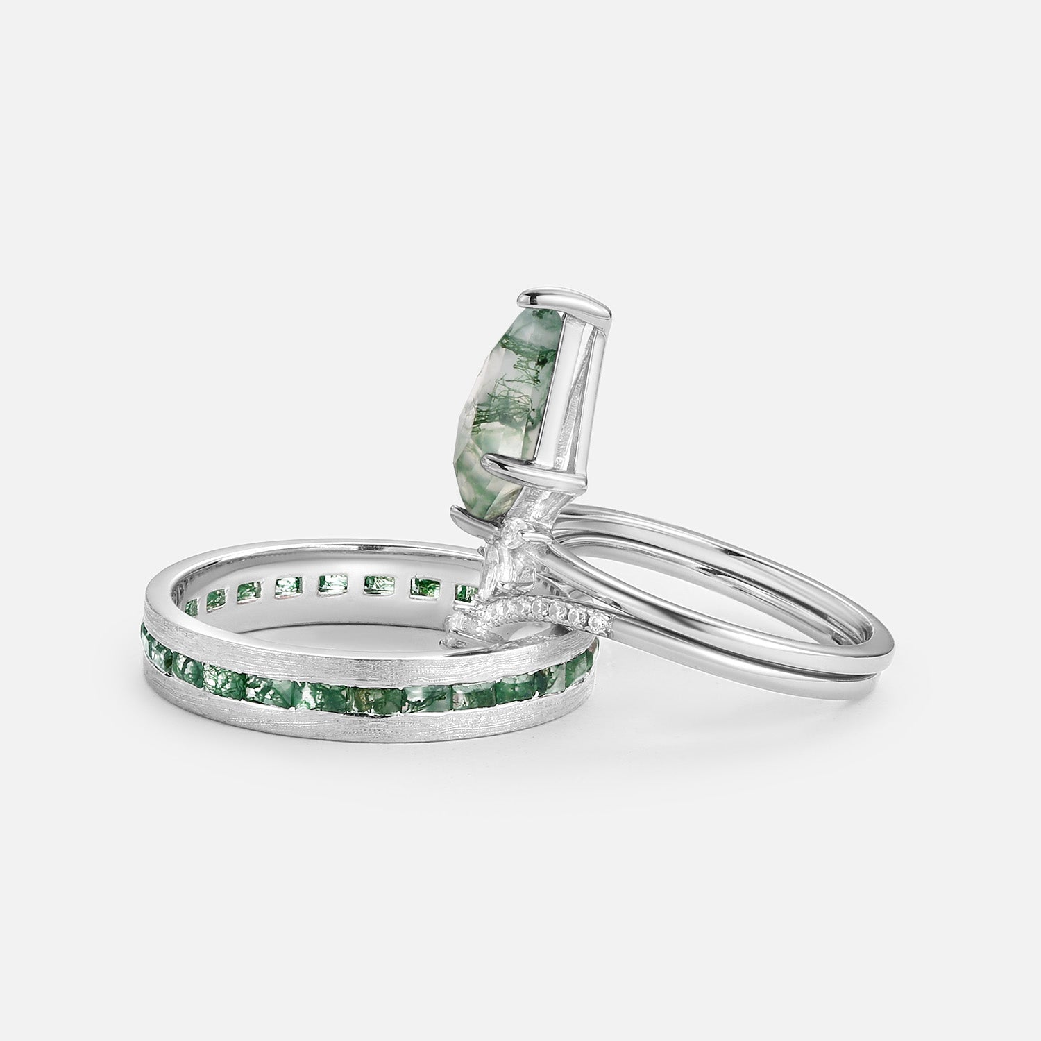 Each unique Moss Agate stone is reminiscent of a misty forest, with green, branch-like inclusions creating captivating visual appeal. Click to see more unique moss agate rings.