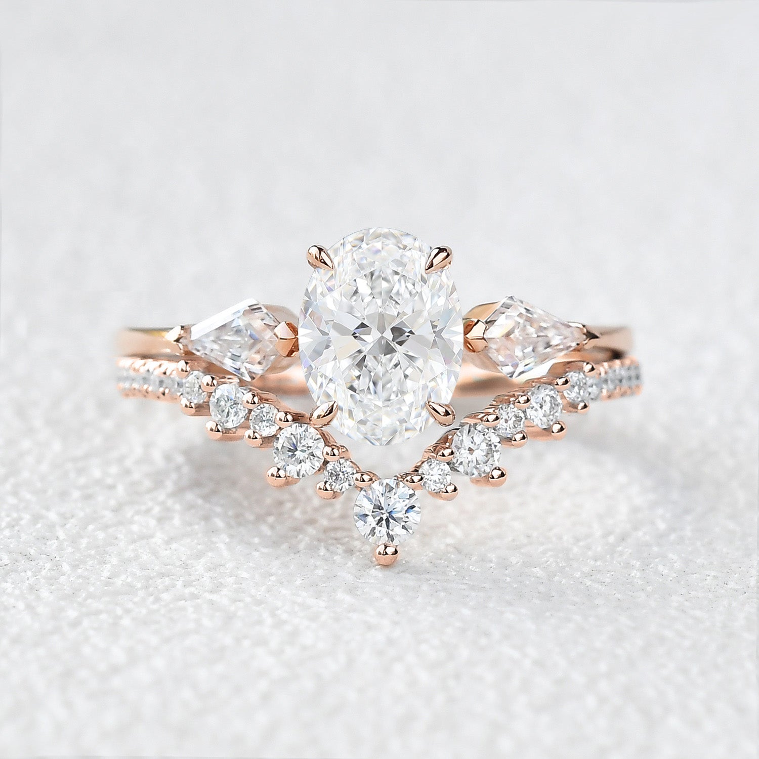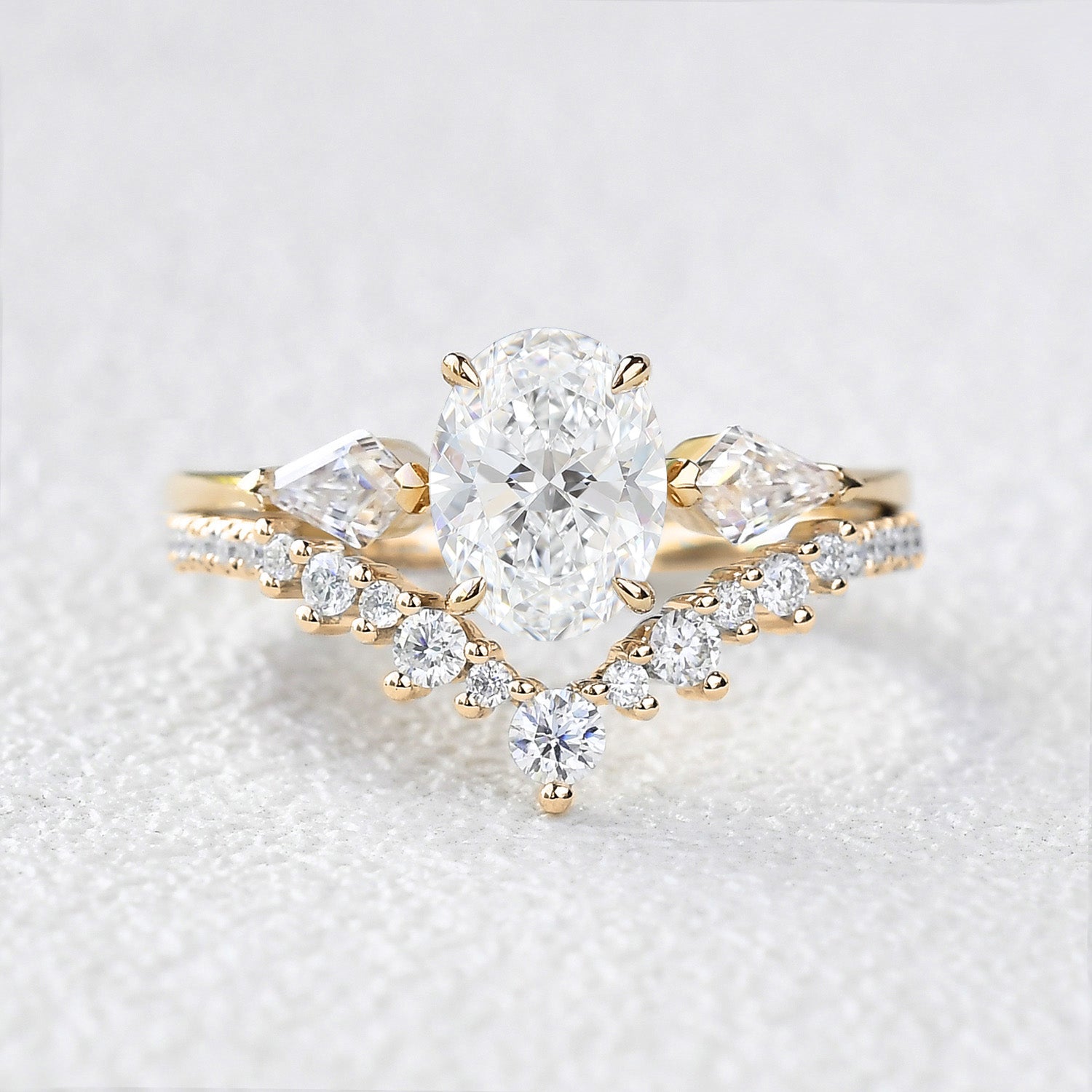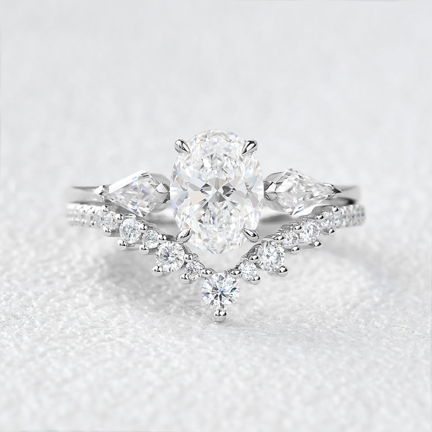Felicegals Classic 1.0-2.0 Oval Cut Lab Grown Diamond Three Stone Ring Set 2pcs Lab Diamond Ring 0.43ct Lab Diamond Accents Ring Set 2 pcs Gift for Her Anniversary Gift